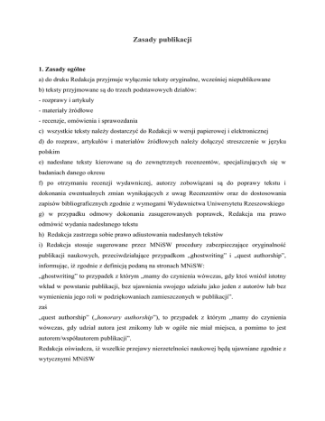 Zasady publikacji 1. Zasady ogólne a) do druku Redakcja przyjmuje wyłącznie teksty oryginalne, wcześniej niepublikowane b) teksty przyjmowane są do trzech podstawowych działów: - rozprawy i artykuły - materiały źródłowe - recenzje, omówienia i sprawozdania c) wszystkie teksty należy dostarczyć do Redakcji w wersji papierowej i elektronicznej d) do rozpraw, artykułów i materiałów źródłowych należy dołączyć streszczenie w języku polskim e) nadesłane teksty kierowane są do zewnętrznych recenzentów, specjalizujących się w badaniach danego okresu f) po otrzymaniu recenzji wydawniczej, autorzy zobowiązani są do poprawy tekstu i dokonania ewentualnych zmian wynikających z uwag Recenzentów oraz do dostosowania zapisów bibliograficznych zgodnie z wymogami Wydawnictwa Uniwersytetu Rzeszowskiego g) w przypadku odmowy dokonania zasugerowanych poprawek, Redakcja ma prawo odmówić wydania nadesłanego tekstu h) Redakcja zastrzega sobie prawo adiustowania nadesłanych tekstów i) Redakcja stosuje sugerowane przez MNiSW procedury zabezpieczające oryginalność publikacji naukowych, przeciwdziałające przypadkom „ghostwriting” i „quest authorship”, informując, iż zgodnie z definicją podaną na stronach MNiSW: „ghostwriting” to przypadek z którym „mamy do czynienia wówczas, gdy ktoś wniósł istotny wkład w powstanie publikacji, bez ujawnienia swojego udziału jako jeden z autorów lub bez wymienienia jego roli w podziękowaniach zamieszczonych w publikacji”. zaś „quest authorship” („honorary authorship”), to przypadek z którym „mamy do czynienia wówczas, gdy udział autora jest znikomy lub w ogóle nie miał miejsca, a pomimo to jest autorem/współautorem publikacji”. Redakcja oświadcza, iż wszelkie przejawy nierzetelności naukowej będą ujawniane zgodnie z wytycznymi MNiSW 2. Wygląd tekstu nadsyłanego do Redakcji: a) na początku pierwszej strony przesłanego tekstu należy umieścić: – w przypadku rozprawy, artykułu i materiałów źródłowych w lewym górnym rogu imię i nazwisko autora – w przypadku recenzji informację bibliograficzną dotyczącą recenzowanej książki (pełne imię i nazwisko autora, tytuł zgodnie z zapisem na stronie tytułowej, miejsce i rok wydania); imię i nazwisko autora recenzji prosimy umieścić pod jej treścią - w przypadku omówień i sprawozdań informację dotyczącą opisywanego wydarzenia; imię i nazwisko autora recenzji prosimy umieścić pod jej treścią b) teksty należy przesyłać na adres Redakcji w wersji papierowej i elektronicznej, w pliku tekstowym (.doc, .docx, .rtf) c) objętość rozprawy, artykułu lub wydawnictwa źródłowego nie powinna przekraczać 1,5 arkusza wydawniczego (ok. 60 000 znaków ze spacjami), recenzji, omówień lub sprawozdań – do 0,5 arkusza wydawniczego (ok. 20 000 znaków ze spacjami) d) przy wszystkich załączonych ilustracjach należy podać imię i nazwisko autora, źródło, z którego pochodzą oraz pełną nazwę instytucji (wraz z adresem), która udostępniła prawa autorskie e) objętość streszczenia w języku polskim nie powinno przekraczać 2000 znaków ze spacjami f) rozprawy, artykuły i materiały źródłowe przeznaczone do publikacji w języku innym niż polski, muszą być zaopatrzone w obszerne streszczenie w języku polskim, min. 4000 znaków ze spacjami g) do przesłanego materiału należy dołączyć informację zawierającą: aktualny adres do korespondencji, numer telefonu, adres poczty elektronicznej, nazwę i adres uczelni macierzystej 3. Wymagania techniczne Ogólne wymagania techniczne – wydruk komputerowy powinien być jednostronny na białym papierze formatu A4: – margines lewy 3 cm, bez równania do prawej strony; – tekst główny czcionka Times New Roman 12 punktów; przypisy czcionka Times New Roman 10 punktów; – interlinia 1,5 wiersza – numerowanie stron wedle domyślnego ustawienia edytora w obrębie całej pracy; – wyraźne zaznaczenie stopni podrzędności tytułów, podtytułów – zaznaczenie wcięcia pierwszego wiersza kolejnych akapitów; – dokładne zaznaczenie innych wyróżnień, np. kursywy i pogrubienia (bold); – materiał graficzny (ilustracyjny) powinien być dołączony na oddzielnych stronach, z zaznaczeniem w tekście miejsca, w którym należy go umieścić (inf. odręczna na marginesie) 4. Aparat naukowy Tekst główny i przypisy należy przygotować według instrukcji znajdującej się na stronie Wydawnictwa Uniwersytetu Rzeszowskiego, zakładka Dla Autorów / Wskazówki merytoryczne dla autorów W nadsyłanych tekstach Autorzy proszeni są dodatkowo o stosowanie skrótów według niniejszego wykazu: AGAD - Archiwum Główne Akt Dawnych w Warszawie AGZ - Akta grodzkie i ziemskie z czasów Rzeczypospolitej Polskiej z Archiwum tzw. Bernardyńskiego we Lwowie. T. 1-25. Wyd. O. Pietruski, X. Liske, A. Prochaska. Lwów 1868-1935 AKH - „Archiwum Komisji Historycznej [Polskiej] Akademii Umiejętności” AKP - „Archiwum Komisji Prawniczej [Polskiej] Akademii Umiejętności” AP - Archiwum Państwowe (z podaniem miasta) BCzart - Biblioteka Czartoryskich w Krakowie BJ - Biblioteka Jagiellońska w Krakowie BN – Biblioteka Narodowa w Warszawie BOssol. – Biblioteka Zakładu Narodowego im. Ossolińskich we Wrocławiu BPAN - Biblioteka PAN (z podaniem miasta) CP-H - „Czasopismo Prawno-Historyczne” KHKM – „Kwartalnik Historii Kultury Materialnej” KH – „Kwartalnik Historyczny” KZSP - Katalog zabytków sztuki w Polsce MH – „Miesięcznik Heraldyczny” MK - Metryka Koronna w AGAD MPH - Monumenta Poloniae Historica. T. 1-6. Lwów 1864-Kraków 1893 MPHn - Monumenta Poloniae Historic. Nova series. T. I-XIV. Warszawa 1946-2008 MPV - Monumenta Poloniae Vaticana. T. 1-6. Wyd. J. Ptaśnik. T. VIII. Wyd. E. Długopolski. T. IX. Wyd. S. Szczur; T. 10. Wyd. M.D. Kowalski. Kraków 1913-2002. MRPS - Matricularum Regni Poloniae Summaria. T. 1-4, 5/1. Wyd. T. W