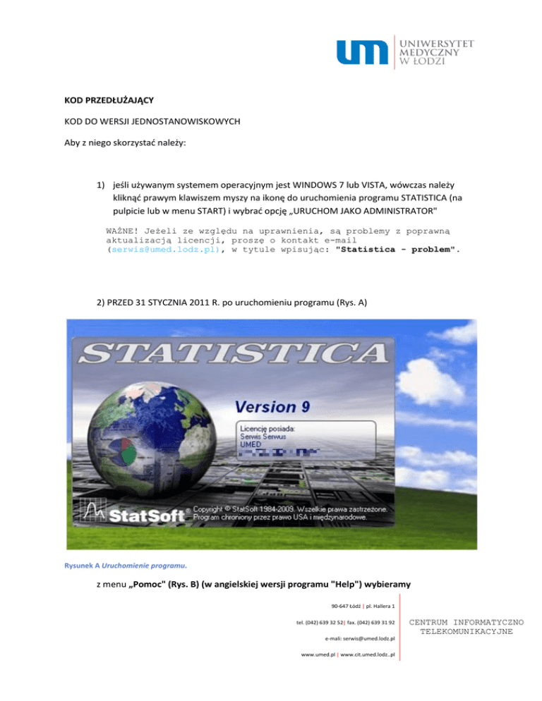 KOD PRZEDŁUŻAJĄCY KOD DO WERSJI JEDNOSTANOWISKOWYCH Aby z niego skorzystad należy: 1) jeśli używanym systemem operacyjnym jest WINDOWS 7 lub VISTA, wówczas należy kliknąd prawym klawiszem myszy na ikonę do uruchomienia programu STATISTICA (na pulpicie lub w menu START) i wybrad opcję „URUCHOM JAKO ADMINISTRATOR" WAŻNE! Jeżeli ze względu na uprawnienia, są problemy z poprawną aktualizacją licencji, proszę o kontakt e-mail ([email protected]), w tytule wpisując: "Statistica - problem". 2) PRZED 31 STYCZNIA 2011 R. po uruchomieniu programu (Rys. A) Rysunek A Uruchomienie programu. z menu „Pomoc" (Rys. B) (w angielskiej wersji programu "Help") wybieramy 90-647 Łódź | pl. Hallera 1 tel. (042) 639 32 52| fax. (042) 639 31 92 e-mali: [email protected] www.umed.pl | www.cit.umed.lodz..pl CENTRUM INFORMATYCZNO TELEKOMUNIKACYJNE Rysunek B Menu “Pomoc”. „STATISTICA-informacje" (Rys. C) („About STATISTICA"). Rysunek C Opcja „STATISTICA-informacje”. 90-647 Łódź | pl. Hallera 1 tel. (042) 639 32 52| fax. (042) 639 31 92 e-mali: [email protected] www.umed.pl | www.cit.umed.lodz..pl CENTRUM INFORMATYCZNO TELEKOMUNIKACYJNE W nowo przywołanym oknie klikamy przycisk „Zarządzanie licencjami" (Rys. D) („License Management"). Rysunek D "Zarządzanie licencjami". Następnie klikamy przycisk „Kod" („Enter Code"). (Rys. E) Rysunek E Naciskamy przycisk „Kod”. 90-647 Łódź | pl. Hallera 1 tel. (042) 639 32 52| fax. (042) 639 31 92 e-mali: [email protected] www.umed.pl | www.cit.umed.lodz..pl CENTRUM INFORMATYCZNO TELEKOMUNIKACYJNE W polu „Proszę podad kod aktualizujący licencję" wpisujemy odpowiedni kod (Feature Code). (Rys.F) Rysunek F Wpisujemy KOD aktualizacyjny. Klikamy przycisk „OK". Zostanie wyświetlona informacja o zaktualizowaniu licencji. (Rys. G) Rysunek G Procedura zakooczona sukcesem. 90-647 Łódź | pl. Hallera 1 tel. (042) 639 32 52| fax. (042) 639 31 92 e-mali: [email protected] www.umed.pl | www.cit.umed.lodz..pl CENTRUM INFORMATYCZNO TELEKOMUNIKACYJNE 3) PO 31 STYCZNIA 2011 R. (gdy licencja na aktualnie zainstalowane programy wygaśnie), wówczas w oknie które się pojawia przy próbie uruchomienia programu należy kliknąd przycisk „Więcej", po czym należy w nowo przywołanym oknie wpisad powyższy kod. UWAGA! Powyższy kod przedłuży działanie zainstalowanych i zarejestrowanych wersji jednostanowiskowych do 31 STYCZNIA 2012 R., ale należy go użyd PRZED 15 LUTEGO 2011 R. PO TYM TERMINIE NIE BĘDZIE MOŻLIWE UŻYCIE KODU PRZEDŁUŻAJĄCEGO I KONIECZNA BĘDZIE PONOWNA INSTALACJA NAJNOWSZEGO OPROGRAMOWANIA (DO POBRANIA Z Centralnego Serwisu i Magazynu IT). 90-647 Łódź | pl. Hallera 1 tel. (042) 639 32 52| fax. (042) 639 31 92 e-mali: [email protected] www.umed.pl | www.cit.umed.lodz..pl CENTRUM INFORMATYCZNO TELEKOMUNIKACYJNE