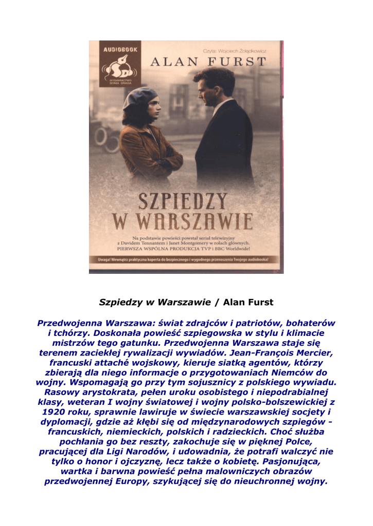 Szpiedzy w Warszawie / Alan Furst Przedwojenna Warszawa: świat zdrajców i patriotów, bohaterów i tchórzy. Doskonała powieść szpiegowska w stylu i klimacie mistrzów tego gatunku. Przedwojenna Warszawa staje się terenem zaciekłej rywalizacji wywiadów. Jean-François Mercier, francuski attaché wojskowy, kieruje siatką agentów, którzy zbierają dla niego informacje o przygotowaniach Niemców do wojny. Wspomagają go przy tym sojusznicy z polskiego wywiadu. Rasowy arystokrata, pełen uroku osobistego i niepodrabialnej klasy, weteran I wojny światowej i wojny polsko-bolszewickiej z 1920 roku, sprawnie lawiruje w świecie warszawskiej socjety i dyplomacji, gdzie aż kłębi się od międzynarodowych szpiegów francuskich, niemieckich, polskich i radzieckich. Choć służba pochłania go bez reszty, zakochuje się w pięknej Polce, pracującej dla Ligi Narodów, i udowadnia, że potrafi walczyć nie tylko o honor i ojczyznę, lecz także o kobietę. Pasjonująca, wartka i barwna powieść pełna malowniczych obrazów przedwojennej Europy, szykującej się do nieuchronnej wojny.