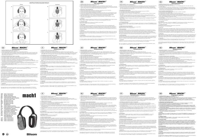 GB INSTRUCTIONS BILSOM MACH1 Fitting Important A. D. 1. 1. 2. 3. Bilsom ® MACH1™ User instruction INSTRUCTIONS FOR USE (according to picture A-F) Place the earcups over the outer ear (picture A). Adjust the headband by sliding the headband up or down at the attachment points (picture B). The ear cushions should seal firmly against the head (picture C-D). For best results, remove all hair under the cushion. Noise reduction will be adverserly effected by anything that impairs the seal of the earmuff cushions against the head, such as thick spectacle frames, balaclavas, etc. (picture E-F). 2. 1. 2. 3. 4. 5. IMPORTANT USER INFORMATION The earmuffs should be fitted, adjusted and maintained in accordance with the instructions. The earmuffs should be worn at all times in noisy surroundings. The earmuffs should be regularly inspected for serviceability. The earmuffs should be cleaned and disinfected with soap and warm water. They may not be dipped into water. Earmuffs and in particular cushions may deteriorate with use and should be examined at frequent intervals for cracking and leakage, for example, and should be discarded in case cracking or leakage is found. 6. The fitting of hygiene covers to the cushions may affect the acoustic performance of the ear-muffs. 7. Before and after use, store in a dry, cool place. The temperature should not exceed +55°C. 8. This product may be adversely affected by certain chemical substances. Further information should be sought from the manufacturer. B. 3. APPROVAL Bilsom MACH1 is tested and approved in accordance with the PPE directive 89/686/EEC and European Standard EN 352-1:2002 at INSPEC, Salford, M6 6AJ, UK, (UKAS Accredited Testlaboratory, No. 0316). E. 4. TECHNICAL DATA Over-the-head headband earmuff. Material of headband: Acetal (POM) Material of ear cushion: PVC and polyurethane 5. DISCLAIMER If the above-mentioned recommendations are not followed, the protection and function afforded by the earmuffs may be severely impaired. This may cause consequences for the user for which Bacou-Dalloz can not be held responsible. Bacou-Dalloz can not guarantee that any type of warning signals incl. communication with other people in the surroundings can be heard and understood by the wearer of this hearing protector. The sound level and the frequency content of the warning signals as well as of the background noise can vary in different situations. C. 6. WARNING All hearing protection affords limited protection. The user is responsible for the proper selection, use, care and maintenance of this device. Improper selection (including under/over protection), use or maintenance may lead to serious hearing loss. If there are any questions concerning this product contact your safety supervisor or Bacou-Dalloz. F. 7. GUARANTEE There is a one year guarantee against defects in material and workmanship. The guarantee does not cover damage caused by misuse, abuse or unauthorised modifications. For further information please contact Bacou-Dalloz, Strandbadsvägen 15, SE-252 29 HELSINGBORG, Sweden. Tel. +46 42 88100, fax +46 42 73822 or any of the other addresses shown. FR Bilsom ® MACH1™ Mode d’emploi 1. 1. 2. 3. MODE D’EMPLOI (selon les figures A-F) Placez les écouteurs sur vos oreilles (figure A). Réglez le serre-tête en le faisant glisser vers le haut ou vers le bas au niveau des points de fixation (figure B). Les coussinets doivent être pressés fermement contre votre tête (figure C-D). Pour un résultat optimal, repoussez vos cheveux afin qu’ils ne soient pas sous les coussinets. Tout objet réduisant l’étanchéité des coussinets des écouteurs contre votre tête – par exemple épaisses montures de lunettes, passemontagnes, etc. - nuit à la réduction sonore (figures E-F). 2. 1. 2. 3. 4. INFORMATION IMPORTANTE Le serre-tête doit être positionné, ajusté et entretenu selon les instructions d’utilisation. Le serre-tête doit être porté en permanence en milieu bruyant. Le serre-tête doit être contrôlé et entretenu régulièrement. Les coquilles doivent être nettoyées et désinfectées avec de l’eau chaude et du savon. Ne pas le tremper dans l’eau. Les coquilles et plus particulièrement les coussinets peuvent s’abîmer à l’usage et doivent donc être inspectés à intervalles réguliers afin de permettre la détection, par exemple, de débuts de fissures ou de fuites afin d’être mis au rebut et remplacés si ces anomalies sont détectées. L’utilisation de collerettes de propreté sur les coussinets peut avoir une incidence sur les performances acoustiques des coquilles. Avant et après l’utilisation, entreposez le serre-tête dans un endroit sec et frais. La température ne doit pas dépasser +55°C. Ce produit peut être endommagé par certaines substances chimiques. Pour de plus amples informations à ce sujet, contactez le fabricant. 5. 6. 7. 8. 3. N° D’HOMOLOGATION Les serre-tête Bilsom MACH1 sont testés et homologués conformément à la directive PPE 89/686/EEC et de la Norme Européenne EN 352-1:2002, a le bureau INSPEC, Salford, M6 6AJ, UK, (UKAS Accredited Testlaboratory, No 0316). 4. CARACTÉRISTIQUES TECHNIQUES Serre-tête (porté sur la tête). Matériau de l’arceau: Acétal (POM) Matériau du coussinet: PVC et polyuréthanne. 5. RÉCLAMATIONS Si les recommandations ci-dessus ne sont pas respectées, l’effet protecteur et le fonctionnement du serretête peuvent être sérieusement diminués. Ceci peut avoir des conséquences pour l’utilisateur pour lesquelles Bacou-Dalloz ne pourra pas être tenu responsable. Bacou-Dalloz ne peut pas garantir que des signaux d’avertissement de tout type que ce soit, y compris la communication avec d’autres personnes à proximité, pourront être entendus et compris par le porteur de cette protection auditive. Le niveau sonore et la fréquence des signaux d’avertissement ainsi que les bruits de fond peuvent varier selon les situations. 6. AVERTISSEMENT Tout