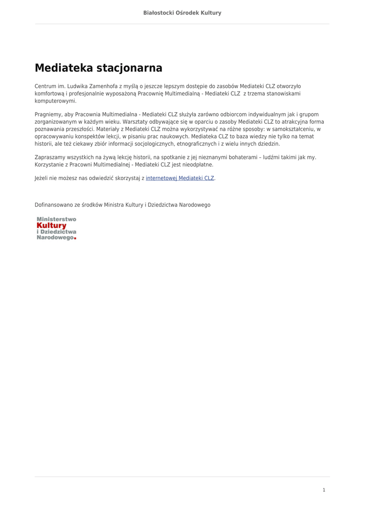 Białostocki Ośrodek Kultury Mediateka stacjonarna Centrum im. Ludwika Zamenhofa z myślą o jeszcze lepszym dostępie do zasobów Mediateki CLZ otworzyło komfortową i profesjonalnie wyposażoną Pracownię Multimedialną - Mediateki CLZ z trzema stanowiskami komputerowymi. Pragniemy, aby Pracownia Multimedialna - Mediateki CLZ służyła zarówno odbiorcom indywidualnym jak i grupom zorganizowanym w każdym wieku. Warsztaty odbywające się w oparciu o zasoby Mediateki CLZ to atrakcyjna forma poznawania przeszłości. Materiały z Mediateki CLZ można wykorzystywać na różne sposoby: w samokształceniu, w opracowywaniu konspektów lekcji, w pisaniu prac naukowych. Mediateka CLZ to baza wiedzy nie tylko na temat historii, ale też ciekawy zbiór informacji socjologicznych, etnograficznych i z wielu innych dziedzin. Zapraszamy wszystkich na żywą lekcję historii, na spotkanie z jej nieznanymi bohaterami – ludźmi takimi jak my. Korzystanie z Pracowni Multimedialnej - Mediateki CLZ jest nieodpłatne. Jeżeli nie możesz nas odwiedzić skorzystaj z internetowej Mediateki CLZ. Dofinansowano ze środków Ministra Kultury i Dziedzictwa Narodowego 1
