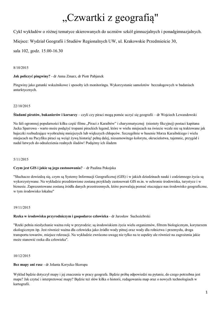 „Czwartki z geografią" Cykl wykładów o różnej tematyce skierowanych do uczniów szkół gimnazjalnych i ponadgimnazjalnych. Miejsce: Wydział Geografii i Studiów Regionalnych UW, ul. Krakowskie Przedmieście 30, sala 102, godz. 15.00-16.30 8/10/2015 Jak policzyć pingwiny? - dr Anna Zmarz, dr Piotr Pabjanek Pingwiny jako gatunki wskaźnikowe i sposoby ich monitoringu. Wykorzystanie samolotów bezzałogowych w badaniach antarktycznych. 22/10/2015 Śladami piratów, bukanierów i korsarzy – czyli czy piraci mogą pomóc uczyć się geografii – dr Wojciech Lewandowski Na fali ogromnej popularności kilku część filmu „Piraci z Karaibów” i charyzmatycznej (niestety fikcyjnej) postaci kapitana Jacka Sparrowa - warto może podążyć tropami pirackich legend, które w wielu miejscach na świecie wcale nie są traktowane jak bajeczki rozbudzające wyobraźnię mniejszych lub większych chłopców. Szczególnie w basenie Morza Karaibskiego i wielu miejscach na Pacyfiku piraci są wciąż żywą historią! pełną dalej, niesamowitego kolorytu, okrucieństwa, tajemnic, przygód i nadal łatwych do odnalezienia realnych śladów! Podążmy ich śladem 5/11/2015 Czym jest GIS i jakie są jego zastosowania? – dr Paulina Pokojska "Słuchacze dowiedzą się, czym są Systemy Informacji Geograficznej (GIS) i w jakich dziedzinach nauki i codziennego życia są wykorzystywane. Na wykładzie przedstawione zostaną przykłady zastosowań GIS m.in. w ochronie środowiska, turystyce i w biznesie. Zaprezentowane zostaną źródła danych przestrzennych, które pozwalają poznać otaczające nas środowisko geograficzne, w tym środowisko lokalne" 19/11/2015 Rzeka w środowisku przyrodniczym i gospodarce człowieka - dr Jarosław Suchożebrski "Rzeki pełnia niesłychanie ważna rolę w przyrodzie; są środowiskiem życia wielu organizmów, filtrem biologicznym, korytarzem ekologicznym itp. Jest również ważna dla człowieka jako źródło wody pitnej oraz wody dla rolnictwa i przemysłu, droga transportu towarów, miejsce rekreacji. Na wykładzie zwrócono uwagę nie tylko na te aspekty ale również na zagrożenia jakie może stanowić rzeka dla człowieka". 10/12/2015 Bez mapy ani rusz - dr Jolanta Korycka-Skorupa Wykład będzie dotyczył mapy i jej znaczenia w pracy geografa. Będzie próbą odpowiedzi na pytanie, do czego potrzebna jest mapa? Jak czytać i interpretować mapy? Będzie też słów kilka o historii, redagowaniu map oraz o nowych technologiach w kartografii. 1 14/01/2016 Ginące krajobrazy Polski – dr Wojciech Lewandowski naturalne rzeki; krajobrazy hydrogeniczne (torfowe) krajobrazy stepowe, pasterskie, holenderskie, rolnicze drobnołanowe; pasterskie; wierzbowe; rybackie, małomiasteczkowe, przemysłowe; dźwięk remiz śródpolnych 28/01/2016 Wzorce emigracji Polaków po 1980 r. – dr hab. Maria Skoczek, prof. UW Przedstawienie 4 etapów emigracji Polaków po 1980 r.: emigracja „Solidarnościowa” (lata 80.), emigracja okresu transformacji (lata90.), emigracja przedakcesyjna (przełom XX i XXI w.), emigracja poakcesyjna (po 1.05.2004). Przyczyny emigracji, cechy emigrantów; główne kraje docelowe; miejsce Polaków na rynku pracy w krajach docelowych. Skutki emigracji obserwowane w Polsce. 18/02/2016 „Płynie Wisła, płynie po polskiej krainie” – i co z tego wynika dla niej i dla nas - dr hab. Joanna Angiel Spotkanie będzie częściowo monologiem, a częściowo dialogiem na temat postrzegania Wisły w różnych kontekstach: przyrodniczym, społecznym (w tym kulturowym), gospodarczym. Przybliżymy się do prawdy o wartościach „królowej polskich rzek”, rozważymy dobro jakim nas obdarza, poszukamy nad nią sfer sacrum i profanum. Spojrzymy na rzekę i jej dolinę z punktu widzenia różnych pokoleń, a także z różnych perspektyw przestrzennych. „Popłyniemy” Wisłą od źródeł do jej trzech ujść, a po drodze zatrzymamy się „tu i ówdzie”, by przekonać się o jej niepowtarzalnej, polskiej urodzie. 3/03/2016 Co nas ciągnie do miasta? Wpływ migracji na strukturę społeczną miasta - dr Sylwia Dudek-Mańkowska Miasta od swych początków przyciągały bardzo różnych przybyszów: kupców, przestępców, fabrykantów, lekarzy, przedstawicieli różnych rzemiosł, rolników, przesiedleńców, dziwaków. Miasta stanowiły mieszankę społeczną, różniąc się tym od bardziej homogenicznej pod względem społecznym i kulturowym wsi. Przybysze kierowali się różnymi motywami szukając swojego miejsca – domu w mieście: dobrym sąsiedztwem, możliwością podjęcia pracy, bliskością rodaków, ceną mieszkania. Niektóre grupy imigrantów cechuje większa koncentracja przestrzenna, inne zamieszkują wybrane dzielnice czy osiedla, a jeszcze inne wolą żyć w większym rozproszeniu. W trakcie wykładu omówiona zostanie selektywność migracji i jej wpływ na różnicowanie struktury społecznej miasta. 17/03/2016 Lotniczy skaning laserowy (LIDAR) jako źródło informacji przestrzennej - dr Wojciech Pokojski LIDAR (Light Detection and Ranging) to lotniczy skaning laserowy, który jest jedną z najnowocześniejszych technik pozyskiwania danych przestrzennych. Na wykładzie zostaną zaprezentowane sposoby wykorzystania danych pochodzących z lotniczego skanowania laserowego w pozyskiwaniu i przetwarzaniu informacji dotyczące rzeźby terenu, roślinności i zabudowy. Zaprezentowany zostanie także wykorzystanie danych laserowych w projekcie ISOK – "Informatycznym Systemie Osłony Kraju przed nadzwyczajnymi zagrożeniami”. 2