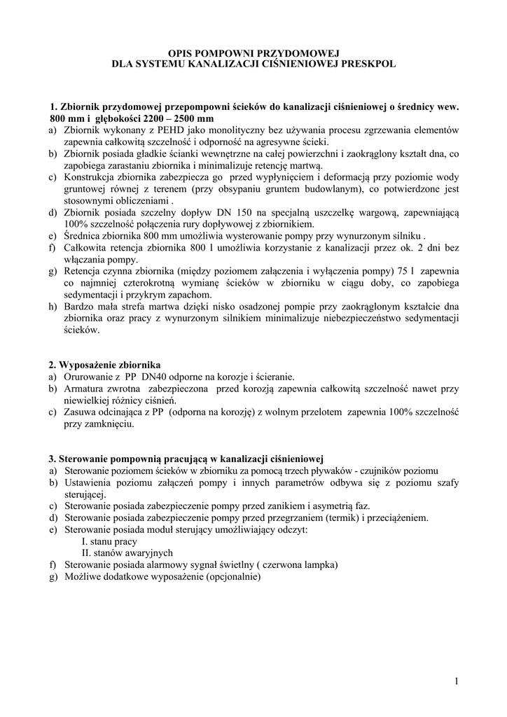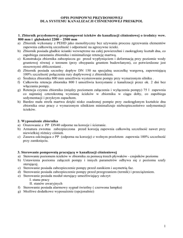 OPIS POMPOWNI PRZYDOMOWEJ DLA SYSTEMU KANALIZACJI CIŚNIENIOWEJ PRESKPOL 1. Zbiornik przydomowej przepompowni ścieków do kanalizacji ciśnieniowej o średnicy wew. 800 mm i głębokości 2200 – 2500 mm a) Zbiornik wykonany z PEHD jako monolityczny bez używania procesu zgrzewania elementów zapewnia całkowitą szczelność i odporność na agresywne ścieki. b) Zbiornik posiada gładkie ścianki wewnętrzne na całej powierzchni i zaokrąglony kształt dna, co zapobiega zarastaniu zbiornika i minimalizuje retencję martwą. c) Konstrukcja zbiornika zabezpiecza go przed wypłynięciem i deformacją przy poziomie wody gruntowej równej z terenem (przy obsypaniu gruntem budowlanym), co potwierdzone jest stosownymi obliczeniami . d) Zbiornik posiada szczelny dopływ DN 150 na specjalną uszczelkę wargową, zapewniającą 100% szczelność połączenia rury dopływowej z zbiornikiem. e) Średnica zbiornika 800 mm umożliwia wysterowanie pompy przy wynurzonym silniku . f) Całkowita retencja zbiornika 800 l umożliwia korzystanie z kanalizacji przez ok. 2 dni bez włączania pompy. g) Retencja czynna zbiornika (między poziomem załączenia i wyłączenia pompy) 75 l zapewnia co najmniej czterokrotną wymianę ścieków w zbiorniku w ciągu doby, co zapobiega sedymentacji i przykrym zapachom. h) Bardzo mała strefa martwa dzięki nisko osadzonej pompie przy zaokrąglonym kształcie dna zbiornika oraz pracy z wynurzonym silnikiem minimalizuje niebezpieczeństwo sedymentacji ścieków. 2. Wyposażenie zbiornika a) Orurowanie z PP DN40 odporne na korozje i ścieranie. b) Armatura zwrotna zabezpieczona przed korozją zapewnia całkowitą szczelność nawet przy niewielkiej różnicy ciśnień. c) Zasuwa odcinająca z PP (odporna na korozję) z wolnym przelotem zapewnia 100% szczelność przy zamknięciu. 3. Sterowanie pompownią pracującą w kanalizacji ciśnieniowej a) Sterowanie poziomem ścieków w zbiorniku za pomocą trzech pływaków - czujników poziomu b) Ustawienia poziomu załączeń pompy i innych parametrów odbywa się z poziomu szafy sterującej. c) Sterowanie posiada zabezpieczenie pompy przed zanikiem i asymetrią faz. d) Sterowanie posiada zabezpieczenie pompy przed przegrzaniem (termik) i przeciążeniem. e) Sterowanie posiada moduł sterujący umożliwiający odczyt: I. stanu pracy II. stanów awaryjnych f) Sterowanie posiada alarmowy sygnał świetlny ( czerwona lampka) g) Możliwe dodatkowe wyposażenie (opcjonalnie) 1 4. Pompa wyporowa z nożem tnącym pracująca w kanalizacji ciśnieniowej a) Zastosowanie: pompa zatapialna z nożem tnącym przeznaczona do tłoczenia ścieków komunalnych zawierających fekalia z budynków mieszkalnych. b) Nominalne parametry pracy pompy: Qp = 0,7 l/s, Hpm = 65 m sł. w. − Prędkość obrotowa silnika: 2 810 1/min., − Moc nominalna silnika : 1,1 kW; 50 Hz/400V/ (lub 1,5kW; 50Hz/230V) IP58/F, − Sprawność energetyczna pompy : 65% w ww. punkcie pracy − Silnik w wykonaniu wersja „mokra” izolacja PVC do 60 st. C − Wał silnika wyposażony w uszczelniacze gumowe typu „simmering” z dwoma łożyskami od strony noża tnącego c) Rotor ze stali nierdzewnej, stator gumowy w jarzmie stalowym i obudowie z PP. d) Silnik trójfazowy (tzw. mokry) asynchroniczny 3 – 400 V 50 Hz, (lub jednofazowy – tzw. mokry - asynchroniczny 1 – 230 V 50 HZ) stopień ochrony IP 58; kabel długości 10m (lub 15m) e) Konstrukcja: − zatapialny blok zespołu, ustawienie pionowe mokre na stojaku ze stali nierdzewnej − obudowa silnika ze stali nierdzewnej, − rurociągi z PP dn 40 mm − zawór zwrotny kulowy PVCU 1¼" − zawór odcinający kulowy z PP dn 32 mm f) Ciężar całego zespołu pompowego nie przekracza 30 kg. g) Minimalny poziom ścieków 45 cm 2