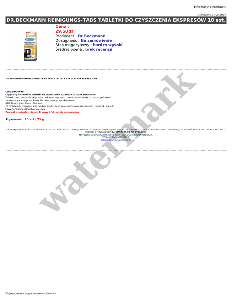 Informacje o produkcie Utworzono 07-03-2017 DR.BECKMANN REINIGUNGS-TABS TABLETKI DO CZYSZCZENIA EKSPRESÓW 10 szt. Cena : 29,50 zł Producent : Dr.Beckmann Dostępność : Na zamówienie Stan magazynowy : bardzo wysoki Średnia ocena : brak recenzji er m ar k DR.BECKMANN REINIGUNGS-TABS TABLETKI DO CZYSZCZENIA EKSPRESÓW Opis produktu: Oryginalny niemieckie tabletki do czyszczenia expresów firmy dr.Beckmann. Tabletki do czyszczenia ekspresów do kawy i espresso. Usuwa mocne osady z tłuszczu po kawie i zapewniają aromatyczną kawę. Nadaje się do typów ekspresów: AEG, Bosch, Jura, Saeco, Siemens. 10 tabletek do rozpuszczania. Nadaje się do czyszczenia automatów do espresso, kawiarek, sitek do kawy, termosów, dzbanków do kawy. Produkt oryginalny niemiecki nowy i fabrycznie zapakowany Pojemność: 10 szt./ 25 g. w at JEŚLI ZNAJDUJĄ SIĘ PAŃSTWO NA NASZYM SKLEPIE, A W OFERCIE BRAKUJE PRODUKTU KTÓREGO POSZUKUJECIE LUB JEST GO ZA MAŁO TO SERDECZNIE PROSIMY O INFORMACJE, PONIEWAŻ NASZ ASORTYMENT JEST O WIELE WIĘKSZY Z MOŻLIWOŚCIĄ ZAMÓWIENIA GO NA ŻYCZENIE. NA PEWNO COŚ PORADZIMY, GDYŻ KLIENT JEST DLA NAS NAJWAŻNIEJSZY. CZEKAMY NA WASZE MAILE: [email protected] Wygenerowano w programie www.oscGold.com