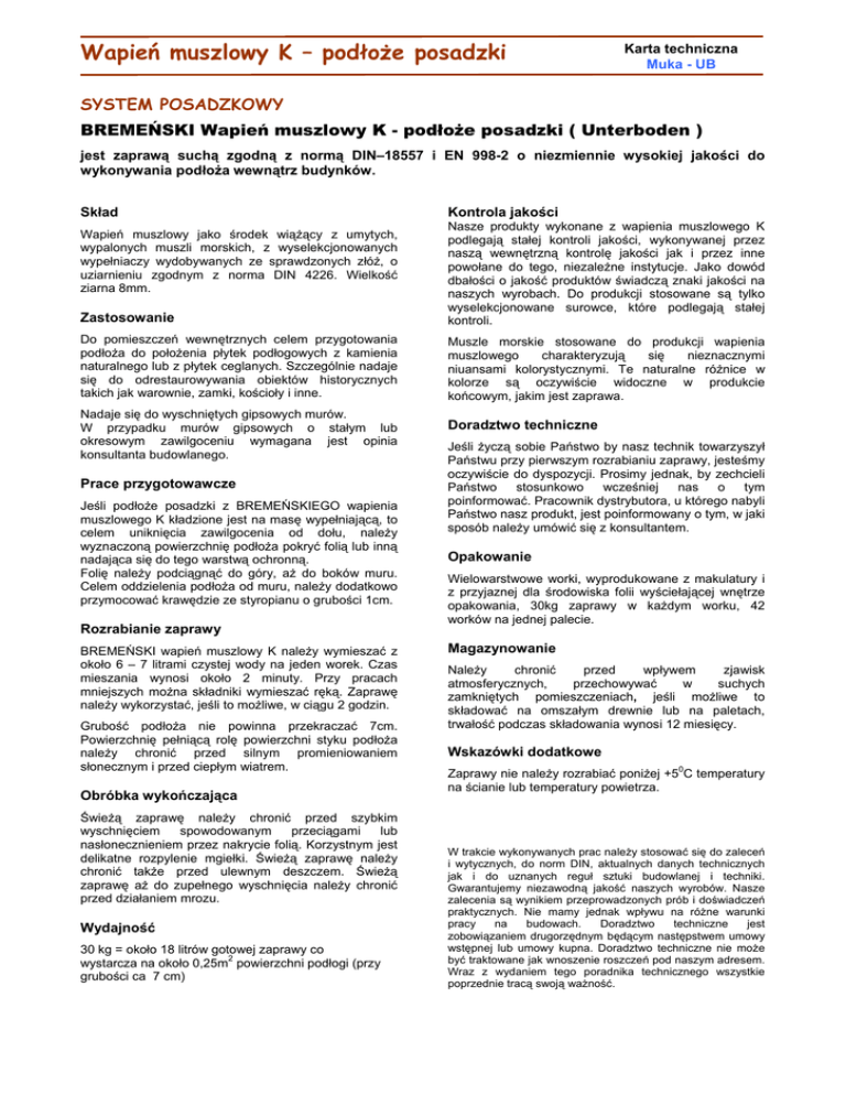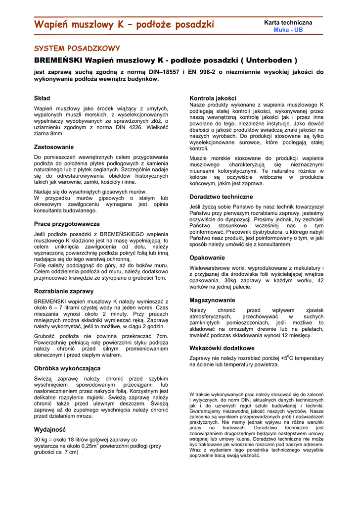 Wapień muszlowy K – podłoże posadzki Karta techniczna Muka - UB SYSTEM POSADZKOWY BREMEŃSKI Wapień muszlowy K - podłoże posadzki ( Unterboden ) jest zaprawą suchą zgodną z normą DIN–18557 i EN 998-2 o niezmiennie wysokiej jakości do wykonywania podłoża wewnątrz budynków. Skład Kontrola jakości Zastosowanie Nasze produkty wykonane z wapienia muszlowego K podlegają stałej kontroli jakości, wykonywanej przez naszą wewnętrzną kontrolę jakości jak i przez inne powołane do tego, niezależne instytucje. Jako dowód dbałości o jakość produktów świadczą znaki jakości na naszych wyrobach. Do produkcji stosowane są tylko wyselekcjonowane surowce, które podlegają stałej kontroli. Do pomieszczeń wewnętrznych celem przygotowania podłoża do położenia płytek podłogowych z kamienia naturalnego lub z płytek ceglanych. Szczególnie nadaje się do odrestaurowywania obiektów historycznych takich jak warownie, zamki, kościoły i inne. Muszle morskie stosowane do produkcji wapienia muszlowego charakteryzują się nieznacznymi niuansami kolorystycznymi. Te naturalne różnice w kolorze są oczywiście widoczne w produkcie końcowym, jakim jest zaprawa. Wapień muszlowy jako środek wiążący z umytych, wypalonych muszli morskich, z wyselekcjonowanych wypełniaczy wydobywanych ze sprawdzonych złóż, o uziarnieniu zgodnym z norma DIN 4226. Wielkość ziarna 8mm. Nadaje się do wyschniętych gipsowych murów. W przypadku murów gipsowych o stałym lub okresowym zawilgoceniu wymagana jest opinia konsultanta budowlanego. Prace przygotowawcze Jeśli podłoże posadzki z BREMEŃSKIEGO wapienia muszlowego K kładzione jest na masę wypełniającą, to celem uniknięcia zawilgocenia od dołu, należy wyznaczoną powierzchnię podłoża pokryć folią lub inną nadająca się do tego warstwą ochronną. Folię należy podciągnąć do góry, aż do boków muru. Celem oddzielenia podłoża od muru, należy dodatkowo przymocować krawędzie ze styropianu o grubości 1cm. Rozrabianie zaprawy BREMEŃSKI wapień muszlowy K należy wymieszać z około 6 – 7 litrami czystej wody na jeden worek. Czas mieszania wynosi około 2 minuty. Przy pracach mniejszych można składniki wymieszać ręką. Zaprawę należy wykorzystać, jeśli to możliwe, w ciągu 2 godzin. Grubość podłoża nie powinna przekraczać 7cm. Powierzchnię pełniącą rolę powierzchni styku podłoża należy chronić przed silnym promieniowaniem słonecznym i przed ciepłym wiatrem. Obróbka wykończająca Świeżą zaprawę należy chronić przed szybkim wyschnięciem spowodowanym przeciągami lub nasłonecznieniem przez nakrycie folią. Korzystnym jest delikatne rozpylenie mgiełki. Świeżą zaprawę należy chronić także przed ulewnym deszczem. Świeżą zaprawę aż do zupełnego wyschnięcia należy chronić przed działaniem mrozu. Wydajność 30 kg = około 18 litrów gotowej zaprawy co 2 wystarcza na około 0,25m powierzchni podłogi (przy grubości ca 7 cm) Doradztwo techniczne Jeśli życzą sobie Państwo by nasz technik towarzyszył Państwu przy pierwszym rozrabianiu zaprawy, jesteśmy oczywiście do dyspozycji. Prosimy jednak, by zechcieli Państwo stosunkowo wcześniej nas o tym poinformować. Pracownik dystrybutora, u którego nabyli Państwo nasz produkt, jest poinformowany o tym, w jaki sposób należy umówić się z konsultantem. Opakowanie Wielowarstwowe worki, wyprodukowane z makulatury i z przyjaznej dla środowiska folii wyściełającej wnętrze opakowania, 30kg zaprawy w każdym worku, 42 worków na jednej palecie. Magazynowanie Należy chronić przed wpływem zjawisk atmosferycznych, przechowywać w suchych zamkniętych pomieszczeniach, jeśli możliwe to składować na omszałym drewnie lub na paletach, trwałość podczas składowania wynosi 12 miesięcy. Wskazówki dodatkowe Zaprawy nie należy rozrabiać poniżej +50C temperatury na ścianie lub temperatury powietrza. W trakcie wykonywanych prac należy stosować się do zaleceń i wytycznych, do norm DIN, aktualnych danych technicznych jak i do uznanych reguł sztuki budowlanej i techniki. Gwarantujemy niezawodną jakość naszych wyrobów. Nasze zalecenia są wynikiem przeprowadzonych prób i doświadczeń praktycznych. Nie mamy jednak wpływu na różne warunki pracy na budowach. Doradztwo techniczne jest zobowiązaniem drugorzędnym będącym następstwem umowy wstępnej lub umowy kupna. Doradztwo techniczne nie może być traktowane jak wnoszenie roszczeń pod naszym adresem. Wraz z wydaniem tego poradnika technicznego wszystkie poprzednie tracą swoją ważność.