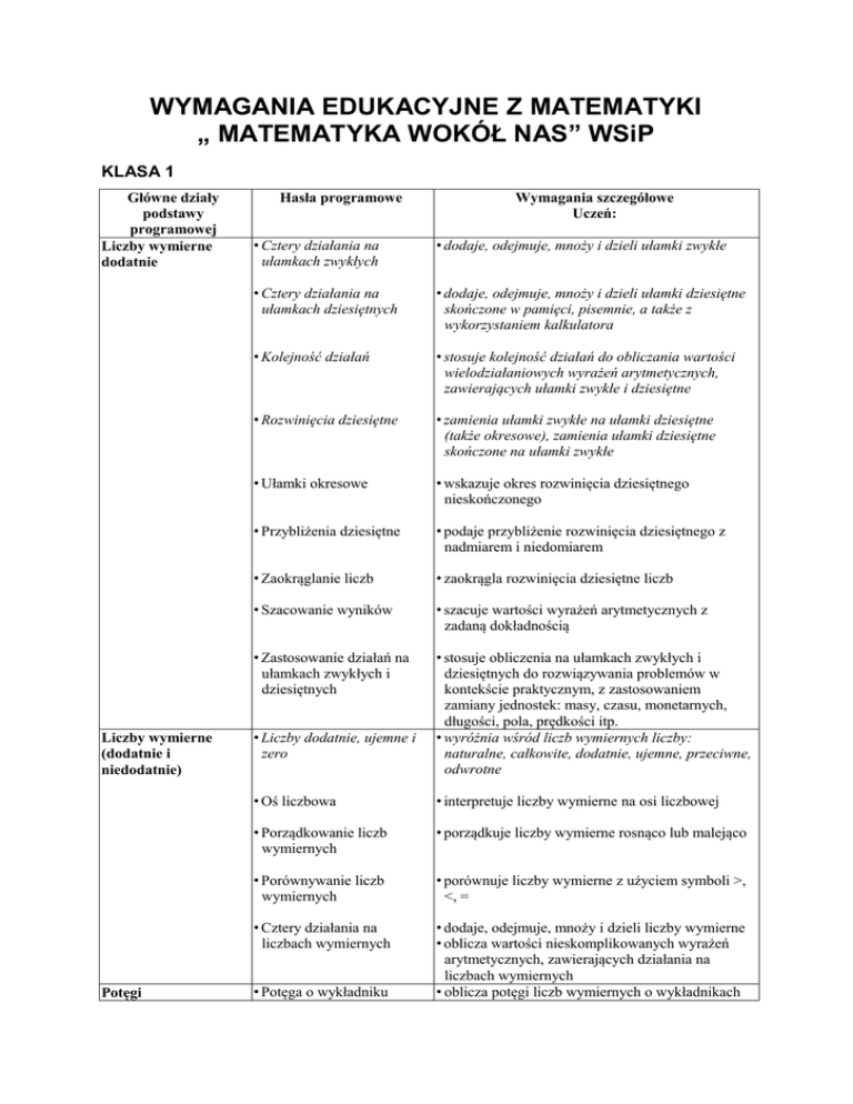WYMAGANIA EDUKACYJNE Z MATEMATYKI „ MATEMATYKA WOKÓŁ NAS” WSiP KLASA 1 Główne działy podstawy programowej Liczby wymierne dodatnie Liczby wymierne (dodatnie i niedodatnie) Potęgi Hasła programowe Wymagania szczegółowe Uczeń: • Cztery działania na ułamkach zwykłych • dodaje, odejmuje, mnoży i dzieli ułamki zwykłe • Cztery działania na ułamkach dziesiętnych • dodaje, odejmuje, mnoży i dzieli ułamki dziesiętne skończone w pamięci, pisemnie, a także z wykorzystaniem kalkulatora • Kolejność działań • stosuje kolejność działań do obliczania wartości wielodziałaniowych wyrażeń arytmetycznych, zawierających ułamki zwykłe i dziesiętne • Rozwinięcia dziesiętne • zamienia ułamki zwykłe na ułamki dziesiętne (także okresowe), zamienia ułamki dziesiętne skończone na ułamki zwykłe • Ułamki okresowe • wskazuje okres rozwinięcia dziesiętnego nieskończonego • Przybliżenia dziesiętne • podaje przybliżenie rozwinięcia dziesiętnego z nadmiarem i niedomiarem • Zaokrąglanie liczb • zaokrągla rozwinięcia dziesiętne liczb • Szacowanie wyników • szacuje wartości wyrażeń arytmetycznych z zadaną dokładnością • Zastosowanie działań na ułamkach zwykłych i dziesiętnych • stosuje obliczenia na ułamkach zwykłych i dziesiętnych do rozwiązywania problemów w kontekście praktycznym, z zastosowaniem zamiany jednostek: masy, czasu, monetarnych, długości, pola, prędkości itp. • wyróżnia wśród liczb wymiernych liczby: naturalne, całkowite, dodatnie, ujemne, przeciwne, odwrotne • Liczby dodatnie, ujemne i zero • Oś liczbowa • interpretuje liczby wymierne na osi liczbowej • Porządkowanie liczb wymiernych • porządkuje liczby wymierne rosnąco lub malejąco • Porównywanie liczb wymiernych • porównuje liczby wymierne z użyciem symboli >, <, = • Cztery działania na liczbach wymiernych • dodaje, odejmuje, mnoży i dzieli liczby wymierne • oblicza wartości nieskomplikowanych wyrażeń arytmetycznych, zawierających działania na liczbach wymiernych • oblicza potęgi liczb wymiernych o wykładnikach • Potęga o wykładniku naturalnym Pierwiastki Procenty • Pierwiastek drugiego i trzeciego stopnia z liczb nieujemnych naturalnych; oblicza wartości nieskomplikowanych wyrażeń arytmetycznych zawierających potęgi o wykładniku naturalnym. • oblicza wartości pierwiastków drugiego i trzeciego stopnia z liczb, które są odpowiednio kwadratami lub sześcianami liczb wymiernych; oblicza wartości nieskomplikowanych wyrażeń arytmetycznych zawierających pierwiastki kwadratowe i sześcienne • Przykłady liczb niewymiernych* • rozpoznaje liczby niewymierne* • Szacowanie liczb niewymiernych* • Pojęcie procentu i promila • podaje wymierne przybliżenie liczb niewymiernych* • przedstawia część pewnej wielkości jako procent lub promil tej wielkości i odwrotnie • Obliczanie procentu zdanej • oblicza procent danej liczby liczby • Obliczanie liczby z danego • oblicza liczbę na podstawie danego jej procentu jej procentu • Obliczanie jakim • oblicza, jakim procentem jednej liczby jest druga procentem jednej wielkości liczba* jest druga wielkość* • Obliczenia procentowe Wyrażenia algebraiczne • stosuje obliczenia procentowe do rozwiązywania problemów w kontekście praktycznym: np. oblicza ceny po podwyżce lub obniżce o dany procent, odsetki od lokaty, stężenia procentowe roztworów, próby złota i srebra, wykonuje obliczenia związane z VAT. • Budowanie i odczytywanie • opisuje za pomocą wyrażeń algebraicznych wyrażeń algebraicznych związki między różnymi wielkościami • Wartość liczbowa wyrażenia algebraicznego • oblicza wartości liczbowe wyrażeń algebraicznych • Suma algebraiczna. Wyrazy podobne • redukuje wyrazy podobne w sumie algebraicznej • Dodawanie i odejmowanie • dodaje i odejmuje sumy algebraiczne sum algebraicznych Równania • Mnożenie sumy algebraicznej przez liczbę • mnoży sumę algebraiczną przez liczbę • Wyłączanie wspólnego czynnika liczbowego • Równania pierwszego stopnia z jedną niewiadomą • wyłącza wspólny czynnik z wyrazów sumy algebraicznej poza nawias • zapisuje związki między wielkościami za pomocą równania pierwszego stopnia z jedną niewiadomą; sprawdza, czy dana liczba spełnia równanie stopnia pierwszego z jedną niewiadomą • Rozwiązywanie równań • rozwiązuje równania stopnia pierwszego z jedną metodą równań równoważnych Wykresy funkcji niewiadomą • Proporcja i jej własności • rozwiązuje równania w postaci proporcji • Przekształcanie wzorów • przekształca nieskomplikowane wzory matematyczne lub fizyczne • Nierówność pierwszego stopnia z jedną niewiadomą • wskazuje na osi liczbowej zbiór liczb spełniających warunek typu: , wskazuje na osi liczbowej zbiór liczb spełniających warunek typu: ; * • Rozwiązywanie nierówności* • rozwiązuje nierówności stopnia pierwszego z jedną niewiadomą* • Zastosowanie równań • za pomocą równań opisuje i rozwiązuje zadania osadzone w kontekście praktycznym • Zastosowanie nierówności* • za pomocą nierówności opisuje i rozwiązuje zadania osadzone w kontekście praktycznym* • Kartezjański układ • rysuje układ współrzędnych na płaszczyźnie i współrzędnych wyróżnia w nim ćwiartki • Zaznaczanie punktów w układzie współrzędnych • zaznacza w układzie współrzędnych na płaszczyźnie punkty o danych współrzędnych • Odczytywanie • odczytuje współrzędne danych punktów współrzędnych punktów w układzie współrzędnych • Odczytywanie danych • interpretuje dane przedstawione za pomocą tabel, statystycznych diagramów słupkowych i kołowych Statystyka opisowa i wprowadzenie do rachunku prawdopodobieństwa • Zbieranie i porządkowanie • wyszukuje, selekcjonuje i porządkuje informacje z danych statyst