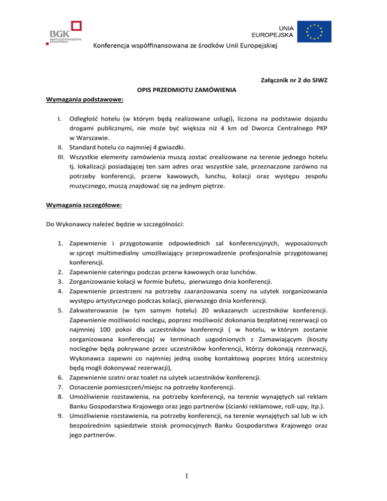 Załącznik nr 2 do SIWZ OPIS PRZEDMIOTU ZAMÓWIENIA Wymagania podstawowe: I. Odległość hotelu (w którym będą realizowane usługi), liczona na podstawie dojazdu drogami publicznymi, nie może być większa niż 4 km od Dworca Centralnego PKP w Warszawie. II. Standard hotelu co najmniej 4 gwiazdki. III. Wszystkie elementy zamówienia muszą zostać zrealizowane na terenie jednego hotelu tj. lokalizacji posiadającej ten sam adres oraz wszystkie sale, przeznaczone zarówno na potrzeby konferencji, przerw kawowych, lunchu, kolacji oraz występu zespołu muzycznego, muszą znajdować się na jednym piętrze. Wymagania szczegółowe: Do Wykonawcy należeć będzie w szczególności: 1. Zapewnienie i przygotowanie odpowiednich sal konferencyjnych, wyposażonych w sprzęt multimedialny umożliwiający przeprowadzenie profesjonalnie przygotowanej konferencji. 2. Zapewnienie cateringu podczas przerw kawowych oraz lunchów. 3. Zorganizowanie kolacji w formie bufetu, pierwszego dnia konferencji. 4. Zapewnienie przestrzeni na potrzeby zaaranżowania sceny na użytek zorganizowania występu artystycznego podczas kolacji, pierwszego dnia konferencji. 5. Zakwaterowanie (w tym samym hotelu) 20 wskazanych uczestników konferencji. Zapewnienie możliwości noclegu, poprzez możliwość dokonania bezpłatnej rezerwacji co najmniej 100 pokoi dla uczestników konferencji ( w hotelu, w którym zostanie zorganizowana konferencja) w terminach uzgodnionych z Zamawiającym (koszty noclegów będą pokrywane przez uczestników konferencji, którzy dokonają rezerwacji, Wykonawca zapewni co najmniej jedną osobę kontaktową poprzez którą uczestnicy będą mogli dokonywać rezerwacji), 6. Zapewnienie szatni oraz toalet na użytek uczestników konferencji. 7. Oznaczenie pomieszczeń/miejsc na potrzeby konferencji. 8. Umożliwienie rozstawienia, na potrzeby konferencji, na terenie wynajętych sal reklam Banku Gospodarstwa Krajowego oraz jego partnerów (ścianki reklamowe, roll-upy, itp.). 9. Umożliwienie rozstawienia, na potrzeby konferencji, na terenie wynajętych sal lub w ich bezpośrednim sąsiedztwie stoisk promocyjnych Banku Gospodarstwa Krajowego oraz jego partnerów. 1 10. Umożliwienie przedstawicielom Banku Gospodarstwa Krajowego oraz jego partnerom dystrybucji materiałów reklamowych (ulotki, gadżety, itp.) wśród uczestników konferencji poprzez rozdawanie ich na zaaranżowanej recepcji. 11. Zapewnienie 20 miejsc parkingowych (samochody osobowe) dla uczestników konferencji na własnym wewnętrznym parkingu lub na parkingu zewnętrznym oddalonym maksymalnie 200 metrów od hotelu. 22 czerwca 2016 r.: a. Główna sala konferencyjna Wykonawca powinien zapewnić, na potrzeby konferencji, prostokątną salę, która pomieści 350 uczestników w ustawieniu teatralnym. Sala ze względu na planowane zaaranżowanie występu zespołu muzycznego, podczas uroczystej kolacji pierwszego dnia konferencji, powinna mieć minimalną wysokość: 4 metry na całej powierzchni. Sala powinna być klimatyzowana oraz dobrze oświetlona – oświetlenie sufitowe. Sala powinna być przestrzenna i nie może posiadać żadnych stałych elementów i/lub atrybutów ograniczających widoczność (np. filarów). Sala powinna zostać wyposażona w 350 krzeseł. Krzesła powinny zostać ustawione w jednolitych rzędach, w taki sposób, że każdy uczestnik konferencji będzie usadzony twarzą do głównej sceny, na której zostanie umiejscowiona przestrzeń prezydialna – 8 foteli wraz z podręcznymi stoliczkami z pleksi. W czasie konferencji Wykonawca powinien zapewnić: 1 profesjonalnego koordynatora konferencji (22-23.06.2016 r.) do wyłącznej dyspozycji Banku Gospodarstwa Krajowego oraz ponadto dyżur 2 osób odpowiedzialnych osobno za: instalację elektryczną (22-23.06.2016 r.) oraz nagłośnienie (23.06.2016 r.). Wykonawca powinien w głównej sali konferencyjnej zapewnić odpowiednią przestrzeń na potrzeby zaaranżowania sceny. Na scenie powinno być miejsce na 8 foteli wraz z podręcznymi stoliczkami z pleksi. Scena będzie służyła zorganizowaniu występu, co najmniej 10-osobowego, zespołu muzycznego. (Uwaga – Bank Gospodarstwa Krajowego podpisze oddzielne umowy z zespołem muzycznym na zrealizowanie koncertu na terenie hotelu oraz z firmą, która zapewni obsługę techniczną (nagłośnienie i oświetlenie) pierwszego dnia konferencji, oraz jednocześnie koncertu muzycznego wraz z aranżacją przestrzeni prezydialnej (sceny). Wykonawca nie ponosi żadnych kosztów z tego tytułu). Scena zaaranżowana na potrzeby konferencji oraz występu zespołu muzycznego musi być gotowa max. do godziny 8:00, 22 czerwca 2016 r. W związku z tym Wykonawca musi zapewnić dostępność sali konferencyjnej umożliwiającą montaż sceny, oświetlenia i nagłośnienia od godz. 10:00, 21 czerwca 2016 r. Oczekiwana przestrzeń dla sceny powinna mieć następujące parametry: W czasie konferencji: 2 szerokość: 10 m głębokość: 11 m wysokość sceny: 1 m (wysokość nad sceną powinna wynosić minimum 3,0 m) powierzchnia: 110 m2 W czasie kolacji: szerokość: 10 m głębokość: 8 m wysokość sceny: 1 m (wysokość nad sceną powinna wynosić minimum 3,0 m) powierzchnia: 80 m2 Wykonawca powinien zaaranżować w głównej sali konferencyjnej w czasie kolacji, parkiet. Oczekiwana przestrzeń parkietu powinna mieć następujące parametry: szerokość: 8 m głębokość: 3 m powierzchnia: 24 m2 Występ zespołu muzycznego przewidziany jest w czasie wieczornej kolacji. Na potrzeby zespołu muzycznego Wykonawca powinien przygotować garderobę z zapleczem. Na potrzeby zorganizowania występu zespołu muzycznego Wykonawca powinien na czas rozładunku i załadunku aparatury scenicznej, sprzętu technicznego oraz instrumentów zapewnić 2 osoby do pomocy zespołowi. Wykonawca powinien zapewnić przed główną salą konferencyjną lub w głównym lobby hotelu przestrzeń na zorganizowanie 4 stanowisk recepcyjnych dedykowanych ucz