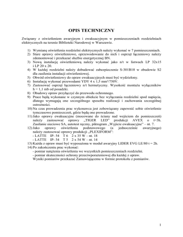 OPIS TECHNICZNY Związany z oświetleniem awaryjnym i ewakuacyjnym w pomieszczeniach rozdzielniach elektrycznych na terenie Biblioteki Narodowej w Warszawie. 1) Wymianę oświetlenia rozdzielni elektrycznych naleŜy wykonać w 7 pomieszczeniach. 2) Stare oprawy oświetleniowe, oprzewodowanie do nich i osprzęt łączeniowy naleŜy zdemontować i przekazać słuŜbie energetycznej BN. 3) Nową instalację oświetleniową naleŜy wykonać jako n/t w listwach LP 32x15 i LP 20 x 20. 4) W kaŜdej rozdzielni naleŜy dobudować zabezpieczenie S-301B10 w obudowie S2 dla zasilenia instalacji oświetleniowej. 5) Obwód oświetleniowy do opraw ewakuacyjnych musi być wydzielony. 6) Instalację wykonać przewodami YDY 4 x 1,5 mm²/750V. 7) Zastosować osprzęt łączeniowy n/t hermetyczny. Wysokość montaŜu wyłączników h = 1,1 mb od posadzki. 8) Obudowy opraw przyłączyć do przewodu ochronnego. 9) Prace będą wykonane w czynnym obiekcie bez wyłączania rozdzielni spod napięcia, dlatego wymagają one szczególnego sposobu realizacji i zachowania szczególnej ostroŜności. 10) Na czas prowadzenia prac wykonawca jest zobowiązany zapewnić sobie oświetlenie tymczasowe pomieszczeń, gdzie będą one prowadzone. 11) Jako oprawy ewakuacyjne (mocowane do ściany nad wejściem do pomieszczeń) naleŜy zastosować oprawy „TIGER LED” produkcji AVEX o t=3h. Zasilanie sieciowe SA, autotest ręczny, piktogram „Wyjście ewakuacyjne” – nt. 7. 12) Jako oprawy oświetlenia podstawowego (a jednocześnie awaryjnego) naleŜy zastosować oprawy produkcji „PLEXIFORM”: - LATTE IP- 54 T 6 2 x 35 W – nt. 18 - LATTE IP- 54 T 5 2 x 54 W – nt. 14 13) KaŜda z opraw musi być wyposaŜona w moduł awaryjny LIDER EVG LE/80 t = 2h. 14) Po zakończeniu prac wykonać: - pomiar natęŜenia oświetlenia we wszystkich pomieszczeniach rozdzielni. - pomiar skuteczności ochrony przeciwporaŜeniowej dla kaŜdej z opraw. Wyniki pomiarów przekazać Zamawiającemu w formie protokołu z pomiarów. 1