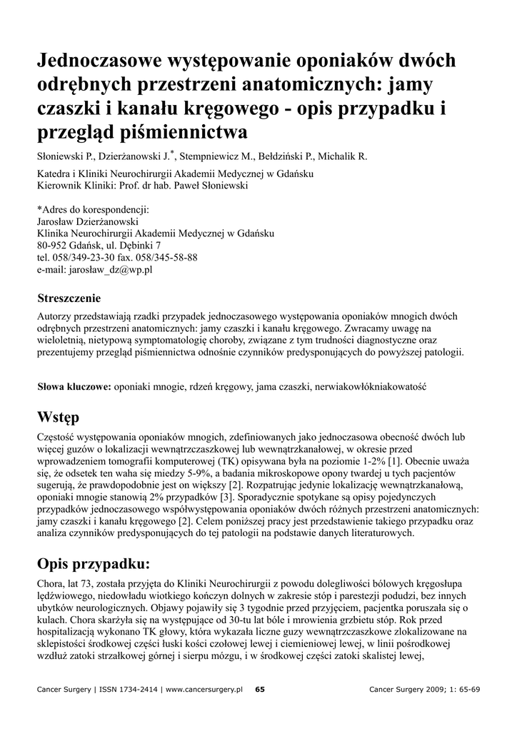 Jednoczasowe występowanie oponiaków dwóch odrębnych przestrzeni anatomicznych: jamy czaszki i kanału kręgowego - opis przypadku i przegląd piśmiennictwa Słoniewski P., Dzierżanowski J.*, Stempniewicz M., Bełdziński P., Michalik R. Katedra i Kliniki Neurochirurgii Akademii Medycznej w Gdańsku Kierownik Kliniki: Prof. dr hab. Paweł Słoniewski *Adres do korespondencji: Jarosław Dzierżanowski Klinika Neurochirurgii Akademii Medycznej w Gdańsku 80-952 Gdańsk, ul. Dębinki 7 tel. 058/349-23-30 fax. 058/345-58-88 e-mail: jarosł[email protected] Streszczenie Autorzy przedstawiają rzadki przypadek jednoczasowego występowania oponiaków mnogich dwóch odrębnych przestrzeni anatomicznych: jamy czaszki i kanału kręgowego. Zwracamy uwagę na wieloletnią, nietypową symptomatologię choroby, związane z tym trudności diagnostyczne oraz prezentujemy przegląd piśmiennictwa odnośnie czynników predysponujących do powyższej patologii. Słowa kluczowe: oponiaki mnogie, rdzeń kręgowy, jama czaszki, nerwiakowłókniakowatość Wstęp Częstość występowania oponiaków mnogich, zdefiniowanych jako jednoczasowa obecność dwóch lub więcej guzów o lokalizacji wewnątrzczaszkowej lub wewnątrzkanałowej, w okresie przed wprowadzeniem tomografii komputerowej (TK) opisywana była na poziomie 1-2% [1]. Obecnie uważa się, że odsetek ten waha się miedzy 5-9%, a badania mikroskopowe opony twardej u tych pacjentów sugerują, że prawdopodobnie jest on większy [2]. Rozpatrując jedynie lokalizację wewnątrzkanałową, oponiaki mnogie stanowią 2% przypadków [3]. Sporadycznie spotykane są opisy pojedynczych przypadków jednoczasowego współwystępowania oponiaków dwóch różnych przestrzeni anatomicznych: jamy czaszki i kanału kręgowego [2]. Celem poniższej pracy jest przedstawienie takiego przypadku oraz analiza czynników predysponujących do tej patologii na podstawie danych literaturowych. Opis przypadku: Chora, lat 73, została przyjęta do Kliniki Neurochirurgii z powodu dolegliwości bólowych kręgosłupa lędźwiowego, niedowładu wiotkiego kończyn dolnych w zakresie stóp i parestezji podudzi, bez innych ubytków neurologicznych. Objawy pojawiły się 3 tygodnie przed przyjęciem, pacjentka poruszała się o kulach. Chora skarżyła się na występujące od 30-tu lat bóle i mrowienia grzbietu stóp. Rok przed hospitalizacją wykonano TK głowy, która wykazała liczne guzy wewnątrzczaszkowe zlokalizowane na sklepistości środkowej części łuski kości czołowej lewej i ciemieniowej lewej, w linii pośrodkowej wzdłuż zatoki strzałkowej górnej i sierpu mózgu, i w środkowej części zatoki skalistej lewej, Cancer Surgery | ISSN 1734-2414 | www.cancersurgery.pl 65 Cancer Surgery 2009; 1: 65-69 radiologicznie mogące odpowiadać oponiakom. Kontrolne badanie tomografii komputerowej głowy wykonane w trakcie hospitalizacji nie wykazało progresji zmian wewnątrzczaszkowych (Ryc.1). Dalsza diagnostyka obrazowa (mielo-TK) uwidoczniła w odcinku piersiowym rdzenia kręgowego (poziom kręgu Th9) zatrzymanie przepływu kontrastu. Badanie rezonansu magnetycznego (MRI) potwierdziło obecność masy patologicznej wewnątrzkanałowej na poziomie kręgów Th7-Th9. Druga, mniejsza zmiana widoczna na poziomie Th4/Th5 nie wykazywała klinicznych objawów ciasnoty wewnątrzkanałowej (Ryc. 2). Chora była leczona operacyjnie - drogą laminektomii łuków Th7-Th9 usunięto guz w całości. Makroskopowo zmiana odpowiadała zwapniałemu, dobrze odgraniczonemu od tkanki nerwowej oponiakowi. Potwierdziło to badanie histopatologiczne meningioma meningotheliale psammomatodes. Kontrolnym badaniem neurologicznym po tygodniu od zabiegu nie stwierdzono istotnej poprawy. Ryc. 1 Tomografia komputerowa - widoczne guzy zlokalizowane na sklepistości środkowej części łuski kości czołowej lewej i ciemieniowej lewej, w linii pośrodkowej wzdłuż zatoki strzałkowej górnej i sierpu mózgu, i w środkowej części zatoki skalistej lewej Ryc. 2 Rezonans magnetyczny - obecność guza wewnątrzkanałowego na poziomie kręgów Th7-Th9 Dyskusja Oponiaki stanowią średnio od 15% do 20% wszystkich nowotworów wewnątrzczaszkowych i około 25% guzów wewnątrzkanałowych [4]. Mimo, że opisano wiele czynników biologicznych mogących wpływać na dynamikę wzrostu oponiaka, jego histopatologię, angiogenezę, towarzyszący obrzęk mózgowia, jednak cały czas powyższe mechanizmy nie są do końca jasne. Najogólniej można je podzielić na egzogenne i endogenne [5]. Cancer Surgery | ISSN 1734-2414 | www.cancersurgery.pl 66 Cancer Surgery 2009; 1: 65-69 Spośród tych pierwszych udokumentowany jest wpływ przebytej radioterapii oraz prawdopodobny wpływ niektórych leków np. tamoksifen [6,7]. Mimo, iż podejmowano próbę wyjaśnienia tego zagadnienia, to nadal uważa się, że mechanizm nie jest do końca znany. Jedna z teorii głosi, że przyczyna tkwi w powstawaniu pierwotnych zmian zapalnych opony twardej i jej zrostów z oponą miękką oraz nieprawidłowej regeneracji komórek jako zejście przewlekłego procesu zapalnego. Wśród czynników endogennych najczęściej przytaczane są zaburzenia genetyczne i wpływ hormonów płciowych [5]. Badania molekularne wykazały, że brakujące antyonkogeny leżą między dwoma znanymi miejscami chromosomu 22: MB a 22qter. Zaobserwowano, że nerwiakowłókniakowatość typu 2 (NF2), charakteryzująca się między innymi tendencją do występowania oponiaków i nerwiaków osłonowych nerwu VIII, ma związek z zaburzeniami genetycznymi, a wyodrębniony gen supresorowy NF2, którego inaktywacja koreluje z tą autosomalną dominującą chorobą, znajduje się właśnie na ramieniu długim chromosomu 22 w pozycji 22q12 [4,8,9]. Według niektórych prac inaktywacja tego genu u chorych z oponiakami wynosi od 35 do 60% [10]. Podobne delecje w obrębie chromosomów opisano również u chorych z nowotworami poza centralnym systemem nerwowym: z raki