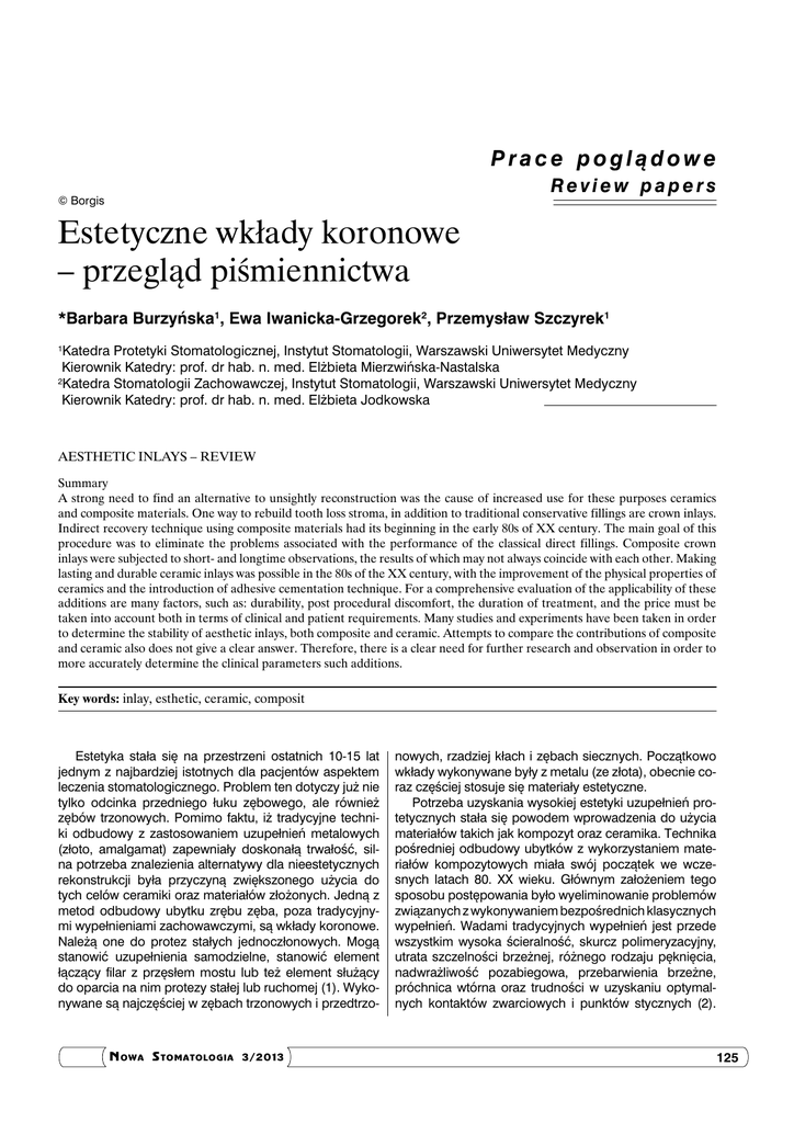 Prace poglądowe Review papers © Borgis Estetyczne wkłady koronowe – przegląd piśmiennictwa *Barbara Burzyńska1, Ewa Iwanicka-Grzegorek2, Przemysław Szczyrek1 Katedra Protetyki Stomatologicznej, Instytut Stomatologii, Warszawski Uniwersytet Medyczny Kierownik Katedry: prof. dr hab. n. med. Elżbieta Mierzwińska-Nastalska 2 Katedra Stomatologii Zachowawczej, Instytut Stomatologii, Warszawski Uniwersytet Medyczny Kierownik Katedry: prof. dr hab. n. med. Elżbieta Jodkowska 1 Aesthetic inlays – review Summary A strong need to find an alternative to unsightly reconstruction was the cause of increased use for these purposes ceramics and composite materials. One way to rebuild tooth loss stroma, in addition to traditional conservative fillings are crown inlays. Indirect recovery technique using composite materials had its beginning in the early 80s of XX century. The main goal of this procedure was to eliminate the problems associated with the performance of the classical direct fillings. Composite crown inlays were subjected to short- and longtime observations, the results of which may not always coincide with each other. Making lasting and durable ceramic inlays was possible in the 80s of the XX century, with the improvement of the physical properties of ceramics and the introduction of adhesive cementation technique. For a comprehensive evaluation of the applicability of these additions are many factors, such as: durability, post procedural discomfort, the duration of treatment, and the price must be taken into account both in terms of clinical and patient requirements. Many studies and experiments have been taken in order to determine the stability of aesthetic inlays, both composite and ceramic. Attempts to compare the contributions of composite and ceramic also does not give a clear answer. Therefore, there is a clear need for further research and observation in order to more accurately determine the clinical parameters such additions. Key words: inlay, esthetic, ceramic, composit Estetyka stała się na przestrzeni ostatnich 10-15 lat jednym z najbardziej istotnych dla pacjentów aspektem leczenia stomatologicznego. Problem ten dotyczy już nie tylko odcinka przedniego łuku zębowego, ale również zębów trzonowych. Pomimo faktu, iż tradycyjne techniki odbudowy z zastosowaniem uzupełnień metalowych (złoto, amalgamat) zapewniały doskonałą trwałość, silna potrzeba znalezienia alternatywy dla nieestetycznych rekonstrukcji była przyczyną zwiększonego użycia do tych celów ceramiki oraz materiałów złożonych. Jedną z metod odbudowy ubytku zrębu zęba, poza tradycyjnymi wypełnieniami zachowawczymi, są wkłady koronowe. Należą one do protez stałych jednoczłonowych. Mogą stanowić uzupełnienia samodzielne, stanowić element łączący filar z przęsłem mostu lub też element służący do oparcia na nim protezy stałej lub ruchomej (1). Wykonywane są najczęściej w zębach trzonowych i przedtrzo- N OWA S TOMATOLOGIA 3/2013 nowych, rzadziej kłach i zębach siecznych. Początkowo wkłady wykonywane były z metalu (ze złota), obecnie coraz częściej stosuje się materiały estetyczne. Potrzeba uzyskania wysokiej estetyki uzupełnień protetycznych stała się powodem wprowadzenia do użycia materiałów takich jak kompozyt oraz ceramika. Technika pośredniej odbudowy ubytków z wykorzystaniem materiałów kompozytowych miała swój początek we wczesnych latach 80. XX wieku. Głównym założeniem tego sposobu postępowania było wyeliminowanie problemów związanych z wykonywaniem bezpośrednich klasycznych wypełnień. Wadami tradycyjnych wypełnień jest przede wszystkim wysoka ścieralność, skurcz polimeryzacyjny, utrata szczelności brzeżnej, różnego rodzaju pęknięcia, nadwrażliwość pozabiegowa, przebarwienia brzeżne, próchnica wtórna oraz trudności w uzyskaniu optymalnych kontaktów zwarciowych i punktów stycznych (2). 125 Barbara Burzyńska, Ewa Iwanicka-Grzegorek, Przemysław Szczyrek Pożądanymi cechami wkładów kompozytowych, przeważającymi nad wypełnieniami, jest ograniczony skurcz polimeryzacyjny, lepsza szczelność brzeżna, mniejsza ścieralność oraz większa biokompatybilność na skutek wyższego stopnia spolimeryzowania (3). Istotną zaletą wkładów jest niezaprzeczalnie możliwość wymodelowania pożądanego kształtu powierzchni zgryzowej oraz uzyskanie odpowiednich punktów stycznych. Kompozytowe wkłady koronowe były poddawane krótko- i długoczasowym obserwacjom, których rezultaty nie zawsze się ze sobą pokrywały (4-7). Badania krótkoterminowe zazwyczaj nie wykazywały znaczących różnic w trwałości wkładów i wypełnień (4, 5), natomiast długoterminowe obserwacje ukazywały lepszą szczelność brzeżną i większą odporność na ścieranie wkładów koronowych (6). W trakcie 1-3-letnich obserwacji z reguły nie notowano wcale bądź jedynie niewielki (< 5%) wskaźnik utraty wkładów (4, 8). Pięcioletnie obserwacje dowodziły wysokiego 24% wskaźnika utraty wkładów kompozytowych i jednocześnie niższy, bo zaledwie 8% wskaźnik utraty klasycznych wypełnień (7). Van Dijken opublikował wyniki swoich 6- i 11-letnich obserwacji. Po 6 latach wkłady koronowe wykazywały lepsze utrzymanie, z 94% wskaźnikiem powodzenia, natomiast wypełnienia charakteryzował 76% wskaźnik powodzenia (9). Dłuższe, 11-letnie obserwacje również ukazały niższy wskaźnik utraty wkładów (18%) niż wypełnień (27%) (5). Badania laboratoryjne dowiodły, iż dodatkowe utwardzanie przy użyciu światła, temperatury i ciśnienia wpływa na polepszenie właściwości fizycznych materiałów żywicznych (10). Odporność na ścieranie jest tym parametrem, który można poprawić, stosując wysoką temperaturę w procesie utwardzania materiału. Wykazano nieznacznie większą oporność na ścieranie kompozytowych wkładów koronowych niż wypełnień po 3-letnim okresie obserwacji (11). Często spotykanym 