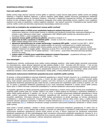 REJESTRACJA SPÓŁKI CYWILNEJ Czym jest spółka cywilna? Spółkę cywilną mogą utworzyć (zawrzeć umowę spółki) co najmniej 2 osoby fizyczne bądź prawne. Spółka cywilna nie podlega rejestracji w Krajowym Rejestrze Sądowym, a jedynie wspólnicy spółki będący osobami fizycznymi prowadzącymi działalność gospodarczą podlegają wpisowi do Centralnej Ewidencji i Informacji o Działalności Gospodarczej (CEIDG). Do rejestracji spółki cywilnej nie jest wymagany kapitał. Za zobowiązania zaciągnięte przez spółkę odpowiadają wszyscy wspólnicy swym majątkiem wspólnym oraz każdy ze wspólników z osobna majątkiem osobistym - bez żadnych ograniczeń. Przedsiębiorcą jest wspólnik spółki cywilnej. Spółka cywilna jest jednostką organizacyjną nieposiadającą osobowości prawnej. Jakie kroki są niezbędne aby zarejestrować umowę spółki cywilnej? 1. uzyskanie wpisu w CEIDG przez wspólników będących osobami fizycznymi (jeżeli działalność będzie wykonywana wyłącznie w formie spółki cywilnej, to wskazane jest określenie przyszłej daty rozpoczęcia działalności we wniosku o wpis i dokonanie zmiany wpisu - uzupełnienie o NIP i REGON spółki cywilnej oraz zaznaczenie pola 25 formularza CEIDG-1, przed wystąpieniem tej daty); 2. zawarcie umowy spółki cywilnej (na piśmie), potrzebna w krokach 3 i 4; 3. zgłoszenie do GUS i uzyskanie nr REGON spółki - wniosek na druku RG-1 składa się we właściwym dla siedziby spółki urzędzie statystycznym (wolny od opłat); 4. zgłoszenie identyfikacyjne do urzędu skarbowego i uzyskanie NIP spółki – wniosek na druku NIP-2 , NIP-D (wolne od opłat), złożenie deklaracji oraz zapłata podatku od czynności cywilnoprawnych w urzędzie skarbowym właściwym ze względu na siedzibę spółki (stawka podatku wynosi 0,5%, podstawę opodatkowania stanowi wartość wkładów wniesionych do majątku spółki) - deklaracja na druku PCC-3, PCC-3A (termin – 14 dni), zgłoszenie rejestracyjne do podatku VAT - formularz VAT-R (opłata skarbowa – 170 zł, termin – przed dniem dokonania pierwszej sprzedaży towarów lub usług); 5. zmiana wpisu w CEIDG przez wspólników będących osobami fizycznymi – uzupełnienie informacji o NIP i REGON spółki - wniosek CEIDG-1 (wolny od opłat, termin – 7 dni). Inne obowiązki! Opodatkowaniu dochodu uzyskiwanego przez spółkę cywilną podlegają wspólnicy. Jeżeli spółka będzie zatrudniać pracowników czy zleceniobiorców, należy dokonać zgłoszenia jej jako płatnika składek w ZUS – formularz ZUS ZPA (termin – 7 dni od dnia powstania obowiązku ubezpieczeń). Wspólnicy spółki dokonują zgłoszenia do ubezpieczeń samodzielnie (płatnikiem jest wspólnik) - formularz ZUS ZUA albo ZUS ZZA. Składka na ubezpieczenie zdrowotne musi być opłacana od każdego rodzaju pozarolniczej działalności (odrębna z tytułu działalności indywidualnej i każdej spółki, w której działalność jest wykonywana). Zawieszenie wykonywania działalności gospodarczej przez wspólnika spółki cywilnej W sytuacji, w której przedsiębiorca wykonuje działalność gospodarczą w różnych formach prawnych, np. w określonych sprawach działa jako przedsiębiorca będący osobą fizyczną, w innych zaś jako wspólnik spółki cywilnej, a dodatkowo prowadzi spółkę jawną, może zawiesić wykonywanie działalności w jednej z tych form. Oznacza to, że jeżeli przedsiębiorca zawiesi wykonywanie indywidualnej działalności gospodarczej jako osoba fizyczna, a jednocześnie jest wspólnikiem spółki cywilnej to zgodnie z art. 14a ust. 2b ustawy o swobodzie działalności gospodarczej (s.d.g.) może wykonywać działalność w ramach umowy spółki cywilnej. Status wpisu w CEIDG informuje o aktywności przedsiębiorcy w zakresie działalności wykonywanej indywidualnie. W przypadku zgłoszenia do CEIDG zawieszenia wykonywania działalności w ramach umowy spółki cywilnej przez przedsiębiorcę – wspólnika spółki cywilnej (pole 26.3 wniosku CEIDG-1) we wpisie w CEIDG pojawia się informacja o zawieszeniu działalności w spółce. Należy jednak zaznaczyć, iż zgodnie z art. 14a ust. 2 s.d.g. w przypadku wykonywania działalności gospodarczej w formie spółki cywilnej zawieszenie wykonywania działalności gospodarczej jest skuteczne pod warunkiem jej zawieszenia przez wszystkich wspólników. Informacja widoczna w CEIDG zostaje wprowadzona na skutek zawartego we wniosku oświadczenia przedsiębiorcy o dokonaniu zawieszenia. Pozostali wspólnicy również powinni dokonać takiej zmiany wpisu, a spółka powinna uprzednio dokonać zgłoszenia zawieszenia w Głównym Urzędzie Statystycznym (formularza RG-1) oraz do właściwego naczelnika urzędu skarbowego (NIP-2). Podobnych formalności wymaga wznowienie wykonywania działalności działalności w ramach umowy spółki cywilnej. Jeżeli chodzi o kwestie podatków i składek w okresie zawieszenia wykonywania działalności gospodarczej, to należy mieć na względzie art. 14a ust. 7 s.d.g. Według tego przepisu w stosunku do zobowiązań o charakterze publicznoprawnym zawieszenie wykonywania działalności gospodarczej wywiera skutki prawne od dnia, w którym rozpoczyna się zawieszenie wykonywania działalności gospodarczej, do dnia poprzedzającego dzień wznowienia wykonywania działalności gospodarczej. Oznacza to, że w okresie zawieszenia, ale tylko w zakresie zawieszonej formy prawnej wykonywanej działalności, przedsiębiorca jest zwolniony od zobowiązań podatkowych oraz zobowiązań z zakresu ubezpieczeń społecznych. Zobacz również: Zasady zawieszania i wznawiania działalności gospodarczej