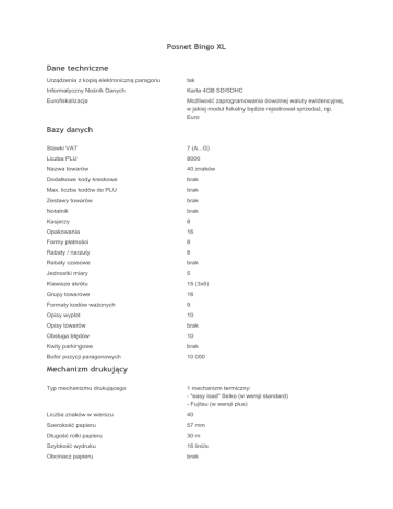 Posnet Bingo XL Dane techniczne Urządzenia z kopią elektroniczną paragonu tak Informatyczny Nośnik Danych Karta 4GB SD/SDHC Eurofiskalizacja Możliwość zaprogramowania dowolnej waluty ewidencyjnej, w jakiej moduł fiskalny będzie rejestrował sprzedaż, np. Euro Bazy danych Stawki VAT 7 (A...G) Liczba PLU 8000 Nazwa towarów 40 znaków Dodatkowe kody kreskowe brak Max. liczba kodów do PLU brak Zestawy towarów brak Notatnik brak Kasjerzy 8 Opakowania 16 Formy płatności 8 Rabaty / narzuty 8 Rabaty czasowe brak Jednostki miary 5 Klawisze skrótu 15 (3x5) Grupy towarowe 16 Formaty kodów ważonych 9 Opisy wypłat 10 Opisy towarów brak Obsługa błędów 10 Kwity parkingowe brak Bufor pozycji paragonowych 10 000 Mechanizm drukujący Typ mechanizmu drukującego 1 mechanizm termiczny: - "easy load" Seiko (w wersji standard) - Fujitsu (w wersji plus) Liczba znaków w wierszu 40 Szerokość papieru 57 mm Długość rolki papieru 30 m Szybkość wydruku 16 linii/s Obcinacz papieru brak Wyświetlacze Wyświetlacz operatora LCD 2x16 alfanumeryczny, podświetlany Wyświetlacz klienta LED8 numeryczny Klawiatura Liczba klawiszy klawiatury 24, w tym 5 programowalnych (3 poziomy) Komunikacja Porty standardowe Ethernet 3 x RS232 1 x USB (skaner kodów kreskowych) Porty dodatkowe 1 x PS2, 2 x RS232 (po zastosowaniu Multipleksera) Szuflada 6V, 12V, 18V, 24V Obsługiwane urządzenia komputer, skaner kodów kreskowych (USB/RS232/PS2), waga, modem GPRS, multiplekser, monitoring, szuflada Komunikacja z komputerem on-line, bez przerywania pracy kasjera Zasilanie Zasilacz zewnętrzny Wbudowany akumulator 230V / 24V zapewniający wydruk min. 6000 linii: AGM 6V / 1,2 Ah (w wersji standard) Li-Ion 7,2V / 5,2Ah (w wersji plus) Ładowarka samochodowa 12V lub 24V Port USB skaner kodów kreskowych (5,2V/ 0,5A) Wymiary, waga, temperatury Wymiary 287 x 105 x 220 mm (szer. x wys. x dł.) Waga ~1,9 kg Zakres temperatur pracy 5 – 40o C Inne Wyposażenie dodatkowe Modem GPRS Szuflada kasowa duża i średnia Multiplekser Pokrowiec Silikonowa osłona klawiatury Najważniejsze funkcje obsługa skanerów kodów kreskowych o interfejsie USB/RS232/PS2 (PS2 przez multiplekser), wydajny akumulator litowo-jonowy pozwalający na długotrwałą pracę, obsługa formatów kodów ważonych dla wag etykietujących, automatyczny odczyt masy z wagi dla towarów ważonych, automatyczne rabaty oraz blokada rabatu dla towarów niskomarżowych, statystyki roczne i tygodniowe dla grup towarowych np. dla alkoholi, łatwa wymiana papieru dzięki mechanizmowi "easy load", integracja z systemami wideomonitoringu sklepowego, kopia elektroniczna paragonu z możliwością archiwizacji danych przez port komunikacyjny Ethernet sygnalizacja konieczności wykonania raportu dobowego, przypomnienie o obowiązkowych raportach okresowych,