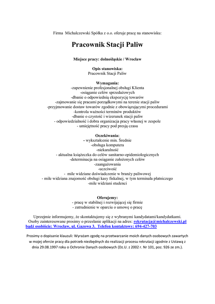Firma Michalczewski Spółka z o.o. oferuje pracę na stanowisku: Pracownik Stacji Paliw Miejsce pracy: dolnośląskie / Wrocław Opis stanowiska: Pracownik Stacji Paliw Wymagania: -zapewnienie profesjonalnej obsługi Klienta -osiąganie celów sprzedażowych -dbanie o odpowiednią ekspozycję towarów -zajmowanie się pracami porządkowymi na terenie stacji paliw -przyjmowanie dostaw towarów zgodnie z obowiązującymi procedurami -kontrola ważności terminów produktów -dbanie o czystość i wizerunek stacji paliw - odpowiedzialność i dobra organizacja pracy własnej w zespole - umiejętność pracy pod presją czasu Oczekiwania: - wykształcenie min. Średnie -obsługa komputera -niekaralność - aktualna książeczka do celów sanitarno-epidemiologicznych -determinacja na osiąganie założonych celów -zaangażowania -uczciwość - mile widziane doświadczenie w branży paliwowej - mile widziana znajomość obsługi kasy fiskalnej, w tym terminala płatniczego -mile widziani studenci Oferujemy: - pracę w stabilnej i rozwijającej się firmie - zatrudnienie w oparciu o umowę o pracę Uprzejmie informujemy, że skontaktujemy się z wybranymi kandydatami/kandydatkami. Osoby zainteresowane prosimy o przesłanie aplikacji na adres: [email protected] bądź osobiście: Wrocław, ul. Gazowa 3. Telefon kontaktowy: 694-427-703 Prosimy o dopisanie klauzuli: Wyrażam zgodę na przetwarzanie moich danych osobowych zawartych w mojej ofercie pracy dla potrzeb niezbędnych do realizacji procesu rekrutacji zgodnie z Ustawą z dnia 29.08.1997 roku o Ochronie Danych osobowych (Dz.U. z 2002 r. Nr 101, poz. 926 ze zm.).