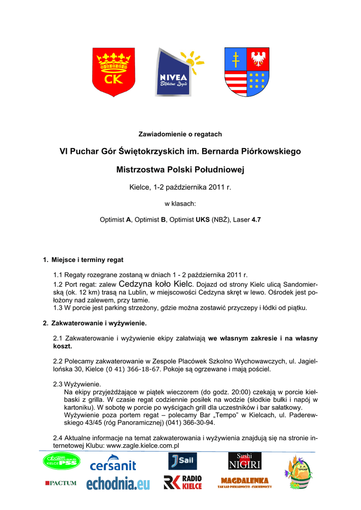 Zawiadomienie o regatach VI Puchar Gór Świętokrzyskich im. Bernarda Piórkowskiego Mistrzostwa Polski Południowej Kielce, 1-2 października 2011 r. w klasach: Optimist A, Optimist B, Optimist UKS (NBŻ), Laser 4.7 1. Miejsce i terminy regat 1.1 Regaty rozegrane zostaną w dniach 1 - 2 października 2011 r. 1.2 Port regat: zalew Cedzyna koło Kielc. Dojazd od strony Kielc ulicą Sandomierską (ok. 12 km) trasą na Lublin, w miejscowości Cedzyna skręt w lewo. Ośrodek jest położony nad zalewem, przy tamie. 1.3 W porcie jest parking strzeżony, gdzie można zostawić przyczepy i łódki od piątku. 2. Zakwaterowanie i wyżywienie. 2.1 Zakwaterowanie i wyżywienie ekipy załatwiają we własnym zakresie i na własny koszt. 2.2 Polecamy zakwaterowanie w Zespole Placówek Szkolno Wychowawczych, ul. Jagiellońska 30, Kielce (0 41) 366-18-67. Pokoje są ogrzewane i mają pościel. 2.3 Wyżywienie. Na ekipy przyjeżdżające w piątek wieczorem (do godz. 20:00) czekają w porcie kiełbaski z grilla. W czasie regat codziennie posiłek na wodzie (słodkie bułki i napój w kartoniku). W sobotę w porcie po wyścigach grill dla uczestników i bar sałatkowy. Wyżywienie poza portem regat – polecamy Bar „Tempo” w Kielcach, ul. Paderewskiego 43/45 (róg Panoramicznej) (041) 366-30-94. 2.4 Aktualne informacje na temat zakwaterowania i wyżywienia znajdują się na stronie internetowej Klubu: www.zagle.kielce.com.pl MAGDALENKA Zakład Piekarniczo -Cukierniczy 3. Organizator regat 3.1 Organizatorem regat jest Uczniowski Klub Żeglarski „Zalew Kielce”, ul. Chodkiewicza 87, 25-139 Kielce, tel. 501 458-100, e-mail: [email protected] 3.2 Współorganizatorem jest Urząd Miejski w Kielcach i Urząd Marszałkowski Województwa Świętokrzyskiego. 4. Program regat Piątek, 30 września 2011 r. godz. 18.00 - 22.00 – przyjazd, rozładunek sprzętu w porcie regat - Cedzyna Wyjazd do miejsca zakwaterowania. Sobota, 1 października 2011 r. godz. 09.00 - 10.00 - przyjmowanie zgłoszeń do regat godz. 10.30 - ceremonia otwarcia regat godz. 10.45 - odprawa kierowników ekip i trenerów godz. 11.30 - start do I wyścigu dnia, następne wyścigi wg. komunikatów Komisji Regatowej Niedziela, 2 października 2011 r. godz. 10.30 - start do I wyścigu dnia, następne wyścigi wg komunikatów Komisji Regatowej, ostatni wyścig rozpocznie się nie później niż o godz.13:30 godz. 15.00 - ceremonia zakończenia regat, wręczenie nagród godz. 17.00 - wyjazd ekip 5. Przepisy Regaty będą rozgrywane zgodnie z Przepisami Regatowymi Żeglarstwa ISAF 2009 – 2012 – wg definicji „przepisy”. 6. Uczestnictwo W regatach mogą uczestniczyć zawodnicy posiadający uprawnienia potwierdzone dokumentami wymienionymi w Informatorze NSKO. 6. Zgłoszenia i termin pierwszego wyścigu 6.1 Zgłoszenia imienne przyjmuje Sędzia Główny Marian Krupa. Zawodników można zgłaszać e-mailem „od teraz” lub w godz. 17.00-19.00 w dniu poprzedzającym pierwszy wyścig oraz w dniu pierwszego wyścigu do godziny 10:00. 7. Kategorie zawodów Regaty, których dotyczy zawiadomienie, będą zawodami kategorii C. 8. Systemy punktacji - ocena wyników 8.1 Stosowane będą systemy punktacji określone w Przepisach Regatowych Żeglarstwa ISAF 2009-2012. 8.2 Planuje się rozegranie 9 wyścigów. 8.3 Regaty będą uznane za ważne przy rozegraniu minimum 3 wyścigów. 8.4 Najgorszy rezultat będzie odrzucany przy rozegraniu minimum 5-ciu wyścigów. 9. Instrukcje żeglugi Instrukcję żeglugi kierownicy ekip otrzymują w dniu wyścigu po dokonaniu zgłoszeń imiennych. 10. Ochrona środowiska MAGDALENKA Zakład Piekarniczo -Cukierniczy Jacht, którego załoga wyrzuci śmieci do wody, może być ukarany decyzją Komisji Regatowej lub Zespołu Protestowego po rozpatrzeniu protestu . 11. Wpisowe do regat wynosi 40 zł od każdego jachtu. 12. Motorówki trenerów Wszystkie łodzie pomocnicze i motorówki trenerów uczestniczących w regatach należy akredytować u organizatora regat. 13. Regulamin nagród. Organizatorzy zapewniają niżej wymienione nagrody: PUCHARY Optimist UKS (cztery komplety pucharów w dwóch kategoriach wiekowych). Optimist Grupa B (trzy pierwsze dziewczynki oraz trzech pierwszych chłopców). Optimist Grupa A (trzech pierwszych zawodników), Laser 4.7 (trzech pierwszych zawodników). Ponadto w Mistrzostwach Polski Południowej medale za miejsca I - X. ŻAGLE „Juszczak” (jeden Klub może otrzymać tylko jeden żagiel) - I pula (dwa żagle OPP Juszczak) – dostają kolejno najliczniej reprezentowane kluby (licząc zawodników klasy Optimist, którzy ukończyli minimum jeden wyścig); jeśli kilka klubów ma tyle samo zawodników, a żagli nie wystarczy dla wszystkich, to żagiel jest między nimi losowany. Przykład 1: Kluby A, B mają po 10 zawodników. Inne Kluby po 9 zawodników. Żagle dostają tylko Kluby A i B. Przykład 2: Klub A (10 zawodników), Klub B (5), Klub C (5), Klub D (5). Żagiel dostaje Klub A, a Kluby B, C i D losują żagiel między sobą. - II pula (jeden żagiel OPP Juszczak) – losowany wśród ekip z minimum pięcioma zawodnikami; wyłączona z losowania jest ekipa gospodarzy i ekipy, które już dostały żagiel. - III pula (jeden żagiel OPP Juszczak) – dla najlepszego zawodnika gospodarzy. drobne upominki rzeczowe losowane wśród zawodników o łącznej wartości ok. 1500 - 2000 zł. W porozumieniu z Sędzią Głównym organizatorzy mogą zastosować inny sposób podziału nagród, np. dopuszczając do losowania żagli ekipy z mniejszą ilością zawodników. MAGDALENKA Zakład Piekarniczo -Cukierniczy