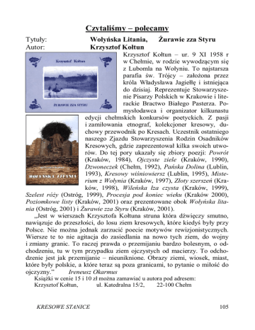 Czytaliśmy – polecamy Tytuły: Autor: Wołyńska Litania, Krzysztof Kołtun Żurawie zza Styru Krzysztof Kołtun – ur. 9 XI 1958 r w Chełmie, w rodzie wywodzącym się z Lubomla na Wołyniu. To najstarsza parafia św. Trójcy – założona przez króla Władysława Jagiełłę i istniejąca do dzisiaj. Reprezentuje Stowarzyszenie Pisarzy Polskich w Krakowie i literackie Bractwo Białego Pasterza. Pomysłodawca i organizator kilkunastu edycji chełmskich konkursów poetyckich. Z pasji i zamiłowania etnograf, kolekcjoner kresowy, duchowy przewodnik po Kresach. Uczestnik ostatniego naszego Zjazdu Stowarzyszenia Rodzin Osadników Kresowych, gdzie zaprezentował kilka swoich utworów. Do tej pory ukazały się zbiory poezji: Powrót (Kraków, 1984), Ojczyste ziele (Kraków, 1990), Dzwoneczek (Chełm, 1992), Pańska Dolina (Lublin, 1993), Kresowy wiśniowiersz (Lublin, 1995), Misterium z Wołynia (Kraków, 1997), Złoty szerszeń (Kraków, 1998), Wileńska łza czysta (Kraków, 1999), Szelest róży (Ostróg, 1999), Procesja pod koniec wieku (Kraków 2000), Poziomkowe listy (Kraków, 2001) oraz prezentowane obok Wołyńska litania (Ostróg, 2001) i Żurawie zza Styru (Kraków, 2001). „Jest w wierszach Krzysztofa Kołtuna struna która dźwięczy smutno, nawiązuje do przeszłości, do losu ziem kresowych, które kiedyś były przy Polsce. Nie można jednak zarzucić poecie motywów rewizjonistycznych. Wiersze te to nie agitacja do zasiedlania na nowo tych ziem, do wojny i zmiany granic. To raczej prawda o przemijaniu bardzo bolesnym, o odchodzeniu, tu w tym przypadku ziem ojczystych od macierzy. To odchodzenie jest jak przemijanie – nieuniknione. Obrazy ziemi, wiosek, miast, które były polskie, a które teraz są poza granicami, to pytanie o miłość do ojczyzny.” Ireneusz Okarmus Książki w cenie 15 i 10 zł można zamawiać u autora pod adresem: Krzysztof Kołtun, ul. Katedralna 15/2, 22-100 Chełm KRESOWE STANICE 105 Tytuł: Autor: Józef Piłsudski (1867-1935) Antoni Lenkiewicz Miłośnicy świetlanej pamięci Wskrzesiciela Polski Niepodległej, I Marszałka Józefa Piłsudskiego, otrzymali w tym roku publikacjędokument, poświęcony temu wspaniałemu Polakowi i Patriocie. Autor książki, dr nauk prawnych i mgr Wydziału HistorycznoFilozoficznego Uniwersytetu Wrocławskiego Antoni Lenkiewicz opracował i wydał dla uczczenia 135 rocznicy urodzin Marszałka książkę pt. Józef Piłsudski, książkę będącą profesjonalnym zbiorem informacji tekstowej, często z unikalnymi zdjęciami i dokumentami przedstawiającymi życie i działalność tego niezwykłego duchem i czynem Polaka-Wodza Legionów. Jest to już kolejne wydanie pod tym tytułem. Wydanie z 1987 roku zostało szybko wyczerpane – przy czym temu wydaniu towarzyszyły okoliczności ciągłego zagrożenia przez UB, jak np. wywieszania materiałów do książki i dokumentów na „sznurku za okno” gdy do drzwi dobijali się esbecy. Trzeba przeczytać przedmowę autora, ukazującą w jakich warunkach powstawało ówczesne wydanie książki. Obecne wydanie A.D. 2002 jest kolejnym, autorskim opracowaniem, rozszerzonym, opartym i uzupełnionym nowymi, często nigdzie nie publikowanymi lub jeszcze nie znanymi faktami, pochodzącymi z wiarygodnych źródeł krajowych i zagranicznych. Czytając książkę „czuje„ się jak wiele trudu i zabiegów musiało towarzyszyć autorowi, by materiał zawarty w książce był oparty na nienaruszalnych faktach i zdarzeniach, jakie towarzyszyły życiu i działalności Józefa Piłsudskiego. Taki pogląd wyrażam jako czytelnik i miłośnik osoby Marszałka. Posiadam wiele książek o Marszałku i Jego działalności. Obecnie, po przeczyta106 KRESOWE STANICE niu 270 stronicowej książki dr Lenkiewicza mogę stwierdzić, że całą dotychczasową bibliografię o Marszałku może zastąpić ta wspaniałe książka, napisana „ciepłym” i w dobrej polszczyźnie języku. Osobiście jestem szczerze wdzięczny autorowi za tę książkę, prawdziwie czytelniczą ucztę bibliograficzną. Tym, którzy interesują się życiem i działalnością J. Piłsudskiego a szczególnie wielbicielom tej chwalebnej postaci, gorąco zachęcam do lektury miłej sercu każdego Polaka, lektury dla uczczenia 67 rocznicy odejścia na wieczną wartę (12 V 1935) Wskrzesiciela Polski, wielkiego Męża Stanu. Zapewniam, naprawdę warto mieć tę książkę w swoim księgozbiorze, polecam szczególnie nam, kresowiakom, którzy tak wiele zawdzięczają tej niezwykłej postaci pod każdym względem. Książkę w cenie 40 zł zamawiać można pod poniższym adresem: ul. Wieczysta 77/33, 50-550 Wrocław. Nr konta PKO III O/Wrocław 56 10205242-12831 0069 Tel./fax 336-70-44, e-mail: [email protected] Jerzy Szymański KRESOWE STANICE 107