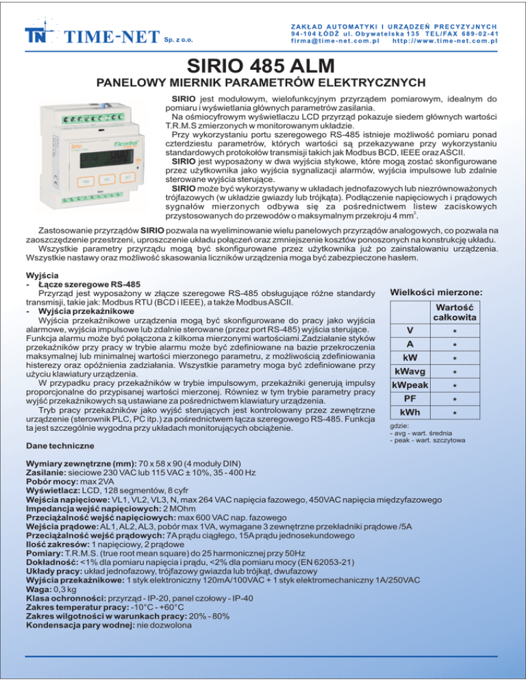 SIRIO 485 ALM PANELOWY MIERNIK PARAMETRÓW ELEKTRYCZNYCH SIRIO jest modu³owym, wielofunkcyjnym przyrz¹dem pomiarowym, idealnym do pomiaru i wyœwietlania g³ównych parametrów zasilania. Na oœmiocyfrowym wyœwietlaczu LCD przyrz¹d pokazuje siedem g³ównych wartoœci T.R.M.S zmierzonych w monitorowanym uk³adzie. Przy wykorzystaniu portu szeregowego RS-485 istnieje mo¿liwoœæ pomiaru ponad czterdziestu parametrów, których wartoœci s¹ przekazywane przy wykorzystaniu standardowych protoko³ów transmisji takich jak Modbus BCD, IEEE oraz ASCII. SIRIO jest wyposa¿ony w dwa wyjœcia stykowe, które mog¹ zostaæ skonfigurowane przez u¿ytkownika jako wyjœcia sygnalizacji alarmów, wyjœcia impulsowe lub zdalnie sterowane wyjœcia steruj¹ce. SIRIO mo¿e byæ wykorzystywany w uk³adach jednofazowych lub niezrównowa¿onych trójfazowych (w uk³adzie gwiazdy lub trójk¹ta). Pod³¹czenie napiêciowych i pr¹dowych sygna³ów mierzonych odbywa siê za poœrednictwem listew zaciskowych 2 przystosowanych do przewodów o maksymalnym przekroju 4 mm . Zastosowanie przyrz¹dów SIRIO pozwala na wyeliminowanie wielu panelowych przyrz¹dów analogowych, co pozwala na zaoszczêdzenie przestrzeni, uproszczenie uk³adu po³¹czeñ oraz zmniejszenie kosztów ponoszonych na konstrukcjê uk³adu. Wszystkie parametry przyrz¹du mog¹ byæ skonfigurowane przez u¿ytkownika ju¿ po zainstalowaniu urz¹dzenia. Wszystkie nastawy oraz mo¿liwoœæ skasowania liczników urz¹dzenia moga byæ zabezpieczone has³em. Wyjœcia - £¹cze szeregowe RS-485 Przyrz¹d jest wyposa¿ony w z³¹cze szeregowe RS-485 obs³uguj¹ce ró¿ne standardy transmisji, takie jak: Modbus RTU (BCD i IEEE), a tak¿e Modbus ASCII. - Wyjœcia przekaŸnikowe Wyjœcia przekaŸnikowe urz¹dzenia mog¹ byæ skonfigurowane do pracy jako wyjœcia alarmowe, wyjœcia impulsowe lub zdalnie sterowane (przez port RS-485) wyjœcia steruj¹ce. Funkcja alarmu mo¿e byæ po³¹czona z kilkoma mierzonymi wartoœciami.Zadzia³anie styków przekaŸników przy pracy w trybie alarmu mo¿e byæ zdefiniowane na bazie przekroczenia maksymalnej lub minimalnej wartoœci mierzonego parametru, z mo¿liwoœci¹ zdefiniowania histerezy oraz opóŸnienia zadzia³ania. Wszystkie parametry moga byæ zdefiniowane przy u¿yciu klawiatury urz¹dzenia. W przypadku pracy przekaŸników w trybie impulsowym, przekaŸniki generuj¹ impulsy proporcjonalne do przypisanej wartoœci mierzonej. Równiez w tym trybie parametry pracy wyjœæ przekaŸnikowych s¹ ustawiane za poœrednictwem klawiatury urz¹dzenia. Tryb pracy przekaŸników jako wyjœæ steruj¹cych jest kontrolowany przez zewnêtrzne urz¹dzenie (sterownik PLC, PC itp.) za poœrednictwem ³¹cza szeregowego RS-485. Funkcja ta jest szczególnie wygodna przy uk³adach monitoruj¹cych obci¹¿enie. Dane techniczne Wielkoœci mierzone: gdzie: - avg - wart. œrednia - peak - wart. szczytowa Wymiary zewnêtrzne (mm): 70 x 58 x 90 (4 modu³y DIN) Zasilanie: sieciowe 230 VAC lub 115 VAC ± 10%, 35 - 400 Hz Pobór mocy: max 2VA Wyœwietlacz: LCD, 128 segmentów, 8 cyfr Wejœcia napiêciowe: VL1, VL2, VL3, N, max 264 VAC napiêcia fazowego, 450VAC napiêcia miêdzyfazowego Impedancja wejœæ napiêciowych: 2 MOhm Przeci¹¿alnoœæ wejœæ napiêciowych: max 600 VAC nap. fazowego Wejœcia pr¹dowe: AL1, AL2, AL3, pobór max 1VA, wymagane 3 zewnêtrzne przek³adniki pr¹dowe /5A Przeci¹¿alnoœæ wejœæ pr¹dowych: 7A pr¹du ci¹g³ego, 15A pr¹du jednosekundowego Iloœæ zakresów: 1 napiêciowy, 2 pr¹dowe Pomiary: T.R.M.S. (true root mean square) do 25 harmonicznej przy 50Hz Dok³adnoœæ: <1% dla pomiaru napiêcia i pr¹du, <2% dla pomiaru mocy (EN 62053-21) Uk³ady pracy: uk³ad jednofazowy, trójfazowy gwiazda lub trójk¹t, dwufazowy Wyjœcia przekaŸnikowe: 1 styk elektroniczny 120mA/100VAC + 1 styk elektromechaniczny 1A/250VAC Waga: 0,3 kg Klasa ochronnoœci: przyrz¹d - IP-20, panel czo³owy - IP-40 Zakres temperatur pracy: -10°C - +60°C Zakres wilgotnoœci w warunkach pracy: 20% - 80% Kondensacja pary wodnej: nie dozwolona