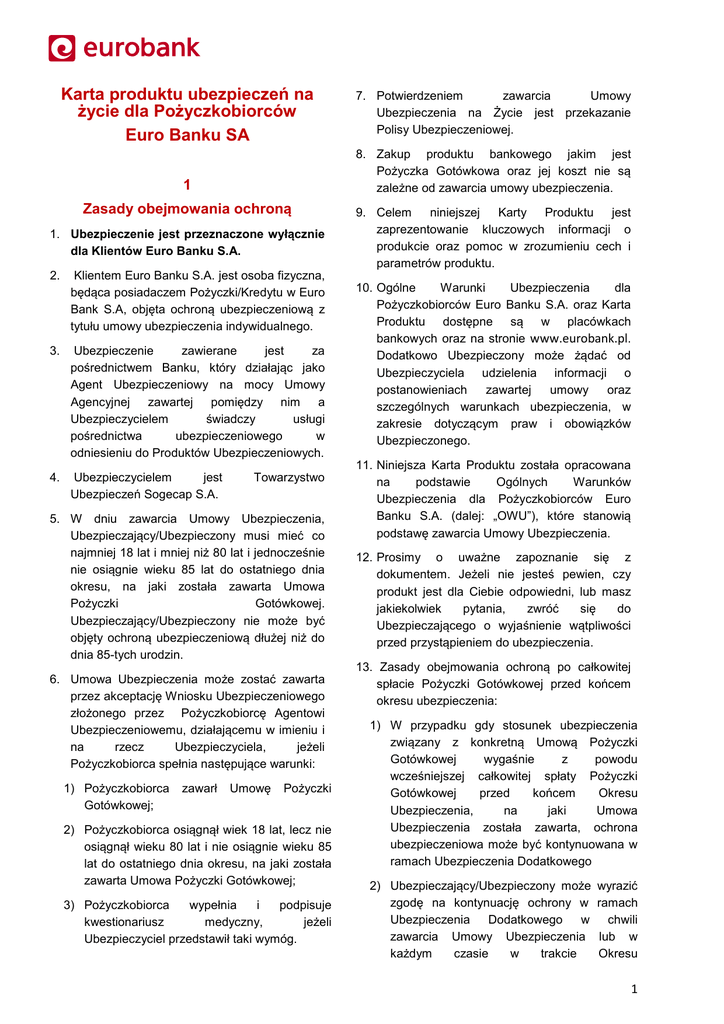 Karta produktu ubezpieczeń na życie dla Pożyczkobiorców Euro Banku SA 8. Zakup produktu bankowego jakim jest Pożyczka Gotówkowa oraz jej koszt nie są zależne od zawarcia umowy ubezpieczenia. 1 Zasady obejmowania ochroną 1. Ubezpieczenie jest przeznaczone wyłącznie dla Klientów Euro Banku S.A. 2. Klientem Euro Banku S.A. jest osoba fizyczna, będąca posiadaczem Pożyczki/Kredytu w Euro Bank S.A, objęta ochroną ubezpieczeniową z tytułu umowy ubezpieczenia indywidualnego. 3. Ubezpieczenie zawierane jest za pośrednictwem Banku, który działając jako Agent Ubezpieczeniowy na mocy Umowy Agencyjnej zawartej pomiędzy nim a Ubezpieczycielem świadczy usługi pośrednictwa ubezpieczeniowego w odniesieniu do Produktów Ubezpieczeniowych. 4. Ubezpieczycielem jest Ubezpieczeń Sogecap S.A. Towarzystwo 5. W dniu zawarcia Umowy Ubezpieczenia, Ubezpieczający/Ubezpieczony musi mieć co najmniej 18 lat i mniej niż 80 lat i jednocześnie nie osiągnie wieku 85 lat do ostatniego dnia okresu, na jaki została zawarta Umowa Pożyczki Gotówkowej. Ubezpieczający/Ubezpieczony nie może być objęty ochroną ubezpieczeniową dłużej niż do dnia 85-tych urodzin. 6. Umowa Ubezpieczenia może zostać zawarta przez akceptację Wniosku Ubezpieczeniowego złożonego przez Pożyczkobiorcę Agentowi Ubezpieczeniowemu, działającemu w imieniu i na rzecz Ubezpieczyciela, jeżeli Pożyczkobiorca spełnia następujące warunki: 1) Pożyczkobiorca Gotówkowej; zawarł 7. Potwierdzeniem zawarcia Umowy Ubezpieczenia na Życie jest przekazanie Polisy Ubezpieczeniowej. Umowę Pożyczki 2) Pożyczkobiorca osiągnął wiek 18 lat, lecz nie osiągnął wieku 80 lat i nie osiągnie wieku 85 lat do ostatniego dnia okresu, na jaki została zawarta Umowa Pożyczki Gotówkowej; 3) Pożyczkobiorca wypełnia i podpisuje kwestionariusz medyczny, jeżeli Ubezpieczyciel przedstawił taki wymóg. 9. Celem niniejszej Karty Produktu jest zaprezentowanie kluczowych informacji o produkcie oraz pomoc w zrozumieniu cech i parametrów produktu. 10. Ogólne Warunki Ubezpieczenia dla Pożyczkobiorców Euro Banku S.A. oraz Karta Produktu dostępne są w placówkach bankowych oraz na stronie www.eurobank.pl. Dodatkowo Ubezpieczony może żądać od Ubezpieczyciela udzielenia informacji o postanowieniach zawartej umowy oraz szczególnych warunkach ubezpieczenia, w zakresie dotyczącym praw i obowiązków Ubezpieczonego. 11. Niniejsza Karta Produktu została opracowana na podstawie Ogólnych Warunków Ubezpieczenia dla Pożyczkobiorców Euro Banku S.A. (dalej: „OWU”), które stanowią podstawę zawarcia Umowy Ubezpieczenia. 12. Prosimy o uważne zapoznanie się z dokumentem. Jeżeli nie jesteś pewien, czy produkt jest dla Ciebie odpowiedni, lub masz jakiekolwiek pytania, zwróć się do Ubezpieczającego o wyjaśnienie wątpliwości przed przystąpieniem do ubezpieczenia. 13. Zasady obejmowania ochroną po całkowitej spłacie Pożyczki Gotówkowej przed końcem okresu ubezpieczenia: 1) W przypadku gdy stosunek ubezpieczenia związany z konkretną Umową Pożyczki Gotówkowej wygaśnie z powodu wcześniejszej całkowitej spłaty Pożyczki Gotówkowej przed końcem Okresu Ubezpieczenia, na jaki Umowa Ubezpieczenia została zawarta, ochrona ubezpieczeniowa może być kontynuowana w ramach Ubezpieczenia Dodatkowego 2) Ubezpieczający/Ubezpieczony może zgodę na kontynuację ochrony w Ubezpieczenia Dodatkowego w zawarcia Umowy Ubezpieczenia każdym czasie w trakcie wyrazić ramach chwili lub w Okresu 1 Ubezpieczenia aż do dnia momentu dokonania wcześniejszej całkowitej spłaty Pożyczki Gotówkowej. 3) Zgoda Ubezpieczającego/Ubezpieczonego na objęcie Ubezpieczeniem Dodatkowym może zostać w każdej chwili odwołana. 4) Jeśli Ubezpieczający/Ubezpieczony wyrazi zgodę na objęcie Ubezpieczeniem Dodatkowym i jej nie odwoła, Ubezpieczenie Dodatkowe zostanie uruchomione w chwili wcześniejszej całkowitej spłaty Pożyczki Gotówkowej w następującym zakresie: a) jeżeli w czasie trwania Umowy Pożyczki Gotówkowej, Pożyczkobiorca był ubezpieczony przez Ubezpieczyciela wyłącznie w zakresie ryzyka Śmierci (w tym Śmierci wskutek Nieszczęśliwego Wypadku) oraz Trwałej i Całkowitej Niepełnosprawności, Ubezpieczenie Dodatkowe będzie obejmowało ryzyko Śmierci (z wyłączeniem Śmierci wskutek Nieszczęśliwego Wypadku); b) jeżeli w czasie trwania Umowy Pożyczki Gotówkowej, Pożyczkobiorca był ubezpieczony przez Ubezpieczyciela w zakresie ryzyka Śmierci (w tym Śmierci wskutek Nieszczęśliwego Wypadku), Trwałej i Całkowitej Niepełnosprawności a także dodatkowo w zakresie ryzyka Tymczasowej Całkowitej Niezdolności do Pracy lub Poważnego Zachorowania, Ubezpieczenie Dodatkowe będzie obejmowało ryzyko Śmierci (w tym Śmierci wskutek Nieszczęśliwego Wypadku). 5) Ochrona w ramach Ubezpieczenia Dodatkowego zostanie uruchomiona tylko wtedy, gdy: a) w dniu wcześniejszej całkowitej spłaty Pożyczki Gotówkowej, Ubezpieczający/Ubezpieczony nie będzie podlegał innemu Ubezpieczeniu Dodatkowemu Ubezpieczyciela obejmującemu ryzyka określone w art. 3 OWU; b) Suma Ubezpieczenia dla Ubezpieczenia Dodatkowego obliczana jest w sposób określony w rozdziale VI i jest równa lub wyższa niż 1000 zł. 6) Niezwłocznie, lecz nie później niż w ciągu 14 dni od dnia wcześniejszej całkowitej spłaty Pożyczki Gotówkowej, Agent Ubezpieczeniowy w imieniu Ubezpieczyciela przekazuje dokument potwierdzający uruchomienie ochrony w ramach Ubezpieczenia Dodatkowego. 2 Obowiązki Banku wobec Ubezpieczającego Bank zobowiązany jest wobec Ubezpieczającego między innymi: 1. do przedstawiania informacji/dokumentacji dotyczących Umowy Ubezpieczenia przed jej zawarciem, w tym Ogólnych Warunków Umowy Ubezpieczenia oraz Karty Produktu, 2. do pomocy Ubezpieczającemu w zawarciu Umowy Ubezpieczenia, 3. w przypadku wystąpienia Zdarzenia Ubezpieczeniowego, do informowania osób zgłaszających roszczenie o dokumentach i