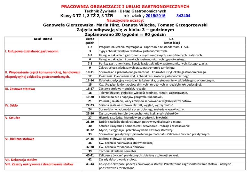 PRACOWNIA ORGANIZACJI I USŁUG GASTRONOMICZNYCH Technik Żywienia i Usług Gastronomicznych Klasy 3 TŻ 1, 3 TŻ 2, 3 TŻR rok szkolny 2015/2016 343404 Nauczyciele uczący: Genowefa Gierszewska, Maria Hinz, Danuta Wiecka, Tomasz Grzegorzewski Zajęcia odbywają się w bloku 3 – godzinnym Zaplanowano 30 tygodni = 90 godzin Dział - moduł I. Usługowa działalność gastronomii. II. Wyposażenie części konsumenckiej, handlowej i ekspedycyjnej zakładów gastronomicznych. III. Zastawa stołowa IV. Szkło V. Sztućce VI. Bielizna stołowa VII. Dekoracja stołów VIII. Zasady nakrywania i dekorowania stołów Liczba godzin 1-2 3 4-5 6 7-8 9 10-11 12 13-14 15 16-17 18 19-20 21 22-23 24 25-26 27 28-29 30 31-32 33 34-35 36 37-38 39 40-41 42 43-44 L.p. Temat lekcji Program nauczania. Wymagania i zapoznanie ze standardami I PSO. Typy i charakterystyka zakładów gastronomicznych. Usługi w zakładach gastronomicznych centralnych, samodzielnych i zależnych. Usługi w zakładach i punktach gastronomicznych typu otwartego. Punkty gastronomiczne. Specjalizacja zakładów gastronomicznych. Kategoryzacja. Zakres usług świadczonych przez gastronomię zamkniętą. Sprawdzian z przerobionego materiału. Charakter i styl lokalu gastronomicznego. Ćwiczenia: Planowanie stylu i charakteru zakładu gastronomicznego. Dział ekspedycyjny – rozdzielnia kelnerska, usytuowanie w zakładzie gastronomicznym. Ćw. Urządzenia do napojów zimnych i mrożonych w rozdzielni ekspedycyjnej. Zastawa stołowa – podział, rodzaje. Talerze płaskie i głębokie: wielkość średnice, kształt, zastosowanie. Filiżanki do zup i napojów gorących. Bulionówki. Półmiski, salaterki, wazy i misy do serwowania większej liczby potraw. Szklana zastawa stołowa. Kształt, wygląd, wytrzymałość. Sprawdzian wiadomości z przerobionego materiału –praktyczny. Zastosowanie tumblerów, pucharków i szklanych dzbanków. Historia sztućców. Materiały do produkcji. Trwałość. Dobór sztućców do określonych potraw wynikających z menu. Sztućce klasyczne i pomocnicze i serwisowe - rodzaje i zastosowanie. Mycie, pielęgnacja i przechowywanie zastawy stołowej. Sprawdzian praktyczny z przerobionego materiału. Zaliczenie ćwiczeń praktycznych. Bielizna stołowa i jej cechy. Ćw. Techniki nakrywania stołów bielizną. Ćw. Techniki rozkładania obrusów. Techniki składania serwetek. Zaliczenie ćwiczeń praktycznych z bielizny stołowej i serwet. Zasady dekorowania stołów. Kolejność czynności podczas nakrywania stołów. Przestrzenne zagospodarowanie stołów – nakrycie podstawowe i rozszerzone. IX. Karty menu X. Techniki obsługi XI. Serwowanie potraw i napojów XII. Podawanie napojów alkoholowych do określonych potraw. XIII. Bar – miejsce pracy barmana. 45 46-47 48 49-50 51 52-53 54 55-56 57 58-59 60 61-62 63 64-65 66 67-68 69 70-71 72 73-74 75 76-77 78 79-80 81 82-83 84 85-86 87 88-89 90 Klasyfikacja, wymogi formalne, rodzaje i funkcje kart menu. Standardowe typy kart menu układ. Test sprawdzający z przerobionego materiału. Samoobsługa w zakładach gastronomicznych. Bufety, podział, wyposażenie. Obsługa kelnerska, systemy obsługi. Przebieg obsługi. Zamówienia, zapisywanie, metody zapamiętywania Kolejność podawania potraw i napojów. Serwis niemiecki i francuski. Serwis talerzowy. Test sprawdzający z działu Serwowanie przystawek i zup Serwowanie dań głównych. Serwowanie deserów. Klasyfikacja. Nakrycia do deserów. Serwowanie napojów bezalkoholowych. Serwowanie napojów alkoholowych Test praktyczny z serwowania dań i napojów. Karta win i wódek jako samodzielna oferta. Napoje mieszane i bezalkoholowe. Techniki podawania piwa, wina wódki, szampana. Dobór alkoholi do potraw. Rozwiązywania zadania praktycznego – projekt 1. Analiza klucza do zadania praktycznego. Wyposażenie baru, podstawowe akcesoria, szkło barowe. Sylwetka i etyka barowa. Shaker – rodzaje. Ćwiczenia: obsługa shakera, mieszanie, nalewanie drinków, serwowanie dekoracja. Przybory do dekoracji napojów alkoholowych i bezalkoholowych. Szkło barowe, wielkość, kształty. Kategorie napojów mieszanych i ich charakterystyka. Łączenie składników do napojów. Receptury. Podsumowanie przerobionego materiału.
