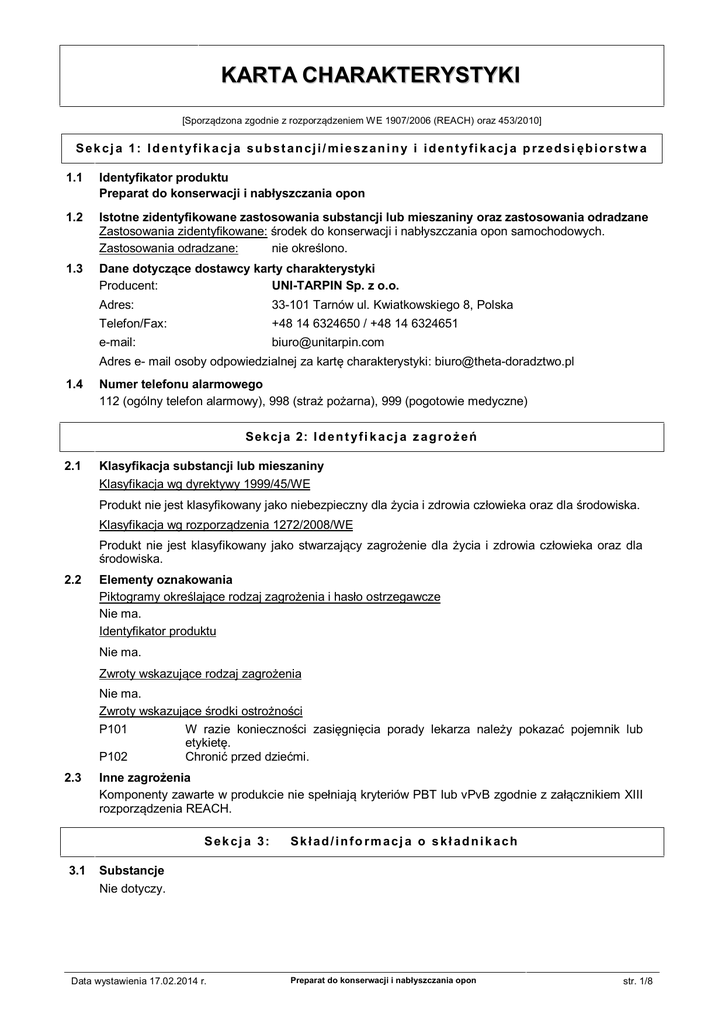 KARTA CHARAKTERYSTYKI [Sporz dzona zgodnie z rozporz dzeniem WE 1907/2006 (REACH) oraz 453/2010] Sekcj a 1: Id entyfikacja substancji/ mieszaniny i identyfi kacj a przedsi biorstw a 1.1 Identyfikator produktu Preparat do konserwacji i nab yszczania opon 1.2 Istotne zidentyfikowane zastosowania substancji lub mieszaniny oraz zastosowania odradzane Zastosowania zidentyfikowane: rodek do konserwacji i nab yszczania opon samochodowych. Zastosowania odradzane: nie okre lono. 1.3 Dane dotycz ce dostawcy karty charakterystyki Producent: UNI-TARPIN Sp. z o.o. Adres: 33-101 Tarnów ul. Kwiatkowskiego 8, Polska Telefon/Fax: +48 14 6324650 / +48 14 6324651 e-mail: [email protected] Adres e- mail osoby odpowiedzialnej za kart charakterystyki: [email protected] 1.4 Numer telefonu alarmowego 112 (ogólny telefon alarmowy), 998 (stra po arna), 999 (pogotowie medyczne) Sekcj a 2: I d e n t y f i k a c j a z a g r o 2.1 Klasyfikacja substancji lub mieszaniny Klasyfikacja wg dyrektywy 1999/45/WE Produkt nie jest klasyfikowany jako niebezpieczny dla ycia i zdrowia cz owieka oraz dla rodowiska. Klasyfikacja wg rozporz dzenia 1272/2008/WE Produkt nie jest klasyfikowany jako stwarzaj cy zagro enie dla ycia i zdrowia cz owieka oraz dla rodowiska. 2.2 Elementy oznakowania Piktogramy okre laj ce rodzaj zagro enia i has o ostrzegawcze Nie ma. Identyfikator produktu Nie ma. Zwroty wskazuj ce rodzaj zagro enia Nie ma. Zwroty wskazuj ce rodki ostro no ci P101 W razie konieczno ci zasi gni cia porady lekarza nale y pokaza etykiet . P102 Chroni przed dzie mi. 2.3 Inne zagro enia Komponenty zawarte w produkcie nie spe niaj kryteriów PBT lub vPvB zgodnie z za cznikiem XIII rozporz dzenia REACH. Sekcj a 3: 3.1 pojemnik lub Sk ad/info rmacj a o sk adnikach Substancje Nie dotyczy. Data wystawienia 17.02.2014 r. Preparat do konserwacji i nab yszczania opon str. 1/8 KARTA CHARAKTERYSTYKI 3.2 Mieszaniny N-tlenek etoksylowanej alkiloaminy Zakres st : < 1% Numer CAS: 68071-48-7 Numer WE: 500-186-8 Numer rejestracji w ciwej: Klasyfikacja wg 67/548/EWG: substancja podlega przepisom okresu przej ciowego Xi R36 Klasyfikacja wg 1272/2008/WE: Eye Irrit. 2 H319 mieszanina poreakcyjna 5-chloro-2-metylo-2H-izotiazol-3-onu [nr WE 247-500-7] i 2-metylo-2Hizotiazol-3-onu [nr WE 220-239-6] (3:1) Zakres st : < 0,0015% Numer CAS: 55965-84-9 Numer WE: - Numer rejestracji w ciwej: substancja podlega przepisom okresu przej ciowego Klasyfikacja wg 67/548/EWG: T R23/24/25, C R34, R43, N R50/53 Klasyfikacja wg 1272/2008/WE: Acute Tox. 3 H331, Acute Tox. 3 H311, Acute Tox. 3 H301, Skin Corr. 1B H314, Skin Sens. 1 H317, Aquatic Acute 1 H400, Aquatic Chronic 1 H410 Pe en tekst zwrotów R i H przytoczony zosta w sekcji 16 karty. Sekcj a 4: rodki pi erw szej po mocy 4.1 Opis rodków pierwszej pomocy W kontakcie ze skór : nara one partie skóry przemywa dok adnie wod z myd em przez co najmniej 15 min. Zdj zanieczyszczon odzie . Upra odzie przed ponownym u yciem. W razie wyst pienia niepokoj cych objawów skonsultowa si z lekarzem. W kontakcie z oczami: wyj szk a kontaktowe. Zanieczyszczone oczy przep ukiwa dok adnie wod przez co najmniej 15 min. Unika silnego strumienia wody - ryzyko uszkodzenia rogówki. W razie wyst pienia niepokoj cych objawów skonsultowa si z lekarzem okulist . W przypadku spo ycia: nie prowokowa wymiotów. Wyp uka usta wod . Nigdy nie podawa niczego do ust osobie nieprzytomnej. Natychmiast skonsultowa si z lekarzem, pokaza opakowanie lub etykiet . Po nara eniu drog oddechow : wyprowadzi poszkodowanego na wie e powietrze, zapewni ciep o i spokój. W razie wyst pienia niepokoj cych objawów skonsultowa si z lekarzem. 4.2 Najwa niejsze ostre i opó nione objawy oraz skutki nara enia W kontakcie ze skór : w przypadku cz stego lub d ugotrwa ego kontaktu mo liwe zaczerwienienie, wysuszenie, p kanie skóry, odt uszczenie. W kontakcie z oczami: mo liwe zaczerwienienie, zawienie, niewielkie podra nienie. Po po kni ciu: mo liwe bóle brzucha, wymioty, nudno ci, biegunka. Po inhalacji: nie oczekuje si negatywnych skutków zdrowotnych. 4.3 Wskazania dotycz ce wszelkiej natychmiastowej pomocy lekarskiej i szczególnego post powania z poszkodowanym Decyzj o sposobie post powania ratunkowego podejmuje lekarz po dok adnej ocenie stanu poszkodowanego. Sekcja 5: 5.1 Post powanie w przyp adku po aru rodki ga nicze Odpowiednie rodki ga nicze: produkt niepalny. Dostosowa rodek ga niczy do materia ów magazynowanych w najbli szym otoczeniu. Niew ciwe rodki ga nicze: zwarty strumie wody – niebezpiecze stwo rozprzestrzenienia po aru. Data wystawienia 17.02.2014 r. Preparat do konserwacji i nab yszczania opon str. 2/8 KARTA CHARAKTERYSTYKI 5.2 Szczególne zagro enia zwi zane z substancj lub mieszanin Podczas spalania mog tworzy si szkodliwe gazy zawieraj ce m.in. tlenki w gla oraz inne niezidentyfikowane produkty pirolizy. Unika wdychania produktów spalania, mog stwarza zagro enie dla zdrowia. 5.3 Informacje dla stra y po arnej rodki ochrony ogólnej typowe w przypadku po aru. Nie nale y przebywa w zagro onej ogniem strefie bez odpowiedniego ubrania odpornego na chemikalia i aparatu do oddychania z niezale nym obiegiem powietrza. Zagro one ogniem pojemniki ch odzi z bezpiecznej odleg ci rozpylonym strumieniem wody. Nie dopu ci do przedostania si wody ga niczej do kanalizacji i uj wód. Sekcj a 6: P o s t p o w a n i e w p r z y p a d k u n i e z a m i e r z o n e g o u w o l n i e n i a d o rodowiska 6.1 Indywidualne rodki ostro no ci, wyposa enie ochronne i procedury w sytuacjach awaryjnych Ograniczy dost p osób postronnych do obszaru awarii do czasu zako czenia odpowiednich operacji oczyszczania. Dopilnowa , aby usuwanie awarii i jej skutków przeprowadza wy cznie przeszkolony personel. W przypadku du ych wycieków odizolowa zagro ony obszar. Unika zanieczyszczenia skóry i oczu. Zapewni odpowiedni wentylacj . Unika wdychania oparów. Nosi ciwe wyposa enie ochrony osobistej. 6.2 rodki ostro no ci w zakresie ochrony rodowiska W przypadku uwolnienia