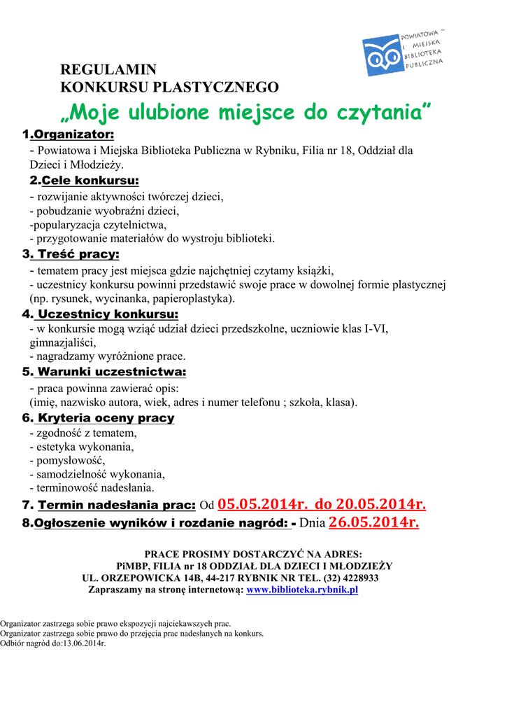 REGULAMIN KONKURSU PLASTYCZNEGO „Moje ulubione miejsce do czytania” 1.Organizator: - Powiatowa i Miejska Biblioteka Publiczna w Rybniku, Filia nr 18, Oddział dla Dzieci i Młodzieży. 2.Cele konkursu: - rozwijanie aktywności twórczej dzieci, - pobudzanie wyobraźni dzieci, -popularyzacja czytelnictwa, - przygotowanie materiałów do wystroju biblioteki. 3. Treść pracy: - tematem pracy jest miejsca gdzie najchętniej czytamy książki, - uczestnicy konkursu powinni przedstawić swoje prace w dowolnej formie plastycznej (np. rysunek, wycinanka, papieroplastyka). 4. Uczestnicy konkursu: - w konkursie mogą wziąć udział dzieci przedszkolne, uczniowie klas I-VI, gimnazjaliści, - nagradzamy wyróżnione prace. 5. Warunki uczestnictwa: - praca powinna zawierać opis: (imię, nazwisko autora, wiek, adres i numer telefonu ; szkoła, klasa). 6. Kryteria oceny pracy - zgodność z tematem, - estetyka wykonania, - pomysłowość, - samodzielność wykonania, - terminowość nadesłania. 7. Termin nadesłania prac: Od 05.05.2014r. do 20.05.2014r. 8.Ogłoszenie wyników i rozdanie nagród: - Dnia 26.05.2014r. PRACE PROSIMY DOSTARCZYĆ NA ADRES: PiMBP, FILIA nr 18 ODDZIAŁ DLA DZIECI I MŁODZIEŻY UL. ORZEPOWICKA 14B, 44-217 RYBNIK NR TEL. (32) 4228933 Zapraszamy na stronę internetową: www.biblioteka.rybnik.pl Organizator zastrzega sobie prawo ekspozycji najciekawszych prac. Organizator zastrzega sobie prawo do przejęcia prac nadesłanych na konkurs. Odbiór nagród do:13.06.2014r.