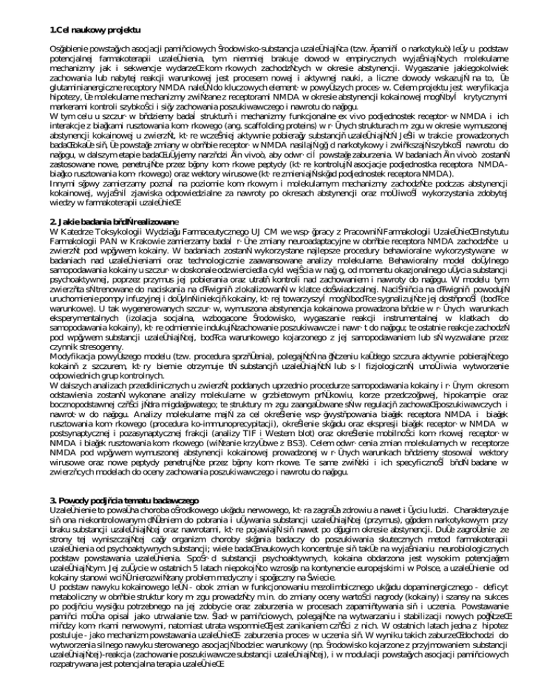 1.Cel naukowy projektu Osłabienie powstałych asocjacji pamięciowych środowisko-substancja uzależniająca (tzw. „pamięć o narkotyku”) leży u podstaw potencjalnej farmakoterapii uzależnienia, tym niemniej brakuje dowodów empirycznych wyjaśniających molekularne mechanizmy jak i sekwencje wydarzeń komórkowych zachodzących w okresie abstynencji. Wygaszanie jakiegokolwiek zachowania lub nabytej reakcji warunkowej jest procesem nowej i aktywnej nauki, a liczne dowody wskazują na to, że glutaminianergiczne receptory NMDA należą do kluczowych elementów powyższych procesów. Celem projektu jest weryfikacja hipotezy, że molekularne mechanizmy związane z receptorami NMDA w okresie abstynencji kokainowej mogą być krytycznymi markerami kontroli szybkości i siły zachowania poszukiwawczego i nawrotu do nałogu. W tym celu u szczurów będziemy badać strukturę i mechanizmy funkcjonalne ex vivo podjednostek receptorów NMDA i ich interakcje z białkami rusztowania komórkowego (ang. scaffolding proteins) w różnych strukturach mózgu w okresie wymuszonej abstynencji kokainowej u zwierząt, które wcześniej aktywnie pobierały substancję uzależniającą. Jeśli w trakcie prowadzonych badań okaże się, że powstałe zmiany w obrębie receptorów NMDA nasilają głód narkotykowy i zwiększają szybkość nawrotu do nałogu, w dalszym etapie badań użyjemy narzędzi „in vivo”, aby odwrócić powstałe zaburzenia. W badaniach „in vivo” zostaną zastosowane nowe, penetrujące przez błony komórkowe peptydy (które kontrolują asocjacje podjednostka receptora NMDAbiałko rusztowania komórkowego) oraz wektory wirusowe (które zmieniają skład podjednostek receptora NMDA). Innymi słowy zamierzamy poznać na poziomie komórkowym i molekularnym mechanizmy zachodzące podczas abstynencji kokainowej, wyjaśnić zjawiska odpowiedzialne za nawroty po okresach abstynencji oraz możliwość wykorzystania zdobytej wiedzy w farmakoterapii uzależnień. 2. Jakie badania będą realizowane W Katedrze Toksykologii Wydziału Farmaceutycznego UJ CM we współpracy z Pracownią Farmakologii Uzależnień Instytutu Farmakologii PAN w Krakowie zamierzamy badać różne zmiany neuroadaptacyjne w obrębie receptora NMDA zachodzące u zwierząt pod wpływem kokainy. W badaniach zostaną wykorzystane najlepsze procedury behawioralne wykorzystywane w badaniach nad uzależnieniami oraz technologicznie zaawansowane analizy molekularne. Behawioralny model dożylnego samopodawania kokainy u szczurów doskonale odzwierciedla cykl wejścia w nałóg, od momentu okazjonalnego użycia substancji psychoaktywnej, poprzez przymus jej pobierania oraz utratę kontroli nad zachowaniem i nawroty do nałogu. W modelu tym zwierzęta są trenowane do naciskania na dźwignię zlokalizowaną w klatce doświadczalnej. Naciśnięcia na dźwignię powodują uruchomienie pompy infuzyjnej i dożylną iniekcję kokainy, której towarzyszyć mogą bodźce sygnalizujące jej dostępność (bodźce warunkowe). U tak wygenerowanych szczurów, wymuszona abstynencja kokainowa prowadzona będzie w różnych warunkach eksperymentalnych (izolacja socjalna, wzbogacone środowisko, wygaszanie reakcji instrumentalnej w klatkach do samopodawania kokainy), które odmiennie indukują zachowanie poszukiwawcze i nawrót do nałogu; te ostatnie reakcje zachodzą pod wpływem substancji uzależniającej, bodźca warunkowego kojarzonego z jej samopodawaniem lub są wyzwalane przez czynnik stresogenny. Modyfikacja powyższego modelu (tzw. procedura sprzężenia), polegającą na łączeniu każdego szczura aktywnie pobierającego kokainę z szczurem, który biernie otrzymuje tą substancję uzależniającą lub sól fizjologiczną, umożliwia wytworzenie odpowiednich grup kontrolnych. W dalszych analizach przedklinicznych u zwierząt poddanych uprzednio procedurze samopodawania kokainy i różnym okresom odstawienia zostaną wykonane analizy molekularne w grzbietowym prążkowiu, korze przedczołowej, hipokampie oraz bocznopodstawnej części jądra migdałowatego; te struktury mózgu zaangażowane są w regulację zachowań poszukiwawczych i nawrotów do nałogu. Analizy molekularne mają za cel określenie współwystępowania białek receptora NMDA i białek rusztowania komórkowego (procedura ko-immunoprecypitacji), określenie składu oraz ekspresji białek receptorów NMDA w postsynaptycznej i pozasynaptycznej frakcji (analizy TIF i Western blot) oraz określenie mobilności komórkowej receptorów NMDA i białek rusztowania komórkowego (wiązanie krzyżowe z BS3). Celem odwrócenia zmian molekularnych w receptorze NMDA pod wpływem wymuszonej abstynencji kokainowej prowadzonej w różnych warunkach będziemy stosować wektory wirusowe oraz nowe peptydy penetrujące przez błony komórkowe. Te same związki i ich specyficzność będą badane w zwierzęcych modelach do oceny zachowania poszukiwawczego i nawrotu do nałogu. 3. Powody podjęcia tematu badawczego Uzależnienie to poważna choroba ośrodkowego układu nerwowego, która zagraża zdrowiu a nawet i życiu ludzi. Charakteryzuje się ona niekontrolowanym dążeniem do pobrania i używania substancji uzależniającej (przymus), głodem narkotykowym przy braku substancji uzależniającej oraz nawrotami, które pojawiają się nawet po długim okresie abstynencji. Duże zagrożenie ze strony tej wyniszczającej cały organizm choroby skłania badaczy do poszukiwania skutecznych metod farmakoterapii uzależnienia od psychoaktywnych substancji; wiele badań naukowych koncentruje się także na wyjaśnianiu neurobiologicznych podstaw powstawania uzależnienia. Spośród substancji psychoaktywnych, kokaina obdarzona jest wysokim potencjałem uzależniającym. Jej zużycie w ostatnich 5 latach niepokojąco wzrosło na kontynencie europejskim i w Polsce, a uzależnienie od kokainy stanowi wciąż nierozwiązany problem medyczny i społeczny na świecie. U podstaw nawyku kokai