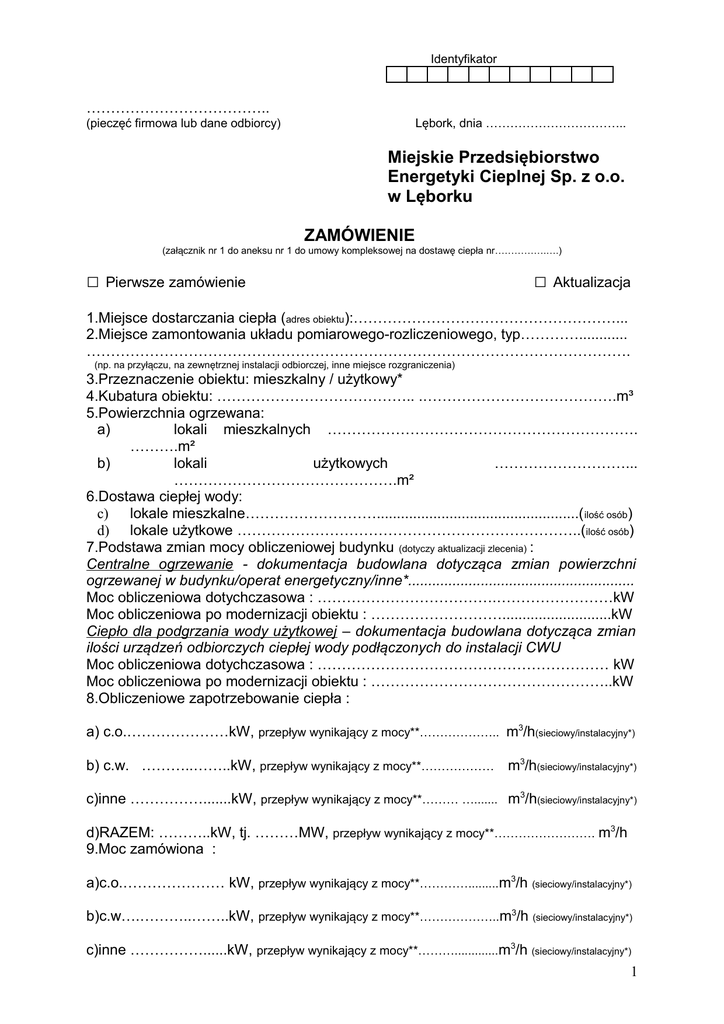 Identyfikator ……………………………….. (pieczęć firmowa lub dane odbiorcy) Lębork, dnia …………………………….. Miejskie Przedsiębiorstwo Energetyki Cieplnej Sp. z o.o. w Lęborku ZAMÓWIENIE (załącznik nr 1 do aneksu nr 1 do umowy kompleksowej na dostawę ciepła nr…………….….) □ Pierwsze zamówienie □ Aktualizacja 1.Miejsce dostarczania ciepła (adres obiektu):………………………………………………... 2.Miejsce zamontowania układu pomiarowego-rozliczeniowego, typ…………............ …………………………………………………………………………………………………. (np. na przyłączu, na zewnętrznej instalacji odbiorczej, inne miejsce rozgraniczenia) 3.Przeznaczenie obiektu: mieszkalny / użytkowy* 4.Kubatura obiektu: ………………………………….. .………………………………….m³ 5.Powierzchnia ogrzewana: a) lokali mieszkalnych ………………………………………………………. ……….m² b) lokali użytkowych ………………………... ……………………………………….m² 6.Dostawa ciepłej wody: c) lokale mieszkalne………………………..................................................( ilość osób) d) lokale użytkowe ……………………………………………………………..(ilość osób) 7.Podstawa zmian mocy obliczeniowej budynku (dotyczy aktualizacji zlecenia) : Centralne ogrzewanie - dokumentacja budowlana dotycząca zmian powierzchni ogrzewanej w budynku/operat energetyczny/inne*........................................................ Moc obliczeniowa dotychczasowa : ……………………………….……………………kW Moc obliczeniowa po modernizacji obiektu : ………………………...........................kW Ciepło dla podgrzania wody użytkowej – dokumentacja budowlana dotycząca zmian ilości urządzeń odbiorczych ciepłej wody podłączonych do instalacji CWU Moc obliczeniowa dotychczasowa : …………………………………………………… kW Moc obliczeniowa po modernizacji obiektu : …………………………………………..kW 8.Obliczeniowe zapotrzebowanie ciepła : a) c.o.…………………kW, przepływ wynikający z mocy**……………….. m3/h(sieciowy/instalacyjny*) b) c.w. ………..……..kW, przepływ wynikający z mocy**……………… m3/h(sieciowy/instalacyjny*) c)inne …………….......kW, przepływ wynikający z mocy**……… …....... m3/h(sieciowy/instalacyjny*) d)RAZEM: ………..kW, tj. ………MW, przepływ wynikający z mocy**……………………. m3/h 9.Moc zamówiona : a)c.o.………………… kW, przepływ wynikający z mocy**………….........m3/h (sieciowy/instalacyjny*) b)c.w….………..……..kW, przepływ wynikający z mocy**………………..m3/h (sieciowy/instalacyjny*) c)inne ……………......kW, przepływ wynikający z mocy**……….............m3/h (sieciowy/instalacyjny*) 1 d)RAZEM: ………..kW, tj. ………MW, przepływ wynikający z mocy**….……………… .....m3/h 8. Źródło ciepła: KR-1 /KO.* 9. Właściciel węzła cieplnego: Odbiorca / Sprzedawca.* - Jeżeli Sprzedawca : węzeł indywidualny/węzeł grupowy* 10. Właściciel układu pomiarowego: Odbiorca / Sprzedawca.* Protokół odbioru układu pomiarowego stanowi załącznik do umowy kompleksowej 11. Dostawę ciepła prosimy rozpocząć od dnia …………………. …i kontynuować, aż do odwołania (dotyczy pierwszego zamówienia). ………………………… (pieczęć i czytelny podpis Odbiorcy) POTWIERDZENIE przyjęcia zamówienia 1. MPEC Sp. z o.o. w Lęborku potwierdza przyjęcie w/w zamówienia do realizacji. 2. Obiekt został zakwalifikowany do grupy taryfowej ………………………………. …… 3. Dostawa ciepła rozpocznie się od dnia (dotyczy pierwszego zamówienia)………………………. 4.Aktualizacja obowiązuje od dnia (dotyczy aktualizacji zamówienia)..……. ………………………. 5. Ewentualne uwagi: ………………………………………………………………………... ………………………… (pieczęć i podpis Sprzedawcy) _______________________________________________________________________________ I. Dokumenty niezbędne do zawarcia „Umowy sprzedaży ciepła”: 1. Dla przedsiębiorców aktualny wypis z rejestru sądowego lub zaświadczenie o wpisie do ewidencji działalności gospodarczej. 2. Tytuł prawny do obiektu. 3. W przypadku pełnomocnika – notarialne pełnomocnictwo do zawarcia umowy w imieniu właściciela. _____________________________ * niepotrzebne skreślić ** wypełnia sprzedawca 2