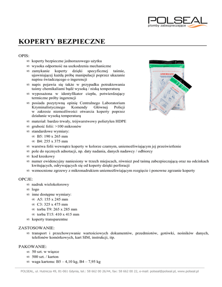 KOPERTY BEZPIECZNE OPIS: • koperty bezpieczne jednorazowego użytku • wysoka odporność na uszkodzenia mechaniczne • zamykanie koperty dzięki specyficznej taśmie, • • • • • • • • • • • ujawniającej każdą próbę manipulacji poprzez ukazanie napisu świadczącego o ingerencji napis pojawia się także w przypadku potraktowania taśmy chemikaliami bądź wysoką / niską temperaturą wyposażona w identyfikator ciepła, potwierdzający termiczne próby ingerencji posiada pozytywną opinię Centralnego Laboratorium Kryminalistycznego Komendy Głównej Policji w zakresie niemożliwości otwarcia koperty poprzez działanie wysoką temperaturą materiał: bardzo trwały, trójwarstwowy polietylen HDPE grubość folii: >100 mikronów standardowe wymiary: • B5: 190 x 265 mm • B4: 255 x 375 mm warstwa folii wewnątrz koperty w kolorze czarnym, uniemożliwiającym jej prześwietlenie pole do ręcznych adnotacji, np. daty nadania, danych nadawcy / odbiorcy kod kreskowy numer ewidencyjny naniesiony w trzech miejscach, również pod taśmą zabezpieczającą oraz na odcinkach kwitujących, odrywających się od koperty dzięki perforacji wzmocnione zgrzewy z mikronadrukiem uniemożliwiającym rozgięcie i ponowne zgrzanie koperty OPCJE: • nadruk wielokolorowy • logo • inne dostępne wymiary: • A5: 155 x 245 mm • C3: 325 x 475 mm • torba T9: 265 x 285 mm • torba T15: 410 x 415 mm • koperty transparentne ZASTOSOWANIE: • transport i przechowywanie wartościowych dokumentów, przedmiotów, gotówki, nośników danych, telefonów komórkowych, kart SIM, instrukcji, itp. PAKOWANIE: • 50 szt. w wiązce • 500 szt. / karton • waga kartonu: B5 – 4,10 kg, B4 – 7,95 kg ------------------------------------------------------------------------------------------------------------------------------------------------------------------POLSEAL, ul. Hutnicza 49, 81-061 Gdynia, tel.: 58 662 00 26/44, fax: 58 662 00 22, e-mail: [email protected], www.polseal.pl