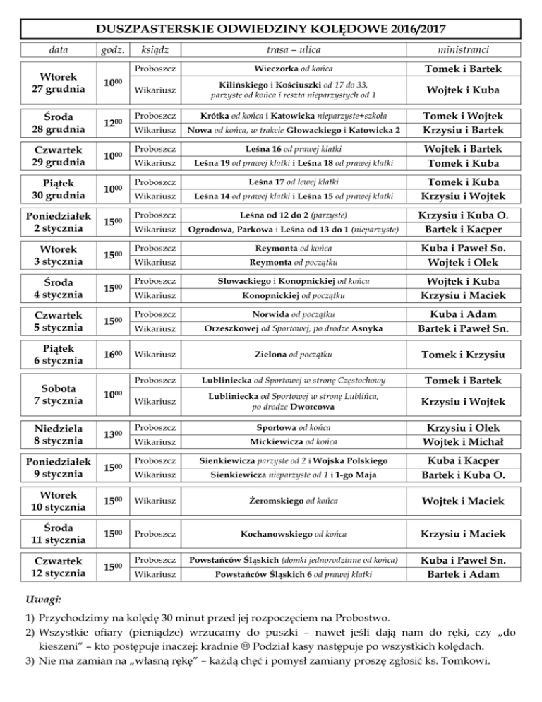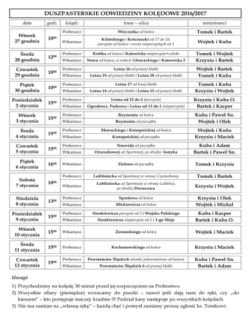 DUSZPASTERSKIE ODWIEDZINY KOLĘDOWE 2016/2017 data godz. Wtorek 27 grudnia 1000 Środa 28 grudnia 1200 Czwartek 29 grudnia 1000 Piątek 30 grudnia 1000 Poniedziałek 2 stycznia 1500 Wtorek 3 stycznia 1500 Środa 4 stycznia 1500 Czwartek 5 stycznia 1500 Piątek 6 stycznia 1600 ksiądz trasa – ulica ministranci Proboszcz Wieczorka od końca Tomek i Bartek Wikariusz Kilińskiego i Kościuszki od 17 do 33, parzyste od końca i reszta nieparzystych od 1 Wojtek i Kuba Proboszcz Krótka od końca i Katowicka nieparzyste+szkoła Wikariusz Nowa od końca, w trakcie Głowackiego i Katowicka 2 Proboszcz Leśna 16 od prawej klatki Wikariusz Leśna 19 od prawej klatki i Leśna 18 od prawej klatki Proboszcz Leśna 17 od lewej klatki Wikariusz Leśna 14 od prawej klatki i Leśna 15 od prawej klatki Proboszcz Leśna od 12 do 2 (parzyste) Wikariusz Ogrodowa, Parkowa i Leśna od 13 do 1 (nieparzyste) Proboszcz Reymonta od końca Wikariusz Reymonta od początku Proboszcz Słowackiego i Konopnickiej od końca Wikariusz Konopnickiej od początku Proboszcz Norwida od początku Wikariusz Orzeszkowej od Sportowej, po drodze Asnyka Kuba i Adam Bartek i Paweł Sn. Wikariusz Zielona od początku Tomek i Krzysiu Proboszcz Lubliniecka od Sportowej w stronę Częstochowy Tomek i Bartek Wikariusz Lubliniecka od Sportowej w stronę Lublińca, po drodze Dworcowa Krzysiu i Wojtek Proboszcz Sportowa od końca Wikariusz Mickiewicza od końca Proboszcz Sienkiewicza parzyste od 2 i Wojska Polskiego Wikariusz Sienkiewicza nieparzyste od 1 i 1-go Maja Kuba i Kacper Bartek i Kuba O. Tomek i Wojtek Krzysiu i Bartek Wojtek i Bartek Tomek i Kuba Tomek i Kuba Krzysiu i Wojtek Krzysiu i Kuba O. Bartek i Kacper Kuba i Paweł So. Wojtek i Olek Wojtek i Kuba Krzysiu i Maciek Sobota 7 stycznia 1000 Niedziela 8 stycznia 1300 Poniedziałek 9 stycznia 1500 Wtorek 10 stycznia 1500 Wikariusz śeromskiego od końca Wojtek i Maciek Środa 11 stycznia 1500 Proboszcz Kochanowskiego od końca Krzysiu i Maciek Czwartek 12 stycznia 1500 Proboszcz Powstańców Śląskich (domki jednorodzinne od końca) Wikariusz Powstańców Śląskich 6 od prawej klatki Kuba i Paweł Sn. Bartek i Adam Krzysiu i Olek Wojtek i Michał Uwagi: 1) Przychodzimy na kolędę 30 minut przed jej rozpoczęciem na Probostwo. 2) Wszystkie ofiary (pieniądze) wrzucamy do puszki – nawet jeśli dają nam do ręki, czy „do kieszeni” – kto postępuje inaczej: kradnie Podział kasy następuje po wszystkich kolędach. 3) Nie ma zamian na „własną rękę” – kaŜdą chęć i pomysł zamiany proszę zgłosić ks. Tomkowi.