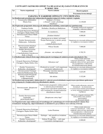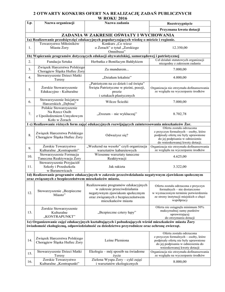2 OTWARTY KONKURS OFERT NA REALIZACJĘ ZADAŃ PUBLICZNYCH W ROKU 2016 Lp. Nazwa organizacji Nazwa zadania Rozstrzygnięcie Przyznana kwota dotacji ZADANIA W ZAKRESIE OŚWIATY I WYCHOWANIA 1a) Realizowanie przedsięwzięć edukacyjnych popularyzujących wiedzę o mieście i regionie. Towarzystwo Miłośników Konkurs „Co wiesz 1. Miasta Żory o Żorach” o tytuł „Żorskiego 12.350,00 Omnibusa” 1b) Wspieranie programów dotyczących edukacji obywatelskiej, samorządowej i patriotycznej 2. 3. 4. 5. Fundacja Sztuka Związek Harcerstwa Polskiego Chorągiew Śląska Hufiec Żory Stowarzyszenie Dzieci Matki Teresy Żorskie Stowarzyszenie Edukacyjno - Kulturalne Herbatka z Bonifacym Bałdykiem Cel działań statutowych organizacji niezgodny z zakresem zadania Za mundurem... 7.000,00 „Działam lokalnie” 4.000,00 „Patriotyzm na co dzień i od święta” Święta Patriotyczne w pieśni, poezji, prozie i sztukach plastycznych Organizacja nie otrzymała dofinansowania ze względu na wyczerpanie środków Stowarzyszenie Inicjatyw Wilcze Ścieżki 7.000,00 Harcerskich „Dębina” Polskie Stowarzyszenie Na Rzecz Osób 7. „Zrozum – nie wykluczaj” 8.702,78 z Upośledzeniem Umysłowym Koło w Żorach 1 c) Realizowanie różnych form zajęć edukacyjnych rozwijających zainteresowania mieszkańców Żor. 6. 8. Związek Harcerstwa Polskiego Chorągiew Śląska Hufiec Żory Odważysz się? Oferta została odrzucona z przyczyn formalnych – osoby, które podpisały ofertę nie były uprawnione do jej podpisania w odniesieniu do wnioskowanej kwoty dotacji. Organizacja nie otrzymała dofinansowania ze względu na wyczerpanie środków Żorskie Towarzystwo „Weekend na wesoło” czyli organizacja Kulturalne „Kontrapunkt” warsztatów kabaretowych Stowarzyszenie Formacja Wiosenne warsztaty taneczne 10. 4.625,00 Taneczna Reaktywacja Żory Reaktywacji Stowarzyszenie Przyjaciół Szkoły i Przedszkola 11. Jak rakieta 3.322,00 w Baranowicach 1d) Realizowanie programów edukacyjnych w zakresie przeciwdziałania negatywnym zjawiskom społecznym oraz związanych z bezpieczeństwem mieszkańców miasta. 9. 12. Stowarzyszenie „Bezpieczne Miasto” 13. Żorskie Stowarzyszenie Kulturalne „KONTRAPUNKT” Realizowanie programów edukacyjnych w zakresie przeciwdziałania negatywnym zjawiskom społecznym oraz związanych z bezpieczeństwem mieszkańców miasta Oferta została odrzucona z przyczyn formalnych – nie dostarczono w wyznaczonym terminie potwierdzenia ze strony instytucji miejskich o chęci współpracy „Bezpieczne cztery łapy” Oferta nie osiągnęła minimum 50% maksymalnej sumy punktów uprawniającej do otrzymania dotacji 1e) Organizowanie zajęć edukacyjnych kształtujących i pobudzających wśród mieszkańców miasta Żory świadomość ekologiczną, odpowiedzialność za dziedzictwo przyrodnicze oraz ochronę zwierząt. 14. 15. 16. Związek Harcerstwa Polskiego Chorągiew Śląska Hufiec Żory Leśne Plemiona Stowarzyszenie Dzieci Matki Teresy Żorskie Towarzystwo Kulturalne „Kontrapunkt” Ekologia – mój sposób na świadome życie Zielona Wyspa Żory – cykl zajęć i warsztatów ekologicznych Oferta została odrzucona z przyczyn formalnych – osoby, które podpisały ofertę nie były uprawnione do jej podpisania w odniesieniu do wnioskowanej kwoty dotacji Organizacja nie otrzymała dofinansowania ze względu na wyczerpanie środków 8.000,00