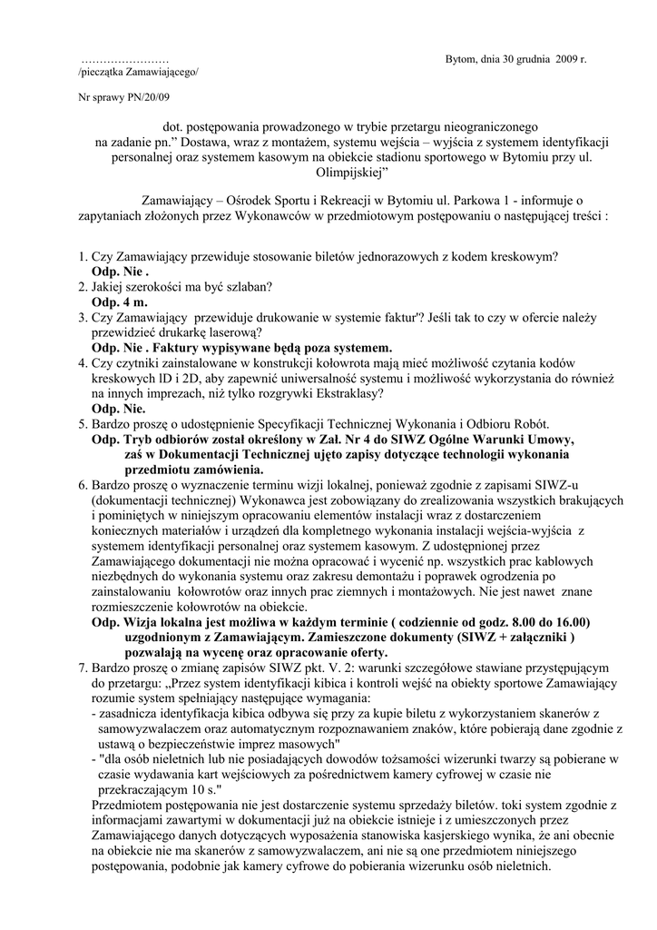 …………………… /pieczątka Zamawiającego/ Bytom, dnia 30 grudnia 2009 r. Nr sprawy PN/20/09 dot. postępowania prowadzonego w trybie przetargu nieograniczonego na zadanie pn.” Dostawa, wraz z montażem, systemu wejścia – wyjścia z systemem identyfikacji personalnej oraz systemem kasowym na obiekcie stadionu sportowego w Bytomiu przy ul. Olimpijskiej” Zamawiający – Ośrodek Sportu i Rekreacji w Bytomiu ul. Parkowa 1 - informuje o zapytaniach złożonych przez Wykonawców w przedmiotowym postępowaniu o następującej treści : 1. Czy Zamawiający przewiduje stosowanie biletów jednorazowych z kodem kreskowym? Odp. Nie . 2. Jakiej szerokości ma być szlaban? Odp. 4 m. 3. Czy Zamawiający przewiduje drukowanie w systemie faktur'? Jeśli tak to czy w ofercie należy przewidzieć drukarkę laserową? Odp. Nie . Faktury wypisywane będą poza systemem. 4. Czy czytniki zainstalowane w konstrukcji kołowrota mają mieć możliwość czytania kodów kreskowych lD i 2D, aby zapewnić uniwersalność systemu i możliwość wykorzystania do również na innych imprezach, niż tylko rozgrywki Ekstraklasy? Odp. Nie. 5. Bardzo proszę o udostępnienie Specyfikacji Technicznej Wykonania i Odbioru Robót. Odp. Tryb odbiorów został określony w Zał. Nr 4 do SIWZ Ogólne Warunki Umowy, zaś w Dokumentacji Technicznej ujęto zapisy dotyczące technologii wykonania przedmiotu zamówienia. 6. Bardzo proszę o wyznaczenie terminu wizji lokalnej, ponieważ zgodnie z zapisami SIWZ-u (dokumentacji technicznej) Wykonawca jest zobowiązany do zrealizowania wszystkich brakujących i pominiętych w niniejszym opracowaniu elementów instalacji wraz z dostarczeniem koniecznych materiałów i urządzeń dla kompletnego wykonania instalacji wejścia-wyjścia z systemem identyfikacji personalnej oraz systemem kasowym. Z udostępnionej przez Zamawiającego dokumentacji nie można opracować i wycenić np. wszystkich prac kablowych niezbędnych do wykonania systemu oraz zakresu demontażu i poprawek ogrodzenia po zainstalowaniu kołowrotów oraz innych prac ziemnych i montażowych. Nie jest nawet znane rozmieszczenie kołowrotów na obiekcie. Odp. Wizja lokalna jest możliwa w każdym terminie ( codziennie od godz. 8.00 do 16.00) uzgodnionym z Zamawiającym. Zamieszczone dokumenty (SIWZ + załączniki ) pozwalają na wycenę oraz opracowanie oferty. 7. Bardzo proszę o zmianę zapisów SIWZ pkt. V. 2: warunki szczegółowe stawiane przystępującym do przetargu: „Przez system identyfikacji kibica i kontroli wejść na obiekty sportowe Zamawiający rozumie system spełniający następujące wymagania: - zasadnicza identyfikacja kibica odbywa się przy za kupie biletu z wykorzystaniem skanerów z samowyzwalaczem oraz automatycznym rozpoznawaniem znaków, które pobierają dane zgodnie z ustawą o bezpieczeństwie imprez masowych" - "dla osób nieletnich lub nie posiadających dowodów tożsamości wizerunki twarzy są pobierane w czasie wydawania kart wejściowych za pośrednictwem kamery cyfrowej w czasie nie przekraczającym 10 s." Przedmiotem postępowania nie jest dostarczenie systemu sprzedaży biletów. toki system zgodnie z informacjami zawartymi w dokumentacji już na obiekcie istnieje i z umieszczonych przez Zamawiającego danych dotyczących wyposażenia stanowiska kasjerskiego wynika, że ani obecnie na obiekcie nie ma skanerów z samowyzwalaczem, ani nie są one przedmiotem niniejszego postępowania, podobnie jak kamery cyfrowe do pobierania wizerunku osób nieletnich. Przedmiotem postępowania jest dostarczenie systemu wejścia-wyjścia oraz wyposażenia stanowisk kasowych do współpracy z istniejącym systemem sprzedaży biletów a nie system sprzedaży biletów. Nie jest zasadne więc wymaganie od Wykonawcy legitymowania się referencjami dotyczącymi stosowania skanerów z samowyzwalaczem i kamer cyfrowych. Odp. Zamawiający podtrzymuje warunek wymieniony V.2 SIWZ ze względu na zakres przedmiotu zamówienia m.in. w zakresie dostawy licencji na stanowiska kasowe umożliwiające zastosowanie m.in. skanerów z samowyzwalaczem i kamer cyfrowych. 8. Czy Inwestor posiada obecnie jakiekolwiek pozwolenia na budowę związane z przetargiem? Odp. Przedmiot zamówienia nie wymaga uzyskania pozwolenia na budowę . 9. Czy jeśli Inwestor nie posiada pozwoleń na budowę, to po czyjej stronie będzie leżało uzyskanie takich pozwoleń - Inwestora czy Wykonawcy? Odp. Przedmiot zamówienia nie obejmuje uzyskiwania jakichkolwiek zezwoleń. 10. Bardzo proszę o udostępnienie aktualnych uprawnień projektanta sprawdzającego w zakresie robót elektrycznych i elektroenergetycznych zgodnie z obowiązującymi przepisami prawa budowlanego. Bardzo proszę również o dołączenie do uprawnień kserokopii opłaconych składek za bieżący okres. Odp. Wymagane uprawnienia odpowiednich osób znajdują się w posiadaniu Zamawiającego 11.Bardzo proszę o odpowiedź na pytanie jakie ma być wyposażenie stanowisk kasowych dostarczonych w przedmiotowym zamówieniu? W dokumentacji technicznej jest napisane że ma ono być identyczne jak na stanowiskach kasowych zainstalowanych obecnie czyli (stanowisko komputerowe, drukarka fiskalna, drukarka termiczna do wydruku biletów papierowych. licencja oprogramowania stanowiska kasowego, licencja systemu Windows XP).W przedmiarze robót brak jest natomiast drukarki termicznej do wydruku biletów papierowych. Bardzo proszę o ewentualne poprawienie przedmiaru robót. Odp. Wycenę oferty należy uzupełnić o koszt drukarki termicznej. 12. Ponieważ aktualnie nie ma jeszcze ostatecznych wymagań Ekstraklasy dotyczących stadionów piłkarskich i ustawy o bezpieczeństwie imprez masowych, to czy po ukazaniu się ostatecznych wymagań, Wykonawca będzie zobowiązany na przystosowanie systemu do tych wymagań. Czy takie przystosowanie będzie musiał wykonać za darmo w ramach udzielonej gwarancji? Odp. Tak. 13.Czy instalacja kablowa, którą należy wykonać w ramach nini