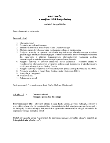 PROTOKÓŁ z sesji nr II/05 Rady Gminy w dniu 3 lutego 2005 r. Lista obecności w załączeniu. Porządek obrad: 1. 2. 3. 4. 5. Otwarcie obrad Przyjęcie porządku dziennego Złożenie ślubowania przez wójta Marka Olechowskiego Złożenie przez dotychczasowego wójta sprawozdania o stanie gminy Podjęcie uchwały w sprawie określenia tygodniowego obowiązkowego wymiaru godzin zajęć nauczycieli realizujących w ramach stosunku pracy obowiązki określone dla stanowisk o różnym tygodniowym obowiązkowym wymiarze godzin, zatrudnionych w szkołach prowadzonych przez Gminę Teresin 6. Podjęcie uchwały w sprawie określenia zasad udzielania i rozmiaru zniżek w tygodniowym obowiązkowym wymiarze godzin zajęć dyrektorów i wicedyrektorów szkół prowadzonych przez Gminę Teresin 7. Podjęcie uchwały w sprawie zatwierdzenia planu pracy Komisji Rewizyjnej na 2005 r. 8. Przyjęcie protokołu z I sesji Rady Gminy z dnia 18 stycznia 2005 r. 9. Interpelacje i zapytania 10. Wolne wnioski 11. Zakończenie obrad Sesję prowadził Przewodniczący Rady Gminy Tadeusz Olechowski. Ad. pkt 1,2 - Otwarcie obrad Przyjęcie porządku dziennego Przewodniczący RG - otworzył obrady II sesji Rady Gminy, powitał radnych, sołtysów i wszystkich zebranych. Na podstawie listy obecności stwierdził istniejące quorum (obecnych – 14 radnych). Przewodniczący RG poprosił o zgłaszanie ewentualnych uwag i wniosków do zaproponowanego porządku obrad. Radni nie zgłosili uwag i zastrzeżeń do zaproponowanego porządku obrad i przyjęli go jednogłośnie (14 głosów „za”). Ad. pkt 3 - Złożenie ślubowania przez wójta Marka Olechowskiego Przewodniczący RG – poprosił Przewodniczącego Gminnej Komisji Wyborczej Bogdana Linarda o przedstawienie oficjalnych wyników wyborów przedterminowych, które odbyły się w dniu 23 stycznia 2005 r. B.Linard (Przewodniczący Gminnej Komisji Wyborczej) – odczytał zaświadczenie Gminnej Komisji Wyborczej, stwierdzającej wybór Pana Marka Krzysztofa Olechowskiego na Wójta Gminy Teresin, w wyniku wyborów przedterminowych w dniu 23 stycznia 2005 r. Wręczył Wójtowi zaświadczenie Komisji i złożył gratulacje. Następnie odbyła się ceremonia złożenia przez Wójta Marka Olechowskiego ślubowania zgodnie z art. 29a ustawy o samorządzie gminnym Przewodniczący RG odczytał treść ślubowania, po czym Wójt Marek Olechowski wypowiedział słowa: „Ślubuję. Tak mi dopomóż Bóg”. Wójt M.Olechowski zaznaczył, że do jego zwycięstwa w wyborach przyczyniły się w dużym stopniu pomoc i zaangażowanie wielu osób. Podziękował przede wszystkim Komitetowi Wyborczemu Wyborców „Niezależni”, radnym z klubu radnych „Niezależni”, a także wyborcom, którzy tak licznie wzięli udział w wyborach. Zadeklarował współpracę ze wszystkimi radnymi, niezależnie od ich przynależności klubowej. M.Olechowski skierował ponadto słowa uznania do Pana Lecha Jacyny sprawującego przez ostatnich 6 tygodni funkcję wójta gminy, dzięki któremu Urząd funkcjonował sprawnie i bez zakłóceń. Uchwalony budżet gminy określił jako ambitny, choć niełatwy w realizacji. Zapewnił, że dołoży wszelkich starań, aby zapisane w nim zadania zostały wykonane. Obiecał również, że zadba o przyjazną dla mieszkańców atmosferę w Urzędzie. M.Olechowski oświadczył ponadto, iż do końca kadencji nie zamierza powoływać swojego zastępcy. Przewodniczący RG – w odpowiedzi na złożoną przez Wójta deklarację współpracy, Rada również wyraża wolę współdziałania z Wójtem dla dobrego i prawidłowego rozwoju gminy. Ad. pkt 4 - Złożenie przez dotychczasowego wójta sprawozdania o stanie gminy Wójt L.Jacyna – złożył nowowybranemu wójtowi gratulacje życząc mu powodzenia w trudnej i złożonej pracy samorządowej. Wygrane w I turze wybory to duży sukces i olbrzymi kapitał zaufania. Zdaniem L.Jacyny nowy wójt M.Olechowski to osoba o charyzmatycznym charakterze, z dużym doświadczeniem i znajomością problemów samorządowych. L.Jacyna wyraził przekonanie, że gmina Teresin będzie w dobrych i odpowiednich rękach. Wójt L.Jacyna dokonał podsumowania działań podejmowanych w ostatnim okresie: - zakończone zostały prace Urzędu związane z przeprowadzeniem przedterminowych wyborów na wójta gminy; 2 - uchwalony został budżet gminy na 2005 rok. Jest to budżet proinwestycyjny ale trudny do realizacji. Szereg zadań ujętych w budżecie roku poprzedniego zostało przesuniętych do wykonania w roku bieżącym. Realizacja uchwalonego budżetu wymagać będzie wytężonej pracy, a także podjęcia starań o pozyskanie dodatkowych środków finansowych. Określone wnioski o dofinansowanie m.in. budowy dróg gminnych już zostały złożone; - w ostatnich dniach zatwierdzony został wynik przetargu na budowę hali sportowej. Jeden z oferentów złożył odwołanie, na które otrzymał odpowiedź od Komisji Przetargowej. W ciągu 5 kolejnych dni ma on prawo odwołania się do Prezesa Urzędu Zamówień Publicznych. Jeśli procedura odwoławcza przeciągnie się, być może konieczne będzie podpisanie aneksu do umowy dotyczącej przyznania środków pomocowych na inwestycję budowy hali; - w styczniu odbyło się spotkanie z Wójtem Gminy Kampinos dotyczące planowania inwestycji na terenach gminy Kampinos graniczących z terenami naszej gminy. Władze Teresina – mając na uwadze potrzebę zabezpieczenia interesów swojej gminy – postawiły warunek zawarcia porozumienia między gminami, w którym określone zostaną zasady prowadzenia przez Kampinos wszelkich działań związanych z planowaną inwestycją. Na zakończenie wystąpienia wójt L.Jacyna podziękował za dobrą i owocną współpracę: Przewodniczącemu Rady, wszystkim radnym, Sekretarzowi i Skarbnikowi Gminy oraz całemu zespołowi pracowników Urzędu. Zdaniem p.L.Jacyny gmina Teresin jest wyjątkowa. Korzystne położenie i wspaniałe perspektywy rozwoju czyni