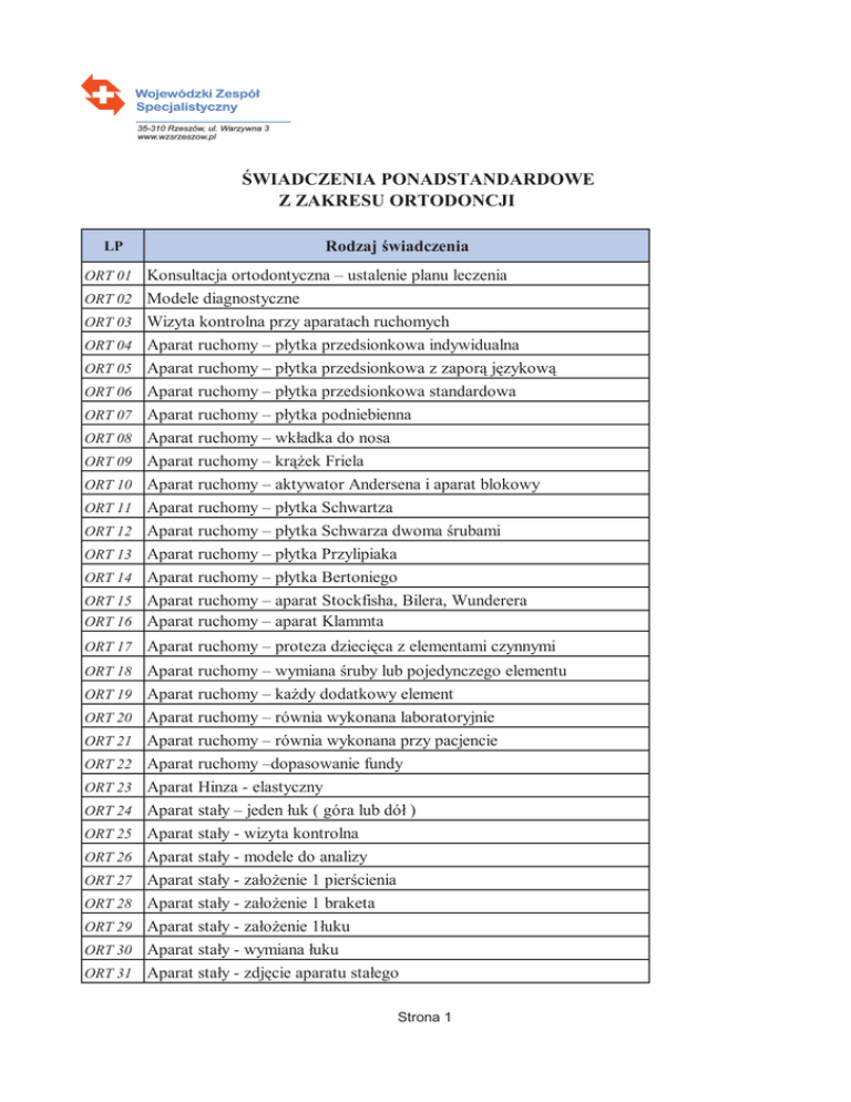 ŚWIADCZENIA PONADSTANDARDOWE Z ZAKRESU ORTODONCJI LP Rodzaj świadczenia ORT 16 Konsultacja ortodontyczna – ustalenie planu leczenia Modele diagnostyczne Wizyta kontrolna przy aparatach ruchomych Aparat ruchomy – płytka przedsionkowa indywidualna Aparat ruchomy – płytka przedsionkowa z zaporą językową Aparat ruchomy – płytka przedsionkowa standardowa Aparat ruchomy – płytka podniebienna Aparat ruchomy – wkładka do nosa Aparat ruchomy – krążek Friela Aparat ruchomy – aktywator Andersena i aparat blokowy Aparat ruchomy – płytka Schwartza Aparat ruchomy – płytka Schwarza dwoma śrubami Aparat ruchomy – płytka Przylipiaka Aparat ruchomy – płytka Bertoniego Aparat ruchomy – aparat Stockfisha, Bilera, Wunderera Aparat ruchomy – aparat Klammta ORT 17 Aparat ruchomy – proteza dziecięca z elementami czynnymi ORT 18 Aparat ruchomy – wymiana śruby lub pojedynczego elementu Aparat ruchomy – każdy dodatkowy element Aparat ruchomy – równia wykonana laboratoryjnie Aparat ruchomy – równia wykonana przy pacjencie Aparat ruchomy –dopasowanie fundy Aparat Hinza - elastyczny Aparat stały – jeden łuk ( góra lub dół ) Aparat stały - wizyta kontrolna Aparat stały - modele do analizy Aparat stały - założenie 1 pierścienia Aparat stały - założenie 1 braketa Aparat stały - założenie 1łuku Aparat stały - wymiana łuku Aparat stały - zdjęcie aparatu stałego ORT 01 ORT 02 ORT 03 ORT 04 ORT 05 ORT 06 ORT 07 ORT 08 ORT 09 ORT 10 ORT 11 ORT 12 ORT 13 ORT 14 ORT 15 ORT 19 ORT 20 ORT 21 ORT 22 ORT 23 ORT 24 ORT 25 ORT 26 ORT 27 ORT 28 ORT 29 ORT 30 ORT 31 Strona 1 ORT 32 ORT 33 ORT 34 ORT 35 ORT 36 ORT 37 ORT 38 ORT 39 ORT 40 Aparat stały - bihelix Aparat stały - retainer Aparat stały - orthorama Aparat stały - szyna nazębna Aparat stały – hyrax Aparat stały – aparat Nance’a Pudełko na aparat Szczoteczka do aparatów stałych Funda mandibulae Strona 2