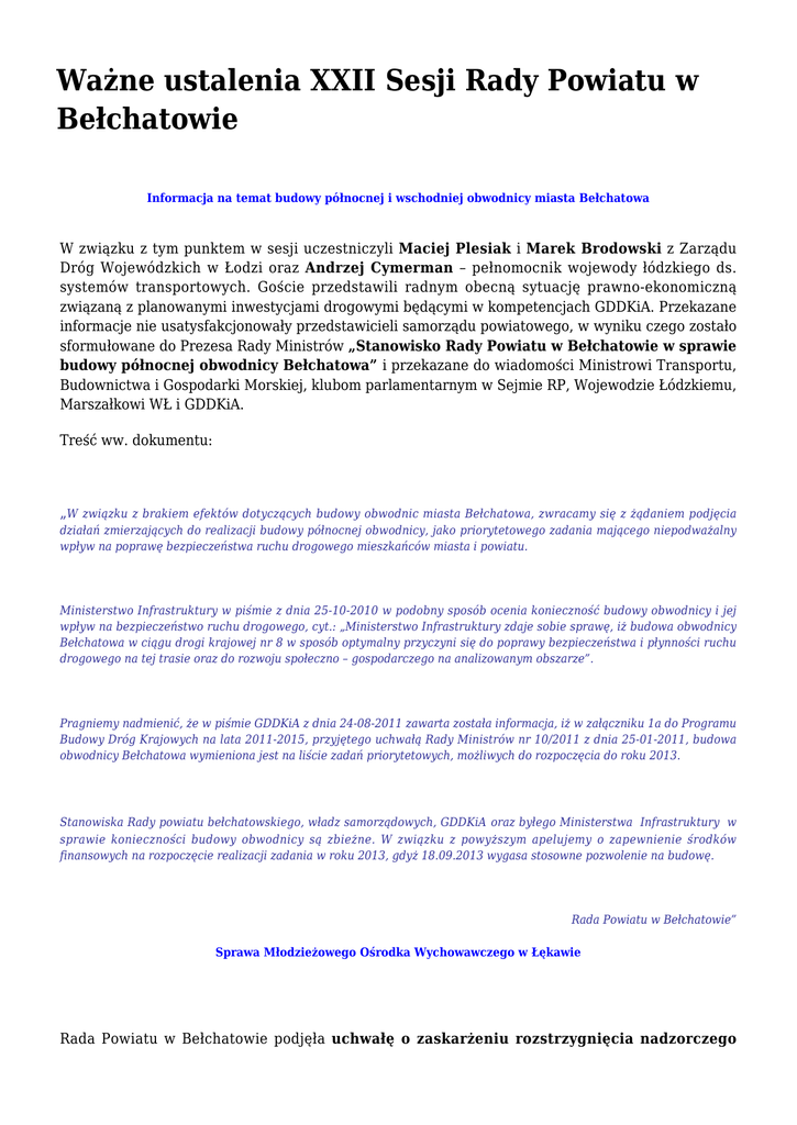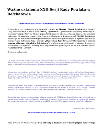 Ważne ustalenia XXII Sesji Rady Powiatu w Bełchatowie Informacja na temat budowy północnej i wschodniej obwodnicy miasta Bełchatowa W związku z tym punktem w sesji uczestniczyli Maciej Plesiak i Marek Brodowski z Zarządu Dróg Wojewódzkich w Łodzi oraz Andrzej Cymerman – pełnomocnik wojewody łódzkiego ds. systemów transportowych. Goście przedstawili radnym obecną sytuację prawno-ekonomiczną związaną z planowanymi inwestycjami drogowymi będącymi w kompetencjach GDDKiA. Przekazane informacje nie usatysfakcjonowały przedstawicieli samorządu powiatowego, w wyniku czego zostało sformułowane do Prezesa Rady Ministrów „Stanowisko Rady Powiatu w Bełchatowie w sprawie budowy północnej obwodnicy Bełchatowa” i przekazane do wiadomości Ministrowi Transportu, Budownictwa i Gospodarki Morskiej, klubom parlamentarnym w Sejmie RP, Wojewodzie Łódzkiemu, Marszałkowi WŁ i GDDKiA. Treść ww. dokumentu: „W związku z brakiem efektów dotyczących budowy obwodnic miasta Bełchatowa, zwracamy się z żądaniem podjęcia działań zmierzających do realizacji budowy północnej obwodnicy, jako priorytetowego zadania mającego niepodważalny wpływ na poprawę bezpieczeństwa ruchu drogowego mieszkańców miasta i powiatu. Ministerstwo Infrastruktury w piśmie z dnia 25-10-2010 w podobny sposób ocenia konieczność budowy obwodnicy i jej wpływ na bezpieczeństwo ruchu drogowego, cyt.: „Ministerstwo Infrastruktury zdaje sobie sprawę, iż budowa obwodnicy Bełchatowa w ciągu drogi krajowej nr 8 w sposób optymalny przyczyni się do poprawy bezpieczeństwa i płynności ruchu drogowego na tej trasie oraz do rozwoju społeczno – gospodarczego na analizowanym obszarze”. Pragniemy nadmienić, że w piśmie GDDKiA z dnia 24-08-2011 zawarta została informacja, iż w załączniku 1a do Programu Budowy Dróg Krajowych na lata 2011-2015, przyjętego uchwałą Rady Ministrów nr 10/2011 z dnia 25-01-2011, budowa obwodnicy Bełchatowa wymieniona jest na liście zadań priorytetowych, możliwych do rozpoczęcia do roku 2013. Stanowiska Rady powiatu bełchatowskiego, władz samorządowych, GDDKiA oraz byłego Ministerstwa Infrastruktury w sprawie konieczności budowy obwodnicy są zbieżne. W związku z powyższym apelujemy o zapewnienie środków finansowych na rozpoczęcie realizacji zadania w roku 2013, gdyż 18.09.2013 wygasa stosowne pozwolenie na budowę. Rada Powiatu w Bełchatowie” Sprawa Młodzieżowego Ośrodka Wychowawczego w Łękawie Rada Powiatu w Bełchatowie podjęła uchwałę o zaskarżeniu rozstrzygnięcia nadzorczego Wojewody Łódzkiego unieważniającego uchwałę dotyczącą likwidacji Młodzieżowego Ośrodka Wychowawczego w Łękawie. Przypomnijmy, Wojewoda Łódzki stwierdził nieważność uchwały Rady Powiatu z dnia 23 maja br. w sprawie likwidacji Młodzieżowego Ośrodka Wychowawczego w Łękawie. Wojewoda zarzucił Radzie Powiatu naruszenie przepisów prawa przy podejmowaniu tej uchwały polegające na niedopełnieniu obowiązku konsultacji uchwały z Forum Związków Zawodowych oraz niepoinformowaniu rodziców wychowanków o likwidacji placówki. Zdaniem Rady Powiatu przepisy nie zostały naruszone, a procedura konsultacyjna i informacyjna została dochowana. U podstaw decyzji o w/w zaskarżeniu rozstrzygnięcia nadzorczego Wojewody Łódzkiego leży także opinia, iż Wojewoda niedokładnie ocenił materiały dowodowe dotyczące konsultacji unieważnionej uchwały. Zdaniem Rady Powiatu, wszystkie procedury zostały dochowane. Naruszenia prawa, których według Wojewody dopuściła się Rada, są nieistotne i nie mogą skutkować nieważnością uchwały. Wojewoda nie dokonał oceny stopnia naruszenia prawa, dlatego trudno jest mówić o istotnym uchybieniu przepisów. W związku z tym skargę oraz podjęcie uchwały o zaskarżeniu rozstrzygnięcia nadzorczego Wojewody Łódzkiego uznano za konieczne i uzasadnione. O ważności uchwały Rady Powiatu w sprawie likwidacji MOW lub o jej nieważności zdecyduje teraz Wojewódzki Sąd Administracyjny. Program profilaktyki zakażeń wirusem brodawczaka ludzkiego (HPV) Przyjęty przez radnych „Program” jest kontynuacją działań podjętych przez samorząd powiatu dwa lata temu. Jego celem jest zmniejszenie liczby zachorowań na raka szyjki macicy u kobiet poprzez przeprowadzenie edukacji zdrowotnej oraz wykonanie szczepień ochronnych szczepionką przeciwko wirusowi HPV w populacji 16-letnich dziewcząt. Tegoroczną edycją „Programu” zostanie objętych 545 mieszkanek powiatu bełchatowskiego. Przedsięwzięcie uzyskało pozytywną opinię Prezesa Agencji Oceny Technologii Medycznych. Podstawą do opracowania „Programu” był fakt, że zakażenie wirusem brodawczaka ludzkiego stanowi duży problem kliniczny i epidemiologiczny na całym świecie. Obecnie około 630 mln ludzi jest zakażonych wirusem HPV. Większość zakażeń HPV przebiega bezobjawowo. Przyjęcie „Programu” pozwoli na obniżenie zachorowalności i umieralności z powodu raka szyjki macicy oraz innych chorób zależnych od wirusa HPV, a także podniesie świadomość zdrowotną na temat zakażeń HPV, ich skutków oraz zasadności i celowości wykonywania badań cytologicznych. Szczepienia przeciwko wirusowi HPV znajdują się w wykazie szczepień zalecanych, ale nie są finansowane z budżetu Ministra Zdrowia. Koszt realizacji powiatowego „Programu” - szacunkowo ok. 200 tysięcy złotych - zostanie poniesiony przez budżet Powiatu Bełchatowskiego. To oznacza, że szczepienia dziewczynek – mieszkanek powiatu (rocznik 1996) będą wykonywane dla nich nieodpłatnie. - Mając na uwadze zdrowie, rozwój i dobre samopoczucie mieszkańców naszego powiatu konieczne jest wdrażanie tego typu inicjatyw, które będą w przyszłości przynosiły wymierne efekty w postaci zdrowego społeczeństwa – napisał w uzasadnieniu do w/w uchwały starosta Szczepan Chrzęst. Zmiana w „Programie Rozwoju Pieczy Zastępczej d