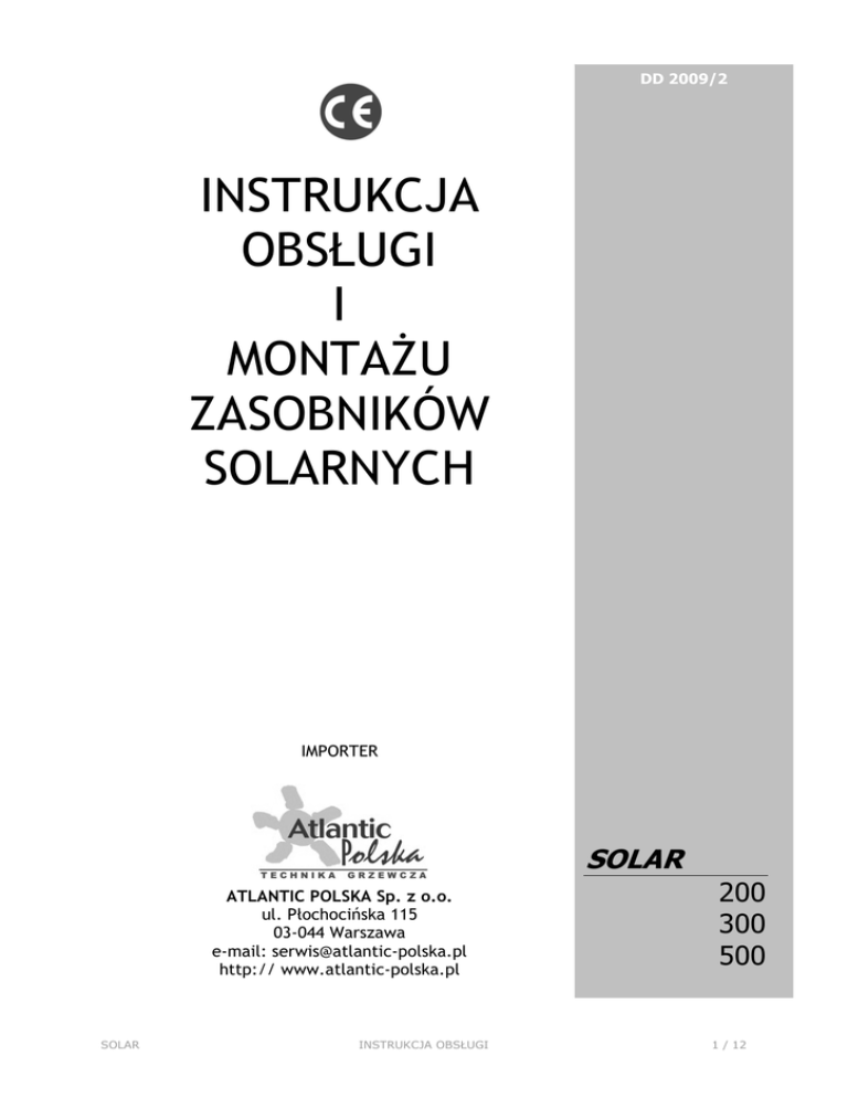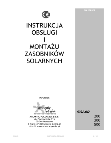 DD 2009/2 INSTRUKCJA OBSŁUGI I MONTAŻU ZASOBNIKÓW SOLARNYCH IMPORTER SOLAR ATLANTIC POLSKA Sp. z o.o. ul. Płochocińska 115 03-044 Warszawa e-mail: [email protected] http:// www.atlantic-polska.pl SOLAR INSTRUKCJA OBSŁUGI 200 300 500 1 / 12 Wybrali Państwo pojemnościowy zasobnik ciepłej wody użytkowej z szerokiej gamy urządzeń naszej firmy. Dziękujemy za okazane nam zaufanie. Zasobnik ten z pewnością przyniesie Państwu dużo satysfakcji w okresie jego eksploatacji. Prosimy jedynie o uważne przeczytanie niniejszej instrukcji, jak również zachowanie jej wraz z kuponami gwarancyjnymi. Pragniemy przypomnieć, iż aby ogrzewacz funkcjonował sprawnie, instalacja hydrauliczna i elektryczna powinny być wykonane zgodnie z obowiązującymi normami BUDOWA ZASOBNIKA DANE TECHNICZNE WYMIARY MONTAŻ PODŁĄCZENIE HYDRAULICZNE PODŁĄCZENIE ELEKTRYCZNE CYRKULACJA KONSERWACJA WARUNKI GWARANCJI NOTATKI NOTATKI SOLAR INSTRUKCJA OBSŁUGI 3 4 4 5 5 7 8 9 10 11 12 2 / 12 1- wyjście ciepłej wody użytkowej, 2- zasilanie wężownicy układu kotłowego, 3- powrót obiegu układu kotłowego, 4- obudowa kryzy, 5– miejsce na sondę termostatu, 6– miejsce na grzałkę elektryczną, 7- anoda magnezowa 8- zasilanie wężownicy obiegu solarnego, 9- powrót obiegu układu solarnego, 10– zasilenie zasobnika zimną wodą, 11– sonda układu solarnego, 12– sonda układu kotłowego SOLAR to zasobnik c.w.u. przeznaczony do pracy z kotłem c.o. współpracującym z układem solarnym. Kolektory słoneczne wykorzystują darmowa energie promieni słonecznych, która zamieniają na ciepło właściwe niezbędne do ogrzania budynku mieszkalnego. Zasobnik SOLAR w połączeniu z kompletnym zestawem solarnym jest w stanie zapewnić blisko 70% rocznego zapotrzebowania na ciepła wodę niezbędną w gospodarstwie domowym. SOLAR wyposażony jest 2 wymienniki spiralne w postaci podwójnych wężownic (patent ATLANTIC). Ich optymalne osadzenie wewnątrz zbiornika umożliwia całkowite ogrzanie i wykorzystanie tak zwanej zimnej strefy zasobnika. Pozwoliło to nam również zwiększyć o blisko 45% wydajność urządzenia oraz znacząco skrócić czas ogrzewania w nim wody. SOLAR posiada możliwość zastosowania grzałki elektrycznej o mocy 2400W (opcja), która w razie potrzeby może wspomóc lub nawet całkowicie zastąpią system solarny. Jest prosty w montażu i przystosowany do pracy w różnego rodzaju typach zabudowy, w tym w pomieszczeniach nie ogrzewanych. Nasz zasobnik charakteryzuje się bardzo dobrą izolacją termiczną wykonaną z najwyższej jakości pianki poliuretanowej (0% CFC, HCFC) dzięki czemu umożliwia bardzo długie magazynowanie ciepłej wody o tej samej temperaturze w swym wnętrzu oraz zapewnia minimalne straty energii niezbędne do jej podtrzymania. Podstawowym zabezpieczeniem antykorozyjnym zasobnika jest jego wewnętrzna powłoka, pokryta najwyższej jakości emalią ceramiczną wypaloną piecowo, która dodatkowo wspomagana jest przez system ochrony antykorozyjnej CERAMICMG. SOLAR INSTRUKCJA OBSŁUGI 3 / 12 pojemność (L) model moc wymiennika (kW) (1) powierzchnia przepływ wymiennika godzinowy (m 2 ) (L/h) (3) przepływ minutowy (L/10min) realny czas nagrzewania (min) (2) moc grzałki ( W) realny czas nagrzewania (h)(3) straty energii (kWh/24h) (4) w ag a (kg) SOLAR 200 200 24/18 0.66/0.49 631/440 272/150 2.15 2400 (4) 5.20 2.70 86 SOLAR 300 300 38/24.6 1.07/0.66 937/600 415/200 2.50 2400 (4) 6.20 3.17 105 SOLAR 500 500 38/24.6 1.07/0.66 937/600 595/247 4.35 2400 (4) 8.50 4.40 173 3 1 - obieg pierwotny - 2 m /h, temperatura wody 90°C, 3 2 - obieg wtórny - 2 m /h, temperatura wody 10/45°C akumulacja 60°C, 3 3 - ΔT=30°C obieg wtórny - 2 m /h 90°C, 4 - wydajność 2 m3/h (ΔT=35°C) m odel A B C D E F G1 G2 H I J K L SOLAR 200 316 1006 567 25-50 55 5 3/4” 3/4” 1255 104 104 465 437 SOLAR 300 417 1490 567 25-50 55 5 3/4” 3/4” 1760 104 104 1400 537 SOLAR 500 483 1690 678 25-50 55 5 1” 1” 1985 104 104 1103 503 SOLAR INSTRUKCJA OBSŁUGI 4 / 12 Â Â Â Â Â Â Â Â Â Â zasobnik SOLAR przeznaczony jest do współpracy z kotłami c.o. pracującymi w układzie zamkniętym może być instalowany jedynie pozycji stojącej. podczas montażu należy uwzględnić wolną przestrzeń +/- 400 mm, po prawej stronie zasobnika by ułatwić możliwość jego podłączenia do instalacji wodnej oraz by zapewnić dostęp do obsługi części elektrycznych i hydraulicznych lub aby ułatwić ich demontaż, syfon grupy bezpieczeństwa należy połączyć oddzielnym przewodem do kanalizacji. jeżeli zasobnik umieszczony jest np. w piwnicy lub garażu gdzie temperatura pomieszczenia jest na niskim poziomie, należy przewidzieć ocieplenie urządzenia i instalacji wodnej, temperatura pomieszczenia, w którym pracuje zasobnik nie powinna przekraczać 40°C. przed podłączeniem zasobnika c.w.u. należy dokładnie przepłukać instalację wodną tak, aby ewentualne zanieczyszczenia nie przedostały się do jego wnętrza, bezpośrednio na króćcu ciepłej wody należy zamontować złączkę dielektryczną używając wyłącznie uszczelek znajdujących się w zestawie /złączka dielektryczna oraz grupa bezpieczeństwa dostarczone są razem z zasobnikiem/. nie zamontowanie w/w złączki dielektrycznej, może doprowadzić do korozji króćców hydraulicznych ogrzewacza, co pociąga za sobą utratę gwarancji. w przypadku, gdy ciśnienie zimnej wody przekracza 4 bary, na instalacji zimnej wody należy zamontować naczynie zbiorcze oraz reduktor ciśnienia na zasilaniu głównym, najlepiej zaraz za wodomierzem. zasobnik wraz z jego wyposażeniem /naczynie zbiorcze, grupa bezpieczeństwa itp./ powinien być zainstalowany w pomieszczeniu o temperaturze powyżej 0ºC w celu uniknięcia zamarznięcia instalacji. UWAGA !!! NIE NALEŻY MONTOWAĆ ZAWORU ODCINAJĄCEGO POMIĘDZY NACZYNIEM ZBIORCZYM A WEJŚCIEM OBIEGU DO WĘŻOWNICY, GDYŻ ISTNIEJE RYZYKO USZKODZENIA OBIEGU W PRZYPADKU NIE ZAMIERZO