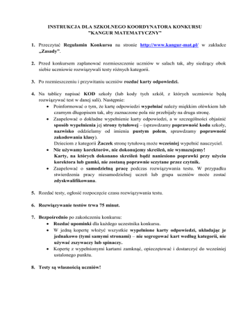 INSTRUKCJA DLA SZKOLNEGO KOORDYNATORA KONKURSU ”KANGUR MATEMATYCZNY” 1. Przeczytać Regulamin Konkursu na stronie http://www.kangur-mat.pl/ w zakładce „Zasady”. 2. Przed konkursem zaplanować rozmieszczenie uczniów w salach tak, aby siedzący obok siebie uczniowie rozwiązywali testy różnych kategorii. 3. Po rozmieszczeniu i przywitaniu uczniów rozdać karty odpowiedzi. 4. Na tablicy napisać KOD szkoły (lub kody tych szkół, z których uczniowie będą rozwiązywać test w danej sali). Następnie: Poinformować o tym, że kartę odpowiedzi wypełniać należy miękkim ołówkiem lub czarnym długopisem tak, aby zaznaczone pola nie przebijały na druga stronę. Zaapelować o dokładne wypełnienie karty odpowiedzi, a w szczególności objaśnić sposób wypełnienia jej strony tytułowej – (sprawdzamy poprawność kodu szkoły, nazwisko oddzielamy od imienia pustym polem, sprawdzamy poprawność zakodowania klasy). Dzieciom z kategorii Żaczek stronę tytułową może wcześniej wypełnić nauczyciel. Nie używamy korektorów, nie dokonujemy skreśleń, nie wymazujemy! Karty, na których dokonano skreśleń bądź naniesiono poprawki przy użyciu korektora lub gumki, nie zostaną poprawnie sczytane przez czytnik. Zaapelować o samodzielną pracę podczas rozwiązywania testu. W przypadku stwierdzenia pracy niesamodzielnej uczeń lub grupa uczniów może zostać zdyskwalifikowana. 5. Rozdać testy, ogłosić rozpoczęcie czasu rozwiązywania testu. 6. Rozwiązywanie testów trwa 75 minut. 7. Bezpośrednio po zakończeniu konkursu: Rozdać upominki dla każdego uczestnika konkursu. W jedną kopertę włożyć wszystkie wypełnione karty odpowiedzi, układając je jednakowo (tymi samymi stronami) – nie segregować kart według kategorii, nie używać zszywaczy lub spinaczy. Kopertę z wypełnionymi kartami zamknąć, opieczętować i dostarczyć do wcześniej ustalonego punktu. 8. Testy są własnością uczniów!