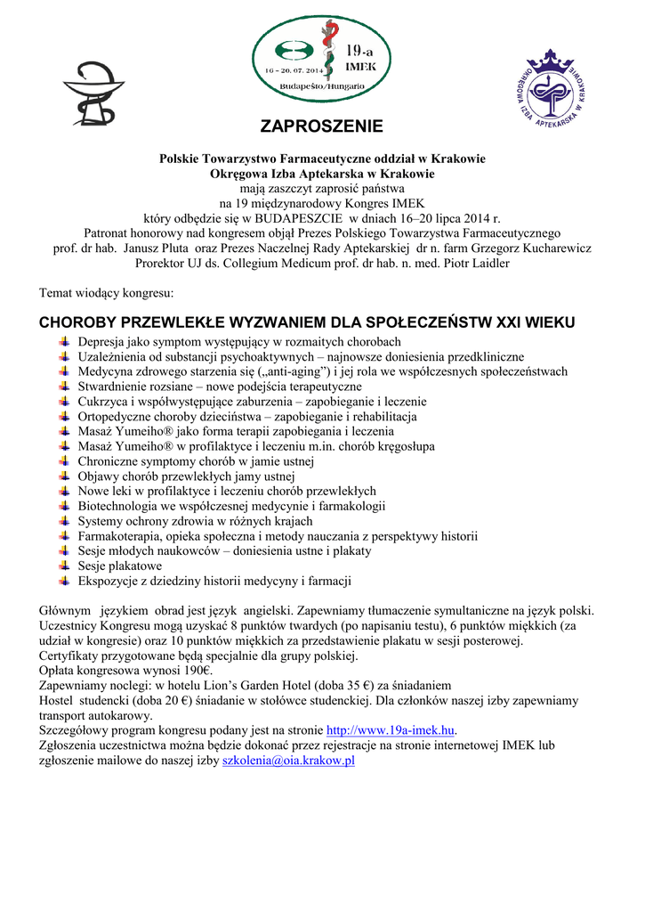 ZAPROSZENIE Polskie Towarzystwo Farmaceutyczne oddział w Krakowie Okręgowa Izba Aptekarska w Krakowie mają zaszczyt zaprosić państwa na 19 międzynarodowy Kongres IMEK który odbędzie się w BUDAPESZCIE w dniach 16–20 lipca 2014 r. Patronat honorowy nad kongresem objął Prezes Polskiego Towarzystwa Farmaceutycznego prof. dr hab. Janusz Pluta oraz Prezes Naczelnej Rady Aptekarskiej dr n. farm Grzegorz Kucharewicz Prorektor UJ ds. Collegium Medicum prof. dr hab. n. med. Piotr Laidler Temat wiodący kongresu: CHOROBY PRZEWLEKŁE WYZWANIEM DLA SPOŁECZEŃSTW XXI WIEKU Depresja jako symptom występujący w rozmaitych chorobach Uzależnienia od substancji psychoaktywnych – najnowsze doniesienia przedkliniczne Medycyna zdrowego starzenia się („anti-aging”) i jej rola we współczesnych społeczeństwach Stwardnienie rozsiane – nowe podejścia terapeutyczne Cukrzyca i współwystępujące zaburzenia – zapobieganie i leczenie Ortopedyczne choroby dzieciństwa – zapobieganie i rehabilitacja Masaż Yumeiho® jako forma terapii zapobiegania i leczenia Masaż Yumeiho® w profilaktyce i leczeniu m.in. chorób kręgosłupa Chroniczne symptomy chorób w jamie ustnej Objawy chorób przewlekłych jamy ustnej Nowe leki w profilaktyce i leczeniu chorób przewlekłych Biotechnologia we współczesnej medycynie i farmakologii Systemy ochrony zdrowia w różnych krajach Farmakoterapia, opieka społeczna i metody nauczania z perspektywy historii Sesje młodych naukowców – doniesienia ustne i plakaty Sesje plakatowe Ekspozycje z dziedziny historii medycyny i farmacji Głównym językiem obrad jest język angielski. Zapewniamy tłumaczenie symultaniczne na język polski. Uczestnicy Kongresu mogą uzyskać 8 punktów twardych (po napisaniu testu), 6 punktów miękkich (za udział w kongresie) oraz 10 punktów miękkich za przedstawienie plakatu w sesji posterowej. Certyfikaty przygotowane będą specjalnie dla grupy polskiej. Opłata kongresowa wynosi 190€. Zapewniamy noclegi: w hotelu Lion’s Garden Hotel (doba 35 €) za śniadaniem Hostel studencki (doba 20 €) śniadanie w stołówce studenckiej. Dla członków naszej izby zapewniamy transport autokarowy. Szczegółowy program kongresu podany jest na stronie http://www.19a-imek.hu. Zgłoszenia uczestnictwa można będzie dokonać przez rejestracje na stronie internetowej IMEK lub zgłoszenie mailowe do naszej izby [email protected]