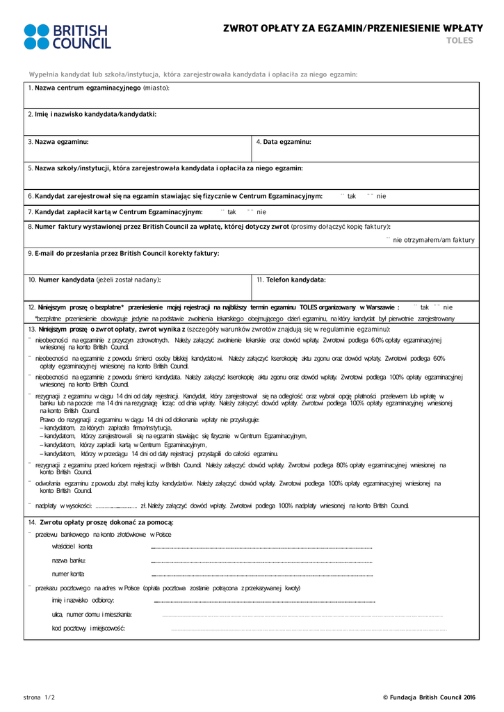 ZWROT OPŁATY ZA EGZAMIN/PRZENIESIENIE WPŁATY TOLES Wypełnia kandydat lub szkoła/instytucja, która zarejestrowała kandydata i opłaciła za niego egzamin: 1. Nazwa centrum egzaminacyjnego (miasto): 2. Imię i nazwisko kandydata/kandydatki: 3. Nazwa egzaminu: 4. Data egzaminu: 5. Nazwa szkoły/instytucji, która zarejestrowała kandydata i opłaciła za niego egzamin: 6. Kandydat zarejestrował się na egzamin stawiając się fizycznie w Centrum Egzaminacyjnym: 7. Kandydat zapłacił kartą w Centrum Egzaminacyjnym: ¨ tak ¨ ¨ tak ¨ nie nie 8. Numer faktury wystawionej przez British Council za wpłatę, której dotyczy zwrot (prosimy dołączyć kopię faktury): ¨ nie otrzymałem/am faktury 9. E-mail do przesłania przez British Council korekty faktury: 10. Numer kandydata (jeżeli został nadany): 11. Telefon kandydata: 12. Niniejszym proszę o bezpłatne* przeniesienie mojej rejestracji na najbliższy termin egzaminu TOLES organizowany w Warszawie : ¨ tak ¨ nie *bezpłatne przeniesienie obowiązuje jedynie na podstawie zwolnienia lekarskiego obejmującego dzień egzaminu, na który kandydat był pierwotnie zarejestrowany 13. Niniejszym proszę o zwrot opłaty, zwrot wynika z (szczegóły warunków zwrotów znajdują się w regulaminie egzaminu): ¨ nieobecności na egzaminie z przyczyn zdrowotnych. Należy załączyć zwolnienie lekarskie oraz dowód wpłaty. Zwrotowi podlega 60% opłaty egzaminacyjnej wniesionej na konto British Council. ¨ nieobecności na egzaminie z powodu śmierci osoby bliskiej kandydatowi. Należy załączyć kserokopię aktu zgonu oraz dowód wpłaty. Zwrotowi podlega 60% opłaty egzaminacyjnej wniesionej na konto British Council. ¨ nieobecności na egzaminie z powodu śmierci kandydata. Należy załączyć kserokopię aktu zgonu oraz dowód wpłaty. Zwrotowi podlega 100% opłaty egzaminacyjnej wniesionej na konto British Council. ¨ rezygnacji z egzaminu w ciągu 14 dni od daty rejestracji. Kandydat, który zarejestrował się na odległość oraz wybrał opcję płatności przelewem lub wpłatę w banku lub na poczcie ma 14 dni na rezygnację licząc od dnia wpłaty. Należy załączyć dowód wpłaty. Zwrotowi podlega 100% opłaty egzaminacyjnej wniesionej na konto British Council. Prawo do rezygnacji z egzaminu w ciągu 14 dni od dokonania wpłaty nie przysługuje: – kandydatom, za których zapłaciła firma/instytucja, – kandydatom, którzy zarejestrowali się na egzamin stawiając się fizycznie w Centrum Egzaminacyjnym, – kandydatom, którzy zapłacili kartą w Centrum Egzaminacyjnym, – kandydatom, którzy w przeciągu 14 dni od daty rejestracji przystąpili do całości egzaminu. ¨ rezygnacji z egzaminu przed końcem rejestracji w British Council. Należy załączyć dowód wpłaty. Zwrotowi podlega 80% opłaty egzaminacyjnej wniesionej na konto British Council. ¨ odwołania egzaminu z powodu zbyt małej liczby kandydatów. Należy załączyć dowód wpłaty. Zwrotowi podlega 100% opłaty egzaminacyjnej wniesionej na konto British Council. ¨ nadpłaty w wysokości: …………..…...............….. zł. Należy załączyć dowód wpłaty. Zwrotowi podlega 100% nadpłaty wniesionej na konto British Council. 14. Zwrotu opłaty proszę dokonać za pomocą: ¨ przelewu bankowego na konto złotówkowe w Polsce właściciel konta: ........................................................................................................................................................................................................ nazwa banku: ........................................................................................................................................................................................................ numer konta: ........................................................................................................................................................................................................ ¨ przekazu pocztowego na adres w Polsce (opłata pocztowa zostanie potrącona z przekazywanej kwoty) imię i nazwisko odbiorcy: ulica, numer domu i mieszkania: kod pocztowy i miejscowość: strona 1/ 2 ........................................................................................................................................................................................................ ............................... .... .... .... .... .... .... .... .... .... .... .... .... .... .... .... .... .... .... .... .... .... .... .... .... .... ... .... .... .... .... .... .... .... .... .... .... .... .... .... .... .... .... .. ...................................................... .... .... .... .... .... .... .... .... .... .... .... .... .... .... .... .... .... .... .... .... .... .... .... .... .... .... .... .... .... .... .... .... .... .... .... .... . © Fundacja British Council 2016 ZWROT OPŁATY ZA EGZAMIN/PRZENIESIENIE WPŁATY TOLES Przez podpisanie tego formularza zezwala Pan/i na przetwarzanie danych osobowych dotyczących Pana/i osoby do celów zrealizowania zwrotu opłaty, zgodnie z wymogami Ustawy o ochronie danych osobowych. Pana/i dane osobowe będą przechowywane w siedzibie Fundacji British Council w Warszawie w celach wymienionych powyżej. Informacje dotyczące Pana/i nie będą w żadnym przypadku użyte w celach dyskryminacyjnych. Przysługuje Panu/i prawo do wglądu do swoich danych, oraz prawo do ich poprawiania. Dodatkowo dane osobowe zawierające informacje dotyczące stanu zdrowia podlegają szczególnej ochronie wynikającej z Ustawy o ochronie danych osobowych z dnia 29 sierpnia 1997 (Dziennik Ustaw 1997 Nr 133, poz. 883 z późn. zm.). Potwierdzam, iż przeczytałem/am powyższe informacje i wyrażam zgodę na przetwarzanie moich danych osobowych w przedstawionymi celu i pod opisanymi warunkami. 15. Podpis: 16. Data: Wypełnia osoba przyjmująca dokumenty w Centrum: Podp is p oświadczający p rzyjęcie dokumentów: Data: Wypełnia Administrator 