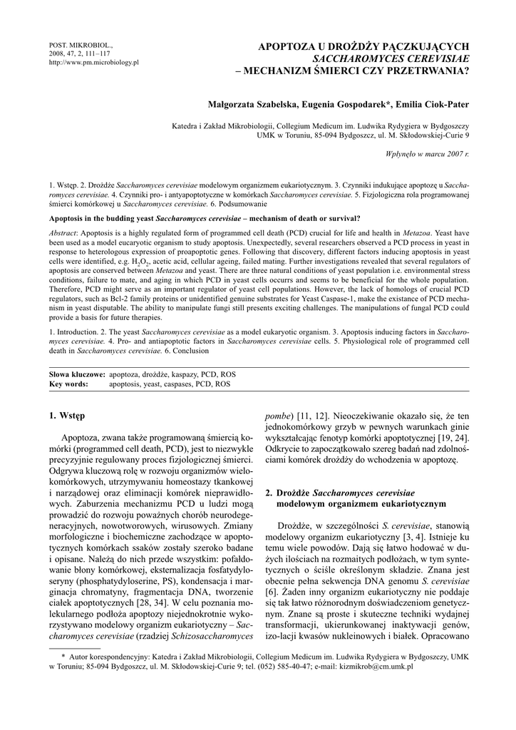 POST. MIKROBIOL., 2008, 47, 2, 111117 http://www.pm.microbiology.pl APOPTOZA U DRO¯D¯Y P¥CZKUJ¥CYCH SACCHAROMYCES CEREVISIAE MECHANIZM MIERCI CZY PRZETRWANIA? Ma³gorzata Szabelska, Eugenia Gospodarek*, Emilia Ciok-Pater Katedra i Zak³ad Mikrobiologii, Collegium Medicum im. Ludwika Rydygiera w Bydgoszczy UMK w Toruniu, 85-094 Bydgoszcz, ul. M. Sk³odowskiej-Curie 9 Wp³ynê³o w marcu 2007 r. 1. Wstêp. 2. Dro¿d¿e Saccharomyces cerevisiae modelowym organizmem eukariotycznym. 3. Czynniki indukuj¹ce apoptozê u Saccharomyces cerevisiae. 4. Czynniki pro- i antyapoptotyczne w komórkach Saccharomyces cerevisiae. 5. Fizjologiczna rola programowanej mierci komórkowej u Saccharomyces cerevisiae. 6. Podsumowanie Apoptosis in the budding yeast Saccharomyces cerevisiae mechanism of death or survival? Abstract: Apoptosis is a highly regulated form of programmed cell death (PCD) crucial for life and health in Metazoa. Yeast have been used as a model eucaryotic organism to study apoptosis. Unexpectedly, several researchers observed a PCD process in yeast in response to heterologous expression of proapoptotic genes. Following that discovery, different factors inducing apoptosis in yeast cells were identified, e.g. H2O2, acetic acid, cellular ageing, failed mating. Further investigations revealed that several regulators of apoptosis are conserved between Metazoa and yeast. There are three natural conditions of yeast population i.e. environmental stress conditions, failure to mate, and aging in which PCD in yeast cells occurrs and seems to be beneficial for the whole population. Therefore, PCD might serve as an important regulator of yeast cell populations. However, the lack of homologs of crucial PCD regulators, such as Bcl-2 family proteins or unidentified genuine substrates for Yeast Caspase-1, make the existance of PCD mechanism in yeast disputable. The ability to manipulate fungi still presents exciting challenges. The manipulations of fungal PCD could provide a basis for future therapies. 1. Introduction. 2. The yeast Saccharomyces cerevisiae as a model eukaryotic organism. 3. Apoptosis inducing factors in Saccharomyces cerevisiae. 4. Pro- and antiapoptotic factors in Saccharomyces cerevisiae cells. 5. Physiological role of programmed cell death in Saccharomyces cerevisiae. 6. Conclusion S³owa kluczowe: apoptoza, dro¿d¿e, kaspazy, PCD, ROS Key words: apoptosis, yeast, caspases, PCD, ROS 1. Wstêp Apoptoza, zwana tak¿e programowan¹ mierci¹ komórki (programmed cell death, PCD), jest to niezwykle precyzyjnie regulowany proces fizjologicznej mierci. Odgrywa kluczow¹ rolê w rozwoju organizmów wielokomórkowych, utrzymywaniu homeostazy tkankowej i narz¹dowej oraz eliminacji komórek nieprawid³owych. Zaburzenia mechanizmu PCD u ludzi mog¹ prowadziæ do rozwoju powa¿nych chorób neurodegeneracyjnych, nowotworowych, wirusowych. Zmiany morfologiczne i biochemiczne zachodz¹ce w apoptotycznych komórkach ssaków zosta³y szeroko badane i opisane. Nale¿¹ do nich przede wszystkim: pofa³dowanie b³ony komórkowej, eksternalizacja fosfatydyloseryny (phosphatydyloserine, PS), kondensacja i marginacja chromatyny, fragmentacja DNA, tworzenie cia³ek apoptotycznych [28, 34]. W celu poznania molekularnego pod³o¿a apoptozy niejednokrotnie wykorzystywano modelowy organizm eukariotyczny Saccharomyces cerevisiae (rzadziej Schizosaccharomyces pombe) [11, 12]. Nieoczekiwanie okaza³o siê, ¿e ten jednokomórkowy grzyb w pewnych warunkach ginie wykszta³caj¹c fenotyp komórki apoptotycznej [19, 24]. Odkrycie to zapocz¹tkowa³o szereg badañ nad zdolnociami komórek dro¿d¿y do wchodzenia w apoptozê. 2. Dro¿d¿e Saccharomyces cerevisiae modelowym organizmem eukariotycznym Dro¿d¿e, w szczególnoci S. cerevisiae, stanowi¹ modelowy organizm eukariotyczny [3, 4]. Istnieje ku temu wiele powodów. Daj¹ siê ³atwo hodowaæ w du¿ych ilociach na rozmaitych pod³o¿ach, w tym syntetycznych o cile okrelonym sk³adzie. Znana jest obecnie pe³na sekwencja DNA genomu S. cerevisiae [6]. ¯aden inny organizm eukariotyczny nie poddaje siê tak ³atwo ró¿norodnym dowiadczeniom genetycznym. Znane s¹ proste i skuteczne techniki wydajnej transformacji, ukierunkowanej inaktywacji genów, izo-lacji kwasów nukleinowych i bia³ek. Opracowano * Autor korespondencyjny: Katedra i Zak³ad Mikrobiologii, Collegium Medicum im. Ludwika Rydygiera w Bydgoszczy, UMK w Toruniu; 85-094 Bydgoszcz, ul. M. Sk³odowskiej-Curie 9; tel. (052) 585-40-47; e-mail: [email protected] 112 MA£GORZATA SZABELSKA, EUGENIA GOSPODAREK, EMILIA CIOK-PATER szereg dogodnych wektorów dwufunkcjonalnych, replikuj¹cych siê autonomicznie w komórkach dro¿d¿y, ³atwych do izolacji i pozwalaj¹cych na regulowanie liczby kopii w komórce [27]. Badania genetyczne i biochemiczne nad dro¿d¿ami mia³y zasadnicze znaczenie dla zrozumienia wielu podstawowych procesów przebiegaj¹cych w komórkach eukariotycznych, w³¹cznie z cyklem podzia³ów komórkowych [4]. Jeszcze dziesiêæ lat temu nikt nie przypuszcza³, ¿e ten prosty jednokomórkowy organizm mo¿e posiadaæ tak z³o¿ony mechanizm, jakim jest PCD. Komórka S. cerevisiae mia³a stanowiæ pewnego rodzaju pust¹ przestrzeñ, woln¹ od czynników mog¹cych interferowaæ z produktami heterologicznych genów pro- i antyapoptotycznych. Zaobserwowano, ¿e ekspresja heterologicznych genów proapoptotycznych w komórkach dro¿d¿y powoduje na ich proliferacjê i mo¿e wywo³ywaæ mieræ [11, 12, 14, 15]. O tym, ¿e jest to mieræ nosz¹ca znamiona apoptozy donieli L i g r i wsp. [19] opisuj¹c eksternalizacjê PS, kondensacjê i marginacjê chromatyny, fragmentacjê DNA oraz tworzenie pêcherzyków apoptotycznych w komórkach S. cerevisiae z ekspresj¹ genu bax. Koekspresja czynników antyapoptotycznych Bcl-xL lub Bcl-2 zapobiega efektom wywo³ywanym przez bia³ka Bax i Bak [14, 15, 19]. M a d e o i wsp. [24] obserwowali cechy apoptotycznej mierci kondensacjê chromatyny, fragmentacjê DNA, ek