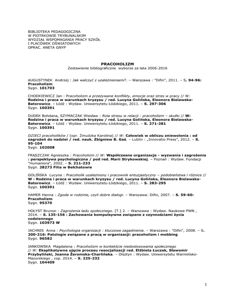 BIBLIOTEKA PEDAGOGICZNA W PIOTRKOWIE TRYBUNALSKIM WYDZIAŁ WSPOMAGANIA PRACY SZKÓŁ I PLACÓWEK OŚWIATOWYCH OPRAC. ANETA GNYP PRACOHOLIZM Zestawienie bibliograficzne wyborze za lata 2006-2016 AUGUSTYNEK Andrzej : Jak walczyć z uzależnieniami?. – Warszawa : "Difin", 2011. – S. 94-96: Pracoholizm Sygn. 101703 CHODKIEWICZ Jan : Pracoholizm a przeżywane konflikty, emocje oraz stres w pracy // W: Rodzina i praca w warunkach kryzysu / red. Lucyna Golińska, Eleonora BielawskaBatorowicz. – Łódź : Wydaw. Uniwersytetu Łódzkiego, 2011. – S. 297-306 Sygn. 100391 DUDEK Bohdana, SZYMACZAK Wiesław : Rola stresu w relacji : pracoholizm – skutki // W: Rodzina i praca w warunkach kryzysu / red. Lucyna Golińska, Eleonora BielawskaBatorowicz. – Łódź : Wydaw. Uniwersytetu Łódzkiego, 2011. – S. 271-281 Sygn. 100391 DZIECI pracoholików / (opr. Żmudzka Karolina) // W: Człowiek w obliczu zniewolenia : od zagrożeń do nadziei / red. nauk. Zbigniew B. Gaś. – Lublin : „Innovatio Press”, 2012. – S. 95-104 Sygn. 102008 FRĄSZCZAK Agnieszka : Pracoholizm // W: Współczesne organizacje - wyzwania i zagrożenia : perspektywa psychologiczna / pod red. Marii Strykowskiej. – Poznań : Wydaw. Fundacji "Humaniora", 2002. – S. 211-233 Sygn. 28273 Filia w Bełchatowie GOLIŃSKA Lucyna : Pracoholik uzależniony i pracownik entuzjastyczny – podobieństwa i różnice // W : Rodzina i praca w warunkach kryzysu / red. Lucyna Golińska, Eleonora BielawskaBatorowicz. – Łódź : Wydaw. Uniwersytetu Łódzkiego, 2011. – S. 283-295 Sygn. 100391 HAMER Hanna : Zgoda w rodzinie, czyli dobre dialogi. – Warszawa: Difin, 2007. – S. 59-60: Pracoholizm Sygn. 95370 HOŁYST Brunon : Zagrożenia ładu społecznego. [T.] 2. – Warszawa : Wydaw. Naukowe PWN , 2014. – S. 135-156 : Zachowania kompulsywne związane z czynnościami życia codziennego Sygn. 103973 W JACHNIS Anna : Psychologia organizacji : kluczowe zagadnienia. – Warszawa : "Difin", 2008. – S. 200-216: Patologie związane z pracą w organizacji: pracoholizm i mobbing Sygn. 96582 JANKOWSKA Magdalena : Pracoholizm w kontekście niedostosowania społecznego // W: Eksplikatywne ujęcie procesu resocjalizacji red. Elżbieta Łuczak, Sławomir Przybyliński, Joanna Żeromska-Charlińska. – Olsztyn : Wydaw. Uniwersytetu WarmińskoMazurskiego , cop. 2014. – S. 225-232 Sygn. 104409 1 KARNEY Janina Elżbieta : Psychopedagogika pracy : wybrane zagadnienia z psychologii i pedagogiki pracy. – Warszawa : "Żak" , 2007. – S. 396-413: Zjawiska patologiczne we współczesnym przedsiębiorstwie Sygn. 95255 KILLINGER Barbara : Pracoholicy : szkoła przetrwania / przekł. Anna Poznań : "Rebis", 2007 Sygn. 96679 Sawicka-Chrapkowicz.- KOZAK Stanisław : Patologia analfabetyzmu emocjonalnego : przyczyny i skutki braku empatii w rodzinie i w środowisku pracy. – Warszawa : "Difin" , 2012. – S. 210-238: Etapy sukcesów zawodowych i porażek emocjonalnych pracowników - od pasji, poprzez pracoholizm do wypalenia zawodowego i utraty zdrowia Sygn. 101459 KOZAK Stanisław : Patologie w środowisku pracy : zapobieganie i leczenie. – Warszawa : "Difin", 2009. – S. 106-130: Pracoholizm - nowe groźne uzależnienie Sygn. 97362 W LEWANDOWSKA-WALTER Aleksandra, WOJDYŁO Kamila : Relacje w rodzinie generacyjnej osób uzależnionych od pracy // W: Psychospołeczne aspekty życia rodzinnego / red. nauk. Teresa Rostowska, Aleksandra Peplińska. – Warszawa : Difin, 2010. – S. 253-271 Sygn. 98016 W LUBRAŃSKA Anna : Psychologia pracy : podstawowe pojęcia i zagadnienia. – Warszawa : „Difin”, 2008. – S. 28-31 : Pracoholizm Sygn. 96538, 97364 STEPULAK Marian Zdzisław : Pracoholizm a zaburzenia systemu rodzinnego // W: Człowiek w obliczu zniewolenia : od zagrożeń do nadziei / red. nauk. Zbigniew B. Gaś. – Lublin : „Innovatio Press”, 2012. – S. 79-93 Sygn. 102008 WACHOWIAK Joanna : Dysfunkcjonalne zachowania pracowników. – Warszawa : "Difin”, 2011 Sygn. 104310 WOJDYŁO Kamila : Pracoholizm - perspektywa poznawcza. – Warszawa : "Difin", 2010. Sygn. 98590 WORONOWICZ Bohdan Tadeusz : Uzależnienia : geneza, terapia, powrót do zdrowia . – Poznań : "Media Rodzina" Warszawa : "Parpamedia" , cop. 2009. – S. 505-512: Pracoholizm (uzależnienie od pracy) Sygn. 101923, 97693 W ZBYRAD Teresa : Ryzyko pracoholizmu dla trwałości małżeństwa i rodziny // W: Małżeństwo i rodzina w ponowoczesności : szanse – zagrożenia – patologie / red. Wojciech Muszyński, Ewa Sikora. – Toruń : Wydaw. Adam Marszałek, 2008. – S. 87-96 Sygn. 97314 ŻMUDZKA Karolina : Dzieci pracoholików // W: Człowiek w obliczu zniewolenia : od zagrożeń do nadziei / red. nauk. Zbigniew Gaś. – Lublin : Wydaw. Naukowe Innovatio Press, 2012. – S. 95-104 Sygn. 102008 Artykuły z czasopism BANASIAK-PARZYCH Beata : Tata na 40 sekund // Charaktery. – 2015 , nr 6, s. 34-37 FIJEWSKI Piotr : W pułapce zadanioholizmu // Charaktery. – 2014, nr 11, s. 50-53 GOLIŃSKA Lucyna : Gdy praca staje się przymusem // Świat Problemów. – 2013, nr 2, s. 2022 2 HOFFMANN Beata : Pracoholizm // Remedium. – 2013, nr 11, s. 8-10 JANISZEWSKI Włodzimierz : "Stare i nowe uzależnienia" - podobieństwa i różnice // Problemy Narkomanii. – 2009, nr 1, s. 67-86 JASIŃSKA Kinga : Urlop to za wiele // Charaktery. – 2016 nr 8 s.44-47 O pracoholizmie podczas urlopu. KOWALCZYK Lidia : Dziecko pracoholika // Wychowawca. – 2013, nr 9, s. 26-27 LELONEK-KULETA Bernadeta : Współczesna kultura a zachowania nałogowe // Świat Problemów. – 2012, nr 4, s. 5-9 LIZIS-MŁODOŻENIEC Marta : Co to jest pracoholizm? // Świat Problemów. – 2014, nr 2, s. 1013 LIZIS-MŁODOŻENIEC Marta : Konsekwencje pracoholizmu z perspektywy modelu poznawczobehawioralnego // Świat Problemów. – 2014, nr 3, s. 35-38 LIZIS-MŁODOŻENIEC Marta : Terapia poznawczo-behawioralna pracoholizmu // Świat Problemów. – 2014, nr 5, s. 37-42 MALINOWSKA Diana : Diagnoza pracoholizmu 