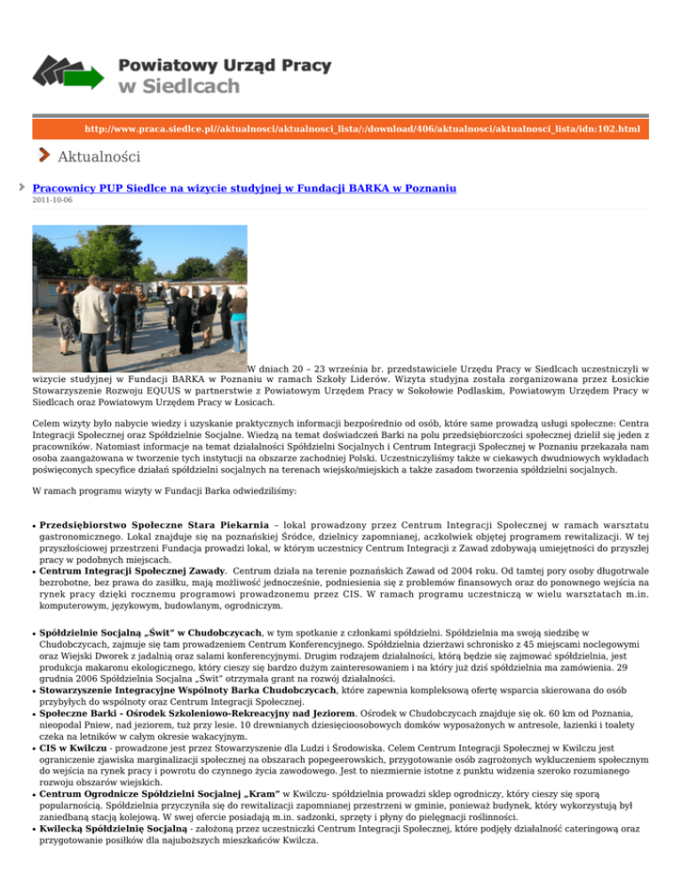 http://www.praca.siedlce.pl//aktualnosci/aktualnosci_lista/:/download/406/aktualnosci/aktualnosci_lista/idn:102.html Aktualności Pracownicy PUP Siedlce na wizycie studyjnej w Fundacji BARKA w Poznaniu 2011-10-06 W dniach 20 – 23 września br. przedstawiciele Urzędu Pracy w Siedlcach uczestniczyli w wizycie studyjnej w Fundacji BARKA w Poznaniu w ramach Szkoły Liderów. Wizyta studyjna została zorganizowana przez Łosickie Stowarzyszenie Rozwoju EQUUS w partnerstwie z Powiatowym Urzędem Pracy w Sokołowie Podlaskim, Powiatowym Urzędem Pracy w Siedlcach oraz Powiatowym Urzędem Pracy w Łosicach. Celem wizyty było nabycie wiedzy i uzyskanie praktycznych informacji bezpośrednio od osób, które same prowadzą usługi społeczne: Centra Integracji Społecznej oraz Spółdzielnie Socjalne. Wiedzą na temat doświadczeń Barki na polu przedsiębiorczości społecznej dzielił się jeden z pracowników. Natomiast informacje na temat działalności Spółdzielni Socjalnych i Centrum Integracji Społecznej w Poznaniu przekazała nam osoba zaangażowana w tworzenie tych instytucji na obszarze zachodniej Polski. Uczestniczyliśmy także w ciekawych dwudniowych wykładach poświęconych specyfice działań spółdzielni socjalnych na terenach wiejsko/miejskich a także zasadom tworzenia spółdzielni socjalnych. W ramach programu wizyty w Fundacji Barka odwiedziliśmy: ● ● ● ● ● ● ● ● Przedsiębiorstwo Społeczne Stara Piekarnia – lokal prowadzony przez Centrum Integracji Społecznej w ramach warsztatu gastronomicznego. Lokal znajduje się na poznańskiej Śródce, dzielnicy zapomnianej, aczkolwiek objętej programem rewitalizacji. W tej przyszłościowej przestrzeni Fundacja prowadzi lokal, w którym uczestnicy Centrum Integracji z Zawad zdobywają umiejętności do przyszłej pracy w podobnych miejscach. Centrum Integracji Społecznej Zawady. Centrum działa na terenie poznańskich Zawad od 2004 roku. Od tamtej pory osoby długotrwale bezrobotne, bez prawa do zasiłku, mają możliwość jednocześnie, podniesienia się z problemów finansowych oraz do ponownego wejścia na rynek pracy dzięki rocznemu programowi prowadzonemu przez CIS. W ramach programu uczestniczą w wielu warsztatach m.in. komputerowym, językowym, budowlanym, ogrodniczym. Spółdzielnie Socjalną „Świt” w Chudobczycach, w tym spotkanie z członkami spółdzielni. Spółdzielnia ma swoją siedzibę w Chudobczycach, zajmuje się tam prowadzeniem Centrum Konferencyjnego. Spółdzielnia dzierżawi schronisko z 45 miejscami noclegowymi oraz Wiejski Dworek z jadalnią oraz salami konferencyjnymi. Drugim rodzajem działalności, którą będzie się zajmować spółdzielnia, jest produkcja makaronu ekologicznego, który cieszy się bardzo dużym zainteresowaniem i na który już dziś spółdzielnia ma zamówienia. 29 grudnia 2006 Spółdzielnia Socjalna „Świt” otrzymała grant na rozwój działalności. Stowarzyszenie Integracyjne Wspólnoty Barka Chudobczycach, które zapewnia kompleksową ofertę wsparcia skierowana do osób przybyłych do wspólnoty oraz Centrum Integracji Społecznej. Społeczne Barki - Ośrodek Szkoleniowo-Rekreacyjny nad Jeziorem. Ośrodek w Chudobczycach znajduje się ok. 60 km od Poznania, nieopodal Pniew, nad jeziorem, tuż przy lesie. 10 drewnianych dziesięcioosobowych domków wyposażonych w antresole, łazienki i toalety czeka na letników w całym okresie wakacyjnym. CIS w Kwilczu - prowadzone jest przez Stowarzyszenie dla Ludzi i Środowiska. Celem Centrum Integracji Społecznej w Kwilczu jest ograniczenie zjawiska marginalizacji społecznej na obszarach popegeerowskich, przygotowanie osób zagrożonych wykluczeniem społecznym do wejścia na rynek pracy i powrotu do czynnego życia zawodowego. Jest to niezmiernie istotne z punktu widzenia szeroko rozumianego rozwoju obszarów wiejskich. Centrum Ogrodnicze Spółdzielni Socjalnej „Kram” w Kwilczu- spółdzielnia prowadzi sklep ogrodniczy, który cieszy się sporą popularnością. Spółdzielnia przyczyniła się do rewitalizacji zapomnianej przestrzeni w gminie, ponieważ budynek, który wykorzystują był zaniedbaną stacją kolejową. W swej ofercie posiadają m.in. sadzonki, sprzęty i płyny do pielęgnacji roślinności. Kwilecką Spółdzielnię Socjalną - założoną przez uczestniczki Centrum Integracji Społecznej, które podjęły działalność cateringową oraz przygotowanie posiłków dla najuboższych mieszkańców Kwilcza. Tak cenne praktyki i wskazówki, jakich udzielono nam w trakcie tych spotkań studyjnych mamy nadzieję wiele wniosą w utworzenie na naszym terenie sprawnie i prężnie funkcjonującej Spółdzielni Socjalnej. Fotogaleria wszystkie wiadomości