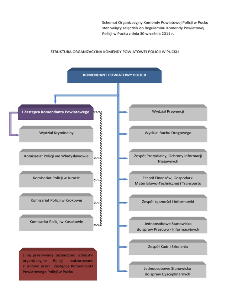 Schemat Organizacyjny Komendy Powiatowej Policji w Pucku stanowiący załącznik do Regulaminu Komendy Powiatowej Policji w Pucku z dnia 30 września 2011 r. STRUKTURA ORGANIZACYJNA KOMENDY POWIATOWEJ POLICJI W PUCKU KOMENDANT POWIATOWY POLICJI I Zastępca Komendanta Powiatowego Wydział Prewencji Wydział Kryminalny Wydział Ruchu Drogowego Komisariat Policji we Władysławowie Zespół Prezydialny, Ochrony Informacji Niejawnych Komisariat Policji w Juracie Zespół Finansów, Gospodarki Materiałowo-Technicznej i Transportu Komisariat Policji w Krokowej Zespół Łączności i Informatyki Komisariat Policji w Kosakowie Jednoosobowe Stanowisko do spraw Prasowo - Informacyjnych Zespół Kadr i Szkolenia Linią przerywaną zaznaczono jednostki organizacyjne Policji nadzorowane służbowo przez I Zastępcę Komendanta Powiatowego Policji w Pucku Jednoosobowe Stanowisko do spraw Dyscyplinarnych