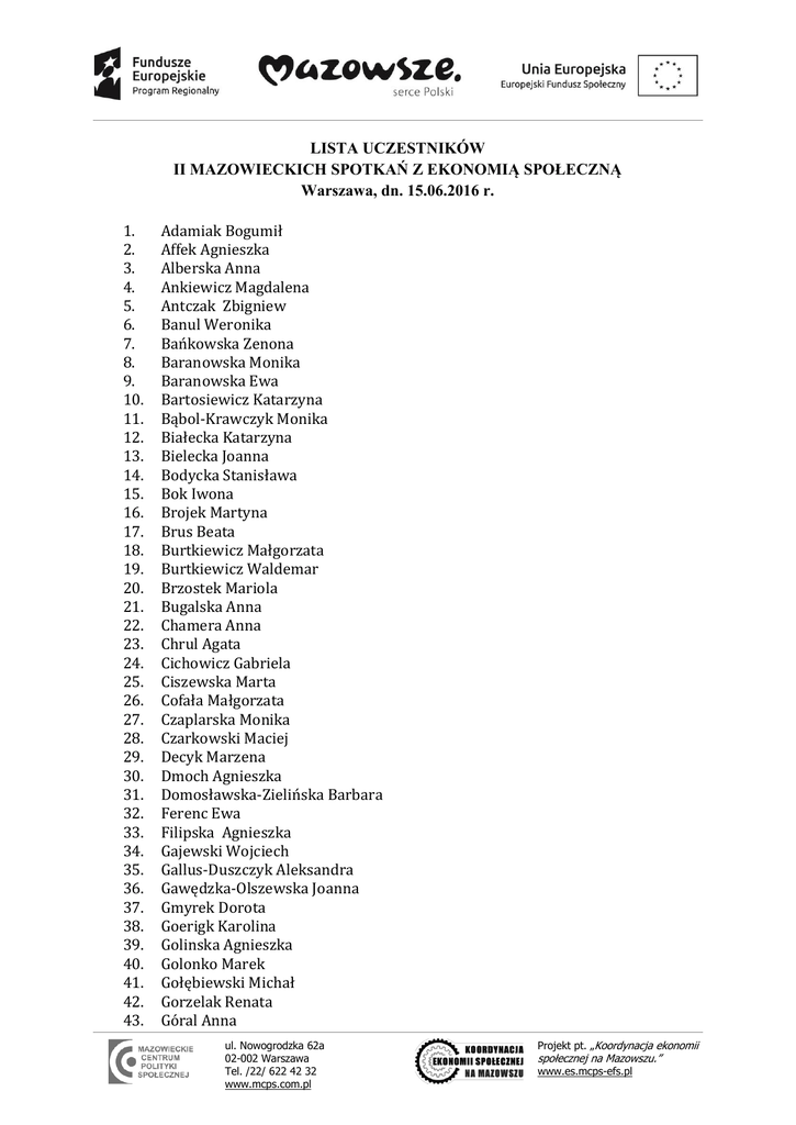 LISTA UCZESTNIKÓW II MAZOWIECKICH SPOTKAŃ Z EKONOMIĄ SPOŁECZNĄ Warszawa, dn. 15.06.2016 r. 1. 2. 3. 4. 5. 6. 7. 8. 9. 10. 11. 12. 13. 14. 15. 16. 17. 18. 19. 20. 21. 22. 23. 24. 25. 26. 27. 28. 29. 30. 31. 32. 33. 34. 35. 36. 37. 38. 39. 40. 41. 42. 43. Adamiak Bogumił Affek Agnieszka Alberska Anna Ankiewicz Magdalena Antczak Zbigniew Banul Weronika Bańkowska Zenona Baranowska Monika Baranowska Ewa Bartosiewicz Katarzyna Bąbol-Krawczyk Monika Białecka Katarzyna Bielecka Joanna Bodycka Stanisława Bok Iwona Brojek Martyna Brus Beata Burtkiewicz Małgorzata Burtkiewicz Waldemar Brzostek Mariola Bugalska Anna Chamera Anna Chrul Agata Cichowicz Gabriela Ciszewska Marta Cofała Małgorzata Czaplarska Monika Czarkowski Maciej Decyk Marzena Dmoch Agnieszka Domosławska-Zielińska Barbara Ferenc Ewa Filipska Agnieszka Gajewski Wojciech Gallus-Duszczyk Aleksandra Gawędzka-Olszewska Joanna Gmyrek Dorota Goerigk Karolina Golinska Agnieszka Golonko Marek Gołębiewski Michał Gorzelak Renata Góral Anna ul. Nowogrodzka 62a 02-002 Warszawa Tel. /22/ 622 42 32 www.mcps.com.pl Projekt pt. „Koordynacja ekonomii społecznej na Mazowszu.” www.es.mcps-efs.pl 44. 45. 46. 47. 48. 49. 50. 51. 52. 53. 54. 55. 56. 57. 58. 59. 60. 61. 62. 63. 64. 65. 66. 67. 68. 69. 70. 71. 72. 73. 74. 75. 76. 77. 78. 79. 80. 81. 82. 83. 84. 85. 86. 87. 88. 89. 90. Góral Michał Grochowski Witolld Grodzicka Natasza Huszcza Magdalena Ignaczak Aleksandra Jagiełło Katarzyna Jagodzińska Edyta Jakubien Aura Jankowski Grzegorz Jaskulska Agnieszka Jaworek Marian Jęczmienionka Jerzy Jędrzejewska Katarzyna Juraszek Radosław Kajak Katarzyna Kalina Kamil Kalina Anna Kamieńska-Karpiesiuk Edyta Kapusta Joanna Karaszkiewicz Marta Karska Bożena Kaźmierczak Sylwia Kądziela Marcin Kąkol Beata Kępista Anna Kieszek Katarzyna Klekotko Tadeusz Kobliński Ryszard Koczanowicz-Chondzyńska Julia Kołak Katarzyna Konarska Beata Konczewska Jolanta Korzeniowska Małgorzata Kosanwska Barbara Kosiorek Elżbieta Kotarba Izabela Kowalczyk Andrzej Kowalczyk Rajmund Kowalik Urszula Kowalik Weronika Kowalski Sławomir Kozioł Teresa Kozubek Elżbieta Krzaczkowska Agnieszka Kuć Agata Leśniewska Jolanta Lipska Ewa ul. Nowogrodzka 62a 02-002 Warszawa Tel. /22/ 622 42 32 www.mcps.com.pl Projekt pt. „Koordynacja ekonomii społecznej na Mazowszu.” www.es.mcps-efs.pl 91. 92. 93. 94. 95. 96. 97. 98. 99. 100. 101. 102. 103. 104. 105. 106. 107. 108. 109. 110. 111. 112. 113. 114. 115. 116. 117. 118. 119. 120. 121. 122. 123. 124. 125. 126. 127. 128. 129. 130. 131. 132. 133. 134. 135. 136. 137. Łagowska Katarzyna Macioch-Kowalska Dorota Mańkowska Magdalena Marciniuk Zbigniew Marchel Ewa Muskała Aleksandra Muzińska Aleksandra Mychowski Jerzy Niesporek Seweryn Niewinny Paweł Nowak Monika Nowakowski Arkadiusz Nowicka Dorota Nowicki Jakub Olbryś Agnieszka Ołdak Małgorzata Orlińska Monika Panek Małgorzata Pasiak Hubert Perzanowska Katarzyna Pęcherzewska Aleksandra Piecha Anna Piecha Jadwiga Pietrasik Urszula Piotrowski Sławomir Płocha Grzegorz Podleś Jolanta Prędkopowicz Daniel Rabiej Paweł Rafałowski Robert Rak Anna Reczko Katarzyna Retmaniak Stanisława Rogalska-Kusarek Magdalena Rola-Skorupska Katarzyna Rosłoniec Marek Rudnicki Marcin Rylska Magdalena Ryng Aleksandra Rytel Monika Rzepecka Diana Salomon Aneta Salwin Mirosław Schimanek Jakub Skolimowska Anna Skomiał Agnieszka Skwierczyńska Danuta ul. Nowogrodzka 62a 02-002 Warszawa Tel. /22/ 622 42 32 www.mcps.com.pl Projekt pt. „Koordynacja ekonomii społecznej na Mazowszu.” www.es.mcps-efs.pl 138. 139. 140. 141. 142. 143. 144. 145. 146. 147. 148. 149. 150. 151. 152. 153. 154. 155. 156. 157. 158. 159. 160. 161. 162. 163. 164. 165. 166. 167. 168. 169. 170. 171. 172. 173. 174. 175. Sobieska Agnieszka Stasiuk Teresa Stępień Anna Strąk Dorota Strus Hanna Strzyżewska Joanna Suska Iwona Barbara Szlagor Mirosław Szufleński Jan Szymanik Elżbieta Szymańska Anna Szymańska Monika Świątko Aneta Toporek Kazimierz Trojanowska Elżbieta Trzeciecki Andrzej Tuszyński Marek Twardowska Marta Wasilewski Krzysztof Waśkiewicz Sylwia Wejcman Zbigniew Węgrzyn Anna Wierzchowska Anna Wiewiór Iwona Winiarski Stanisława Witan Agnieszka Wojda Magdalena Wojdak-Bonisławska Agnieszka Wojewódzka Barbara Wojtkowski Adam Wróblewska Anna Zadrożna Joanna Ziemianowicz Małgorzata Ziętek Katarzyna Ziółkowska Alina Zwierz Izabela Żuber Anna Żukowska Daria Aktualizacja dnia 13.06.2016 r. ul. Nowogrodzka 62a 02-002 Warszawa Tel. /22/ 622 42 32 www.mcps.com.pl Projekt pt. „Koordynacja ekonomii społecznej na Mazowszu.” www.es.mcps-efs.pl