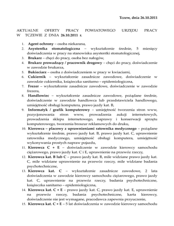 Tczew, dnia 26.10.2011 AKTUALNE OFERTY PRACY POWIATOWEGO W TCZEWIE Z DNIA 26.10.2011 r. URZĘDU PRACY Agent ochrony – osoba niekarana, Asystentka stomatologiczna – wykształcenie średnie, 5 miesięcy doświadczenia w pracy na stanowisku asystentki stomatologicznej, 3. Brukarz – chęci do pracy, osoba bez nałogów, 4. Brukarz prowadzący / pracownik drogowy – chęci do pracy, doświadczenie w zawodzie brukarza, 5. Bukieciarz – osoba z doświadczeniem w pracy w kwiaciarni, 6. Cukiernik – wykształcenie zasadnicze zawodowe, doświadczenie w zawodzie cukiernika, książeczka sanitarno – epidemiologiczna, 7. Frezer – wykształcenie zasadnicze zawodowe, doświadczenie w zawodzie frezera, 8. Handlowiec – wykształcenie zasadnicze zawodowe, pożądane średnie, doświadczenie w zawodzie handlowca lub przedstawiciela handlowego, umiejętność obsługi komputera, prawo jazdy kat. B, 9. Informatyk / grafik komputerowy – umiejętność tworzenia stron www, pozycjonowania stron www, prowadzenia aukcji internetowych, prowadzenia sklepu internetowego, naprawy i konserwacji sprzętu komputerowego, tworzenia broszur reklamowych do druku, 10. Kierowca – placowy z uprawnieniami ratownika medycznego – pożądane wykształcenie średnie, prawo jazdy kat. B, prawo jazdy kat. C, uprawnienie ratownika medycznego, umiejętność obsługi komputera, umiejętność wykonywania prostych napraw pojazdu, 11. Kierowca C + E – doświadczenie w zawodzie kierowcy samochodu ciężarowego, prawo jazdy kat. C i E, uprawnienie na przewóz rzeczy, 12. Kierowca kat. B lub C – prawo jazdy kat. B, mile widziane prawo jazdy kat. C, mile widziane uprawnienie na przewóz rzeczy, mile widziane badania psychotechniczne, 13. Kierowca kat. C – wykształcenie zasadnicze zawodowe, 2 lata doświadczenia w zawodzie kierowcy samochodu ciężarowego, prawo jazdy kat. C, uprawnienie na przewóz rzeczy, badania psychotechniczne, książeczka sanitarno – epidemiologiczna, 14. Kierowca kat. C + E – prawo jazdy kat. C, prawo jazdy kat. E, uprawnienie na przewóz rzeczy, badania psychotechniczne, karta kierowcy, doświadczenie nie jest wymagane, pracodawca zapewnia przyuczenie, 15. Kierowca kat. C + E – 5 lat doświadczenia w zawodzie kierowcy samochodu 1. 2. ciężarowego, prawo jazdy kat. C, prawo jazdy kat. E, uprawnienie na przewóz rzeczy, badania psychotechniczne, karta kierowcy, 16. Kierownik zmianowy – wykształcenie średnie zawodowe techniczne, znajomość rysunku technicznego, 3 lata doświadczenia na stanowisku kierowniczym, znajomość technik malowania, znajomość problematyki montażu, pokryć, testów ciśnieniowych, hydrauliki, dyspozycyjność, samodzielność, otwartość na nowe wyzwania, 17. Kowal – ślusarz – 3 lata doświadczenia w zawodzie kowala lub 3 lata doświadczenia w zawodzie ślusarza i jednocześnie umiejętności kowalstwa, 18. Kucharz – wykształcenie zasadnicze zawodowe gastronomiczne, 2 lata doświadczenia w zawodzie kucharza, 19. Laborant – wykształcenie średnie kierunkowe chemiczne, pożądane wyższe chemiczne, 20. Magazynier – wykształcenie zasadnicze zawodowe, pożądane wykształcenie średnie, pożądany 1 rok doświadczenia w zawodzie magazyniera, uprawnienia do obsługi wózków widłowych, 21. Malarz na mokro – 3 lata doświadczenia w zawodzie lakiernika lub malarza – operatora agregatu hydrodynamicznego, 22. Mechanik samochodowy – wykształcenie zasadnicze zawodowe mechaniczne, doświadczenie w zawodzie mechanika pojazdów samochodowych, prawo jazdy kat. B, 23. Montażysta operator – wykształcenie zasadnicze zawodowe, znajomość rysunku technicznego, doświadczenie w zawodzie ślusarza, umiejętność obsługi narzędzi ręcznych typu szlifierka, wiertarka, wkrętarka, zdolności manualne, 24. Monter 1 struktury – wykształcenie zasadnicze zawodowe, znajomość rysunku technicznego, samodzielność, znajomość technik montażu, operatywność, 25. Nauczyciel ochrony środowiska – wykształcenie wyższe kierunkowe, 26. Operator koparki – doświadczenie w pracy na podobnym stanowisku, uprawnienia do obsługi koparki, 27. Operator wózka widłowego – wykształcenie średnie, doświadczenie w zawodzie magazyniera lub kierowca operatora wózków jezdniowych, uprawnienie do obsługi wózków widłowych bocznych, umiejętność jazdy wózkami widłowymi, 2 lata doświadczenia, 28. Pełnomocnik Kancelarii – wykształcenie średnie, prawo jazdy kat. B, 29. Pomocnik montera – wykształcenie zasadnicze zawodowe, uprawnienia budowlane z energetyki, uprawnienia SEP, 30. Pracownik fizyczny – pożądane wykształcenie zasadnicze zawodowe, 1 rok doświadczenia w pracy na podobnym stanowisku, 31. Pracownik fizyczny – osoba sprawna fizycznie, 32. Pracownik fizyczny – chęci do pracy, 33. Pracownik ochrony – wykształcenie zasadnicze zawodowe, osoba z orzeczeniem o stopniu niepełnosprawności, 34. Pracownik ochrony mienia – orzeczenie o stopniu niepełnosprawności, osoba niekarana, 35. Przedstawiciel handlowy – wykształcenie średnie, umiejętność sprzedaży, 36. Przedstawiciel handlowy – wykształcenie średnie, doświadczenie w zawodzie przedstawiciela handlowego, umiejętność negocjacji, umiejętność sprzedaży, 37. Przedstawiciel handlowy – wykształcenie średnie, pożądane doświadczenie w zawodzie przedstawiciela handlowego, prawo jazdy kat. B, własny samochód, 38. Psycholog – wykształcenie wyższe, wyuczony zawód psychologa, 39. Serwisant – wykształcenie średnie techniczne, doświadczenie w zawodzie technika elektryka, technika elektronika lub technika automatyka, prawo jazdy kat. B, znajomość języka angielskiego, 40. Spawacz migomatem – wykształcenie zasadnicze zawodowe, uprawnienie na migomaty, 41. Specjalista do spraw administracji kadrowej – wykształcenie średnie, 2 lata doświadczenia w zawodzie specjalisty do spraw kadr, znajomość prawa pracy, komunikatywna znajomość języka angi