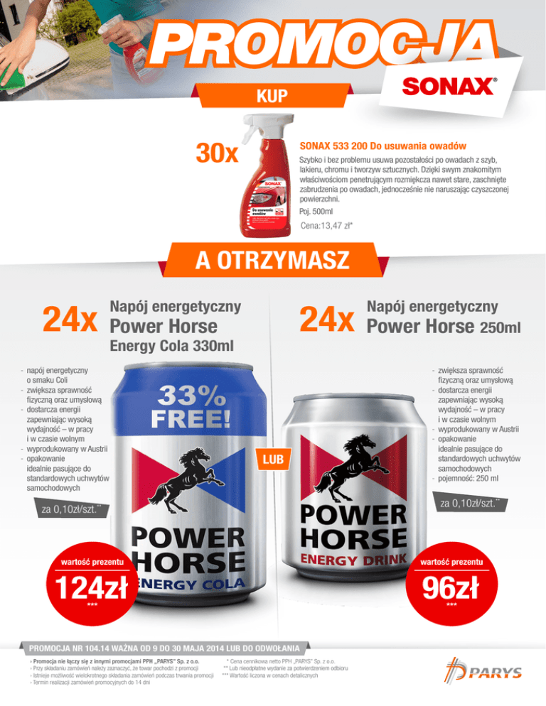 PROMOCJA KUP 30x SONAX 533 200 Do usuwania owadów Szybko i bez problemu usuwa pozostałości po owadach z szyb, lakieru, chromu i tworzyw sztucznych. Dzięki swym znakomitym właściwościom penetrującym rozmiękcza nawet stare, zaschnięte zabrudzenia po owadach, jednocześnie nie naruszając czyszczonej powierzchni. Poj. 500ml Cena:13,47 zł* A OTRZYMASZ Napój energetyczny 24x Power Horse 24x Energy Cola 330ml -- napój energetyczny o smaku Coli -- zwiększa sprawność fizyczną oraz umysłową -- dostarcza energii zapewniając wysoką wydajność – w pracy i w czasie wolnym -- wyprodukowany w Austrii -- opakowanie idealnie pasujące do standardowych uchwytów samochodowych LUB Napój energetyczny Power Horse 250ml -- zwiększa sprawność fizyczną oraz umysłową -- dostarcza energii zapewniając wysoką wydajność – w pracy i w czasie wolnym -- wyprodukowany w Austrii -- opakowanie idealnie pasujące do standardowych uchwytów samochodowych -- pojemność: 250 ml za 0,10zł/szt.** za 0,10zł/szt.** wartość prezentu wartość prezentu 124zł 96zł *** *** PROMOCJA NR 104.14 WAŻNA OD 9 DO 30 MAJA 2014 LUB DO ODWOŁANIA › Promocja nie łączy się z innymi promocjami PPH „PARYS” Sp. z o.o. › Przy składaniu zamówień należy zaznaczyć, że towar pochodzi z promocji › Istnieje możliwość wielokrotnego składania zamówień podczas trwania promocji › Termin realizacji zamówień promocyjnych do 14 dni * Cena cennikowa netto PPH „PARYS” Sp. z o.o. ** Lub nieodpłatne wydanie za potwierdzeniem odbioru *** Wartość liczona w cenach detalicznych