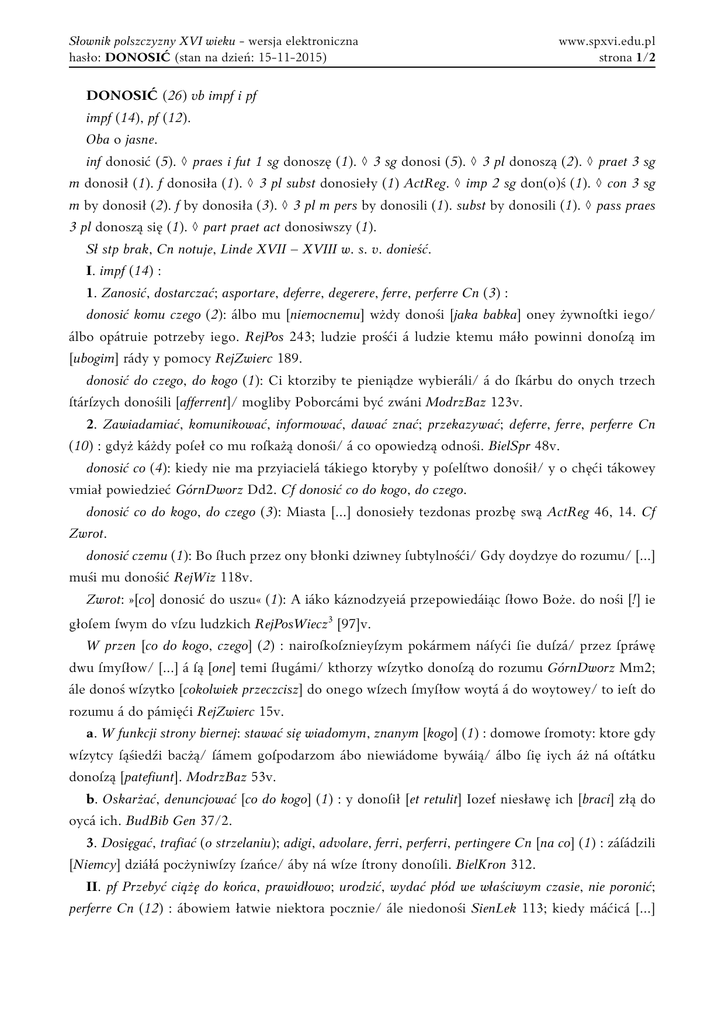 Słownik polszczyzny XVI wieku - wersja elektroniczna hasło: DONOSIĆ (stan na dzień: 15-11-2015) www.spxvi.edu.pl strona 1/2 DONOSIĆ (26) vb impf i pf impf (14), pf (12). Oba o jasne. inf donosić (5). ◊ praes i fut 1 sg donoszę (1). ◊ 3 sg donosi (5). ◊ 3 pl donoszą (2). ◊ praet 3 sg m donosił (1). f donosiła (1). ◊ 3 pl subst donosieły (1) ActReg. ◊ imp 2 sg don(o)ś (1). ◊ con 3 sg m by donosił (2). f by donosiła (3). ◊ 3 pl m pers by donosili (1). subst by donosili (1). ◊ pass praes 3 pl donoszą się (1). ◊ part praet act donosiwszy (1). Sł stp brak, Cn notuje, Linde XVII – XVIII w. s. v. donieść. I. impf (14) : 1. Zanosić, dostarczać; asportare, deferre, degerere, ferre, perferre Cn (3) : donosić komu czego (2): álbo mu [niemocnemu] wżdy donośi [jaka babka] oney żywnoſtki iego/ álbo opátruie potrzeby iego. RejPos 243; ludzie prośći á ludzie ktemu máło powinni donoſzą im [ubogim] rády y pomocy RejZwierc 189. donosić do czego, do kogo (1): Ci ktorziby te pieniądze wybieráli/ á do ſkárbu do onych trzech ſtárſzych donośili [afferrent]/ mogliby Poborcámi być zwáni ModrzBaz 123v. 2. Zawiadamiać, komunikować, informować, dawać znać; przekazywać; deferre, ferre, perferre Cn (10) : gdyż káżdy poſeł co mu roſkażą donośi/ á co opowiedzą odnośi. BielSpr 48v. donosić co (4): kiedy nie ma przyiacielá tákiego ktoryby y poſelſtwo donośił/ y o chęći tákowey vmiał powiedzieć GórnDworz Dd2. Cf donosić co do kogo, do czego. donosić co do kogo, do czego (3): Miasta [...] donosieły tezdonas prozbę swą ActReg 46, 14. Cf Zwrot. donosić czemu (1): Bo ſłuch przez ony błonki dziwney ſubtylnośći/ Gdy doydzye do rozumu/ [...] muśi mu donośić RejWiz 118v. Zwrot: »[co] donosić do uszu« (1): A iáko káznodzyeiá przepowiedáiąc ſłowo Boże. do nośi [!] ie głoſem ſwym do vſzu ludzkich RejPosWiecz3 [97]v. W przen [co do kogo, czego] (2) : nairoſkoſznieyſzym pokármem náſyći ſie duſzá/ przez ſpráwę dwu ſmyſłow/ [...] á ſą [one] temi ſługámi/ kthorzy wſzytko donoſzą do rozumu GórnDworz Mm2; ále donoś wſzytko [cokolwiek przeczcisz] do onego wſzech ſmyſłow woytá á do woytowey/ to ieſt do rozumu á do pámięći RejZwierc 15v. a. W funkcji strony biernej: stawać się wiadomym, znanym [kogo] (1) : domowe ſromoty: ktore gdy wſzytcy ſąśiedźi bacżą/ ſámem goſpodarzom ábo niewiádome bywáią/ álbo ſię iych áż ná oſtátku donoſzą [patefiunt]. ModrzBaz 53v. b. Oskarżać, denuncjować [co do kogo] (1) : y donoſił [et retulit] Iozef niesławę ich [braci] złą do oycá ich. BudBib Gen 37/2. 3. Dosięgać, trafiać (o strzelaniu); adigi, advolare, ferri, perferri, pertingere Cn [na co] (1) : záſádzili [Niemcy] dziáłá pocżyniwſzy ſzańce/ áby ná wſze ſtrony donoſili. BielKron 312. II. pf Przebyć ciążę do końca, prawidłowo; urodzić, wydać płód we właściwym czasie, nie poronić; perferre Cn (12) : ábowiem łatwie niektora pocznie/ ále niedonośi SienLek 113; kiedy máćicá [...] Słownik polszczyzny XVI wieku - wersja elektroniczna hasło: DONOSIĆ (stan na dzień: 15-11-2015) www.spxvi.edu.pl strona 2/2 zácząć/ álbo donośić niemoże Oczko 23; á ówém [niewiastam] co więc donośić niemogą/ áby przed czáſem nieporzucáły/ [cieplice] lepiéy niż inſze wſzyſtkich bab párzenia prędzey rátuią. Oczko 15v. Zwroty: »czasu, do czasu (słusznego, słusznie) donosić« [szyk zmienny] (4 : 1): FalZioł I 155b; gdy Sará (donośiwſzy słuſznego czaſu) żywe dźieciątko porodźi. BibRadz I 9v marg; Bachuſá ktory ſie był pocżął w żywocie v niey [Semele] wyrwał prętko/ włożył do ſwoiego łoná iżby czáſu donośił BielKron 21; SienLek 113; Druga rzecż/ piſmo ś. vcży/ iż Márya Panná pocżąwſzy/ cżáſu ſłuſznego donośiłá/ y dźiećiątko vrodźiłá NiemObr 144. »dzieciątka, płodu, dziecię (nie) donosić« [szyk zmienny] (3 : 1 : 1): Też aby pani mogla donoſić dzieciątka w żywocie FalZioł I 38d; yteż dzieciątka niedopuſzcża [pes corvinus] donoſić FalZioł I 107b; Niewiaſta iżby dziecię donoſiła do cżaſu ſłuſznego FalZioł I 155b, *3a, V [30]. Synonimy: I. 1. dawać, dostarczać; 2. powiadać; b. oskarżać; 3. dosięgać, osięgać, przylatywać. Formacje pochodne cf NIEŚĆ. Cf DONOSZENIE, DONOSZONY LZ