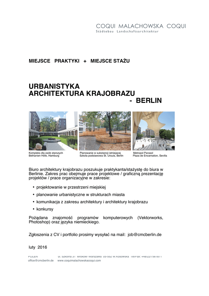 COQUI MALACHOWSKA COQUI Städtebau Landschaftsarchitektur MIEJSCE PRAKTYKI + MIEJSCE STAŻU URBANISTYKA ARCHITEKTURA KRAJOBRAZU - BERLIN Kompleks dla osób starszych Bethanien Höfe, Hamburg Planowanie w substancji istniejacej Szkola podstawowa St. Ursula, Berlin Metropol Parasol Plaza de Encarnation, Sevilla Biuro architektury krajobrazu poszukuje praktykanta/stażystę do biura w Berlinie. Zakres prac obejmuje prace projektowe / graficzną prezentację projektów / prace organizacyjne w zakresie: • projektowanie w przestrzeni miejskiej • planowanie urbanistyczne w strukturach miasta • komunikacja z zakresu architektury i architektury krajobrazu • konkursy Pożądana znajomość programów komputerowych Photoshop) oraz języka niemieckiego. (Vektorworks, Zgłoszenia z CV i portfolio prosimy wysyłać na mail: [email protected] luty 2016 DEUTSCHLAND POLEN [email protected] Ahornstr. 6 12163 Berlin Tel: +49 /30 /79747881, 2 Fax: +49 /30 /79747883 ul. Szkolna 31 Mroków/ Warszawa 05-552 W.Kosowska Tel/Fax: +48/22/7561871 www.coquimalachowskacoqui.com COQUI MALACHOWSKA COQUI Städtebau Landschaftsarchitektur