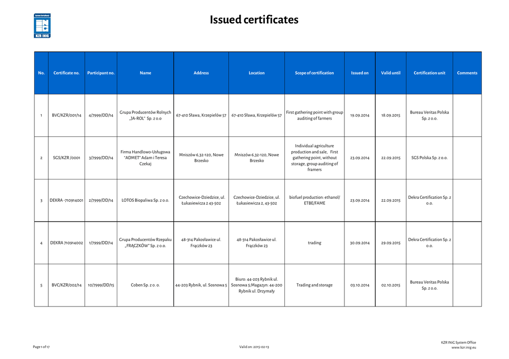 Issued certificates No. Certificate no. Participant no. Name Address Location Scope of certification Issued on Valid until Certification unit 1 BVC/KZR/001/14 4/7999/DD/14 Grupa Producentów Rolnych „JA-ROL” Sp. z o.o 67-410 Sława, Krzepielów 57 67-410 Sława, Krzepielów 57 First gathering point with group auditing of farmers 19.09.2014 18.09.2015 Bureau Veritas Polska Sp. z o.o. Mniszów 6,32-120, Nowe Brzesko Mniszów 6,32-120, Nowe Brzesko Individual agriculture production and sale, First gathering point, without storage, group auditing of framers 23.09.2014 22.09.2015 SGS Polska Sp. z o.o. 2 SGS/KZR /0001 3/7999/DD/14 Firma Handlowo-Usługowa “ADMET” Adam i Teresa Czekaj 3 DEKRA -710914001 2/7999/DD/14 LOTOS Biopaliwa Sp. z o.o. Czechowice-Dziedzice, ul. Łukasiewicza 2 43-502 Czechowice-Dziedzice, ul. Łukasiewicza 2, 43-502 biofuel production: ethanol/ ETBE/FAME 23.09.2014 22.09.2015 Dekra Certification Sp. z o.o. 4 DEKRA 710914002 1/7999/DD/14 Grupa Producentów Rzepaku „FRĄCZKÓW” Sp. z o.o. 48-314 Pakosławice ul. Frączków 23 48-314 Pakosławice ul. Frączków 23 trading 30.09.2014 29.09.2015 Dekra Certification Sp. z o.o. 5 BVC/KZR/002/14 10/7999/DD/15 Coben Sp. z o. o. Trading and storage 03.10.2014 02.10.2015 Bureau Veritas Polska Sp. z o.o. Page 1 of 17 Biuro: 44-203 Rybnik ul. 44-203 Rybnik, ul. Sosnowa 5 Sosnowa 5;Magazyn: 44-200 Rybnik ul. Drzymały Valid on: 2015-02-13 Comments KZR INiG System Office www.kzr.inig.eu Issued certificates No. Certificate no. Participant no. 6 BVC/KZR/003/14 5/7999/DD/14 7 DEKRA-711014003 8 Location Scope of certification Issued on Valid until Certification unit GPR Zbóż i Rzepaku Węgierce 88-160 Janikowo, Węgierce 1 Sp. z o.o 88-170 Pakość, ul. Lipowa 13 First gathering point, without storage, group auditing of framers 08.10.2014 07.10.2015 Bureau Veritas Polska Sp. z o.o. 9/7999/DD/14 Grupa Producentów "ŁosiówZboża" Sp. z o.o. 49-330 Łosiów, ul. Główna 1 49-330 Łosiów, ul. Główna 1 First gathering point, without storage, group auditing of framers 17.10.2014 16.10.2015 Dekra Certification Sp. z o.o DEKRA-711014004 8/7999/DD/14 Grupa Producentów "ŁosiówRzepak" Sp. z o.o. 49-330 Łosiów, ul. Główna 1 49-330 Łosiów, ul. Główna 1 First gathering point, without storage, group auditing of framers 17.10.2014 16.10.2015 Dekra Certification Sp. z o.o 9 BVC/KZR/004/14 16/7999/DD/14 Play Bev Poland Sp. z o.o. 63-500 Ostrzeszów, ul Gen. 50-123 Wrocław, ul. Oławska 9 Sikorskiego 12 Trading and storage 16.10.2014 15.10.2015 Bureau Veritas Polska Sp. z o.o. 10 SGS/KZR/0002 22/7999/DD/14 P.P.H. Pols Meat Justyna Jaensch Kaczanowo, ul. Kaliska 103 melting of animal fat 20.10.2014 19.10.2015 SGS Polska Sp. z o.o. Page 2 of 17 Name Address Kaczanowo ul. Kaliska 103; Nowy Dwór 14-300 Morąg Valid on: 2015-02-13 Comments KZR INiG System Office www.kzr.inig.eu Issued certificates No. Certificate no. Participant no. Name Address Location Scope of certification Issued on Valid until Certification unit 11 BVC/KZR/006/14 06/7999/DD/14 Capital EU Sp. z o.o. 00-019 Warszawa, ul. Złota 7/18 00-019 Warszawa, ul. Złota 7/18 trading 20.10.2014 19.10.2015 Bureau Veritas Polska Sp. z o.o. 12 BVC/KZR/005/14 12/7999/DD/14 Edward Bartczak Transport Ciężarowy, Skup i Sprzedaż 88-210 Dobre, Koszczały 32 88-210 Dobre, Koszczały 32 First gathering point, storage, group auditing of farmers 22.10.2014 21.10.2014 Bureau Veritas Polska Sp. z o.o. 13 BVC/KZR/007/14 15/7999/DD/14 Młyn Grażyna Sp. j. Adam Dzwoniarkiewicz i Wspólnicy 88-150 Kruszwica, Racice 31 88-150 Kruszwica, Racice 31 First gathering point, storage, group auditing of farmers, trading 23.10.2014 22.10.2014 Bureau Veritas Polska Sp. z o.o. Individual agriculture production, First gathering point, group auditing of farmers, trading, distillery, biofuel producer (ethanol) 31.10.2014 30.10.2015 SGS Polska Sp. z o.o. First gathering point, without storage, group auditing of framers 04.112014 03.11.2015 Dekra Certification Sp. z o.o. 14 SGS/KZR/0003 25/7999/DD/14 Podlaskie Gorzelnie "Surwin" Sp. z o.o. 09-410 Wohyń, Suchowola 105 "Gorzelania Suchowola" Kuraszew 71, 21-310 Wohyń; "Gorzelania Witulin" Witulin 62, 21-542 Leśna Podlaska 15 DEKRA-711114005 28/7999/DD/14 Grupa Producentów Rolnych Plantator Sp. z o.o. 49-200 Grodków, Wierzbnik 45C 49-200 Grodków, Wierzbnik 45C Page 3 of 17 Valid on: 2015-02-13 Comments KZR INiG System Office www.kzr.inig.eu Issued certificates No. Certificate no. Participant no. Name Address 16 BVC/KZR/008 18/7999/DD/14 Taxspot Sp. z o.o 40-008 Katowice, ul. Warszawska 46/3 17 SGS/KZR/0004 26/7999/DD/14 Grupa Producentów Grunt Sp. z o.o. 58-130 Żarów, Tarnawa 4 18 SGS/KZR/0005 32/7999/DD/14 Grupa Producentów „ZŁOTY KŁOS” Sp. z o.o. 19 DEKRA-71111006 17/7999/DD/14 Bio-SG Sławomir Grining 20 BVC/KZR/009/14 21/7999/DD/14 Page 4 of 17 Issued on Valid until Certification unit First gathering point, storage, 66-100 Sulechów, Brzezie k/Sulechowa, ul. J. Czapskiego group auditing of farmers, Oil 55 mill, trading 01.11.2014 31.10.2015 Bureau Veritas Polska Sp. z o.o. First gathering point, without storage, group auditing of framers 05.11.2014 04.11.2015 SGS Polska Sp. z o.o. 55-200 Oława, Godzikowice 55-200 Oława, Godzikowice 55 C 55 C First gathering point, without storage, group auditing of framers 05.11.2014 04.11.2015 SGS Polska Sp. z o.o. 67-400 Wschowa, ul. Zacisze 67-400 Wschowa, ul. Zacisze 12 12 Trading and storage 07.11.2014 06.11.2015 Dekra Certification Sp. z o.o. First gathering point, storage, group auditing of farmers 06.11.2014 05.11.2015 Bureau Veritas Polska Sp. z o.o. Przedsiebiorstwo ProdukcyjnoHandlowo-Usługowe 08-210 Platerów, ul. Górki 13 "BOFERM" Marcin Bojdo Location 58-130 Żarów, Tarnawa 4 08-210 Platerów, ul. Górki 13 Valid on: 2015-02-13 Scope of certification Comments KZR INiG System Office www.kzr.inig.eu Issued certificates No. Certificate no. Participant no. Name 21 BVC/010/14 23/7999/DD/14