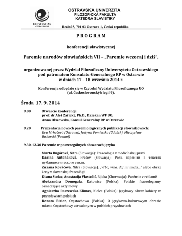 OSTRAVSKÁ UNIVERZITA FILOZOFICKÁ FAKULTA KATEDRA SLAVISTIKY Reální 5, 701 03 Ostrava 1, Česká republika PROGRAM konferencji slawistycznej Paremie narodów słowiańskich VII – „Paremie wczoraj i dziś“, organizowanej przez Wydział Filozoficzny Uniwersytetu Ostrawskiego pod patronatem Konsulatu Generalnego RP w Ostrawie w dniach 17 – 18 września 2014 r. Konferencja odbędzie się w Czytelni Wydziału Filozoficznego UO (ul. Československýh legií 9). Środa 17. 9. 2014 9.00 Otwarcie konferencji: prof. dr Aleš Zářický, Ph.D., Dziekan WF UO, Anna Olszewska, Konsul Generalny RP w Ostrawie 9.20 Prezentacja nowych paremiologicznych publikacji słownikowych: Eva Mrhačová (Ostrawa), Justyna Pomierska (Gdańsk), Mieczysław Balowski (Poznań) 9.30-12.30 Paremie w poszczególnych obszarach języka Marta Bugárová, Nitra (Słowacja): Frazeológia v medicínskej praxi Darina Antoňáková, Prešov (Słowacja): Роль паремий в текстах публицистического стиля. Zuzana Kováčová, Nitra (Słowacja): „Vŕba, vŕba, daj mi muža…“ alebo obraz ženy v slovenskej frazeológii Diana Stolac, Anastazija Vlastelić, Rijeka (Chorwacja): Parémie v reklamě Aleksandra Domogała, Katowice (Polska): Polskie frazeologizmy oznaczające akty mowy Agnieszka Raszewska-Klimas, Kielce (Polska): Językowy obraz kobiety w przysłowiach polskich Renata Bizior, Częstochowa (Polska): O językowo-kulturowym obrazie miasta Częstochowy utrwalonym w polskich przysłowiach OSTRAVSKÁ UNIVERZITA FILOZOFICKÁ FAKULTA KATEDRA SLAVISTIKY Reální 5, 701 03 Ostrava 1, Česká republika Renata Dźwigoł, Kraków (Polska): „Gdybym był bogaty…“ – obraz człowieka bogatego w polskich przysłowiach Ewa Horyń, Kraków (Polska): Leksem sól i jego derywaty w utrwalonych połączeniach wyrazowych Lidia Pacan Bonarek, Piotrków Trybunalski (Polska): Imiona w polskich przysłowiach – analiza statystyczna Iwona Steczko, Kraków (Polska): Czas ucieka, wieczność czeka – o sentencjach dotyczących czasu i śmierci umieszczanych na zegarach Włodzimierz Wysoczański, Wrocław (Polska): Zbiory i opisanie przysłów poszczególnych regionów Polski 13.30-17.00 Problematyka historyczna paremii Julia Shpak, Kharkiv (Ukraina): Інтерпретація українських народних прикмет у минулому та сьогодні (на матеріалі козацьких літописів). Estela Banov, Rijeka (Chorwacja): Hrvatske poslovice u prosvjetiteljskim i predromantičarskim tiskanim izdanjima Lucyna Warda-Radys, Gdańsk (Polska): Formy i funkcje frazeologizmów i przysłów w wybranych XIX-wiecznych pamiętnikach kobiet Joanna Kuć, Siedlce (Polska): Zestawienia leksykalne w XIX-wiecznych aktach notarialnych z terenu Podlasia Ewa Zmuda, Kraków (Polska): Frazeologia w siedemnastowiecznych modlitewnikach karmelitánských Artur Czesak, Kraków (Polska): Dwa zbiory przysłów spod Krakowa (Zagórze i Bibice) Paremie w literaturze Marta Pančíková, Ostrava (Czechy): Analýza lexiky v slovanských ľudových piesňach Natália Korina, Renáta Hlavatá, Nitra (Słowacja): Frazeologizmy v umeleckej slovenskej a ruskej literatúre s historickou tematikou jako odraz historicko-komunikačného kontextu Katarína Dudová, Nitra (Słowacja): Súčasný koncept práce vo vybraných slovenských paremiologických jednotkách Martyna Kownacka, Kraków (Polska): Protrida quaedam proverbia. Analiza i interpretacja wybranych przysłów zawartych w trzeciej części Namów rozlicznych dla użytku nauky dźyatek wyłożonych Jana Murmeliusa OSTRAVSKÁ UNIVERZITA FILOZOFICKÁ FAKULTA KATEDRA SLAVISTIKY Reální 5, 701 03 Ostrava 1, Česká republika Maciej Mączyński, Kraków (Polska): Uwagi o funkcjach pieśni ludowych w Legendzie Tatr Kazimierza Przerwy-Tetmajera Danuta Mucha, Piotrków Trybunalski (Polska): Paremie w twórczości poetyckiej Igora Sikiryckiego (1920-1985) dla dzieci 18.00 Uroczysta recepcja w konsulacie RP w Ostrawie Czwartek 18. 9. 2014 8.00-12.00 Sekcja I – Paremie w językach słowiańskich Milada Jankovičová, Banská Bystrica (Słowacja): Hudobné frazémy v slovenskej a ruskej frazeológii Marianna Sedláková, Iveta Bónová, Oxana Humena, Košice (Słowacja): Princípy porovnávania frazém v slovanských jazykoch Anastasiia Pogrebniak, Alevtina Speranskaya, Krasnojarsk (Rosja): Оппозиции в русских и польских паремиях с ключевыми словами Бог и Bóg Olesja Sergejenko, Omsk (Rosja): К вопросу о выявлении паремиологического минимума чешского языка Joanna Mampe, Gdańsk (Polska): Pragmatyczna analiza polskich i rosyjskich przysłów o żonie i mężu Dariusz Tkaczewski, Katowice (Polska): Czeskie i polskie frazeologizmy i przysłowia dotyczące zmysłów i narządów zmysłów Ewa Straś, Katowice (Polska): Языковая идиоматика и этническая ментальность (на материале русской и польской батальной паремиологии) Krystyna Jarząbek, Katowice (Polska): Uśmiech w komunikacji Polaków i Rosjan oraz jego odzwierciedlenie w paremiach Katarzyna Dembska, Toruń (Polska): Kontaminacja jako sposób tworzenia antyprzysłów (na materiale języka polskiego i rosyjskiego) Justyna Pomierska, Gdańsk (Polska): Powiązania paremiograficzne i paremiologiczne kaszubsko-czeskie Zuzanna Kalicka-Karpowicz, Gdańsk (Polska): Władza i pieniądze w polskich i rosyjskich neologizmach frazeologicznych z lat 1990-2007 (na podstawie Polnisch-deutsches Wörterbuch der Neologismen i Russischdeutsches Wörterbuch der Neuen Wörter) OSTRAVSKÁ UNIVERZITA FILOZOFICKÁ FAKULTA KATEDRA SLAVISTIKY Reální 5, 701 03 Ostrava 1, Česká republika Alicja Przyszlak, Opole (Polska): Z problemów międzyjęzykowej ekwiwalencji paremii i przepowiedni pogodowych (na materiale 