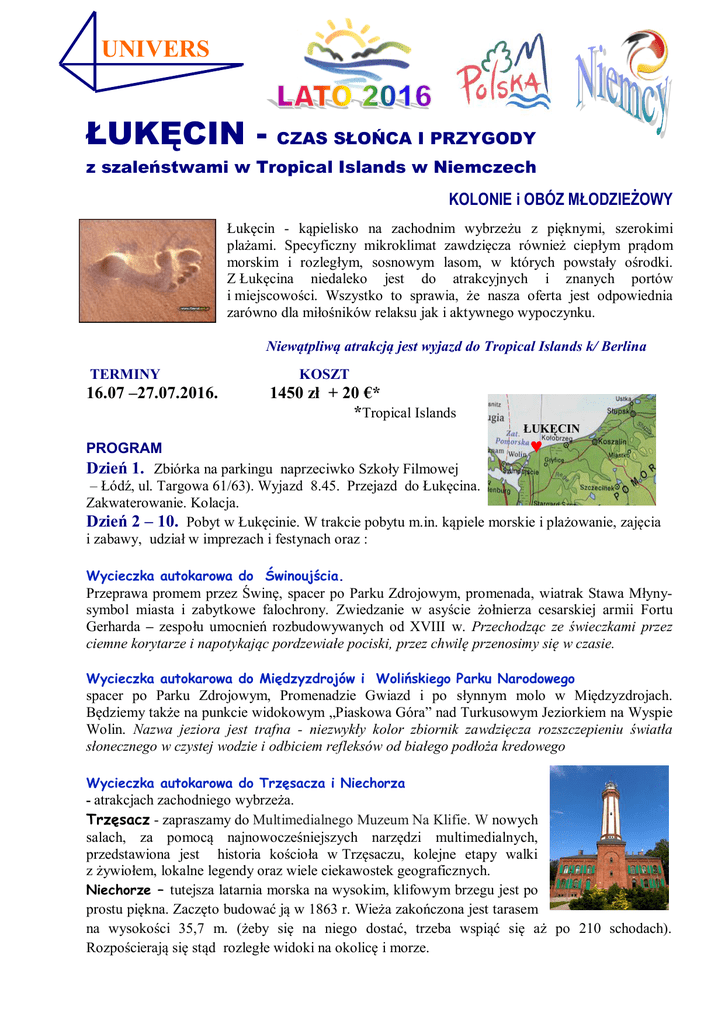 UNIVERS ŁUKĘCIN - CZAS SŁOŃCA I PRZYGODY z szaleństwami w Tropical Islands w Niemczech KOLONIE i OBÓZ MŁODZIEŻOWY Łukęcin - kąpielisko na zachodnim wybrzeżu z pięknymi, szerokimi plażami. Specyficzny mikroklimat zawdzięcza również ciepłym prądom morskim i rozległym, sosnowym lasom, w których powstały ośrodki. Z Łukęcina niedaleko jest do atrakcyjnych i znanych portów i miejscowości. Wszystko to sprawia, że nasza oferta jest odpowiednia zarówno dla miłośników relaksu jak i aktywnego wypoczynku. Niewątpliwą atrakcją jest wyjazd do Tropical Islands k/ Berlina TERMINY 16.07 –27.07.2016. KOSZT 1450 zł + 20 €* *Tropical Islands ŁUKĘCIN PROGRAM ♥ Dzień 1. Zbiórka na parkingu naprzeciwko Szkoły Filmowej – Łódź, ul. Targowa 61/63). Wyjazd 8.45. Przejazd do Łukęcina. Zakwaterowanie. Kolacja. Dzień 2 – 10. Pobyt w Łukęcinie. W trakcie pobytu m.in. kąpiele morskie i plażowanie, zajęcia i zabawy, udział w imprezach i festynach oraz : Wycieczka autokarowa do Świnoujścia. Przeprawa promem przez Świnę, spacer po Parku Zdrojowym, promenada, wiatrak Stawa Młynysymbol miasta i zabytkowe falochrony. Zwiedzanie w asyście żołnierza cesarskiej armii Fortu Gerharda – zespołu umocnień rozbudowywanych od XVIII w. Przechodząc ze świeczkami przez ciemne korytarze i napotykając pordzewiałe pociski, przez chwilę przenosimy się w czasie. Wycieczka autokarowa do Międzyzdrojów i Wolińskiego Parku Narodowego spacer po Parku Zdrojowym, Promenadzie Gwiazd i po słynnym molo w Międzyzdrojach. Będziemy także na punkcie widokowym „Piaskowa Góra” nad Turkusowym Jeziorkiem na Wyspie Wolin. Nazwa jeziora jest trafna - niezwykły kolor zbiornik zawdzięcza rozszczepieniu światła słonecznego w czystej wodzie i odbiciem refleksów od białego podłoża kredowego Wycieczka autokarowa do Trzęsacza i Niechorza - atrakcjach zachodniego wybrzeża. Trzęsacz - zapraszamy do Multimedialnego Muzeum Na Klifie. W nowych salach, za pomocą najnowocześniejszych narzędzi multimedialnych, przedstawiona jest historia kościoła w Trzęsaczu, kolejne etapy walki z żywiołem, lokalne legendy oraz wiele ciekawostek geograficznych. Niechorze – tutejsza latarnia morska na wysokim, klifowym brzegu jest po prostu piękna. Zaczęto budować ją w 1863 r. Wieża zakończona jest tarasem na wysokości 35,7 m. (żeby się na niego dostać, trzeba wspiąć się aż po 210 schodach). Rozpościerają się stąd rozległe widoki na okolicę i morze. Będziemy także wędrować plażą, podziwiać zachody słońca, szaleć na dyskotekach i świetnie się bawić. Dzień 11. Po śniadaniu wykwaterowanie. Przejazd do Tropical Islands w Niemczech Na wyjazd prowiant. Uczestnicy muszą posiadać strój kąpielowy (bez czepka) i klapki basenowe. Około ośmiogodzinny pobyt w tropikalnym aqua parku. Temp. wody w basenach od 28-31oC, powietrza 27 oC. „Nad nami kopuła o wysokości 3 bloków 10-cio piętrowych przykrywająca teren odpowiadający ośmiu stadionom piłki nożnej. Jest tu m.in.: ogród, bagno, laguna, las tropikalny i plaża z setką palm kokosowych i 12-metrowymi fikusami. Dzieci budują zamki z piasku lub grają w piłkę plażową. Dookoła stoją leżaki i stoliki. Na każdym kroku laguna zaskakuje nas czymś nowym: sztuczne wiry, fontanny pojawiające się nagle pod stopami, zakamarki z wirami w jaskiniach porośniętych bujną roślinnością”. www.my-tropical-islands.com - strona także w języku polskim. Wieczorem wyjazd do Polski. Obiadokolacja na trasie. Dalsza droga. Dzień 12. Przyjazd na miejsce zbiórki we wczesnych godzinach porannych. ŚWIADCZENIA Transport – autokar Zakwaterowanie – ośrodek wczasowo – kolonijny „Wrzos” w Łukęcinie. Pokoje 3-5 os. z łazienkami. www.owwrzos.ta.pl. Teren ogrodzony w sosnowym lesie. Świetlice ze sprzętem TV i dyskotekowym. Odległość od morza ok. 200 m. Własna wydzielona plaża z ratownikiem. Na terenie ośrodka m.in. własny basen letni, boiska sportowe, kort tenisowy, stoły bilardowe i do tenisa stołowego, sklepik. W obiekcie za niewielką odpłatnością: sauna, siłownia, jacuzzi ( 1 x gratis ) Wyżywienie: 4 posiłki dziennie. Na wycieczki całodniowe prowiant Opieka kadry pedagogicznej, ratowników, medyczna. Ubezpieczenie NNW i KL na dni wyjazdów za granicę Wycieczki i wstępy jak w programie, gry, zabawy, dyskoteki. Uwaga ! na wyjazd konieczny paszport lub d.o. _______________________________________________________________________________ UNIVERS – Biuro Turystyczne tel. (42) 630 52 12 fax (42) 633 79 00 90-307 Łódź Al. Piłsudskiego 35 [email protected] www.btunivers.pl