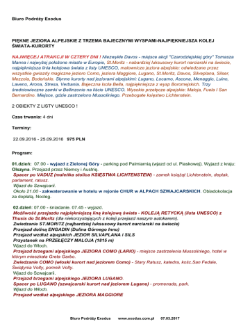 Biuro Podróży Exodus PIĘKNE JEZIORA ALPEJSKIE Z TRZEMA BAJECZNYMI WYSPAMI-NAJPIĘKNIEJSZA KOLEJ ŚWIATA-KURORTY NAJWIĘCEJ ATRAKCJI W CZTERY DNI ! Niezwykłe Davos - miejsce akcji "Czarodziejskiej góry" Tomasza Manna i najwyżej położone miasto w Europie, St.Moritz - nabardziej luksusowy kurort narciarski na świecie, najpiękniejsza linia kolejowa świata z listy UNESCO, malownicze jeziora alpejskie: odwiedzane przez wszystkie gwiazdy magiczne jezioro Como, jeziora Maggiore, Lugano, St.Moritz, Davos, Silveplana, Silser, Mezzola, Bodeńskie. Słynne kurorty nad jeziorami alpejskimi: Lugano, Locarno, Ascona, Menaggio, Luino, Laveno, Arona, Stresa, Verbania. Bajeczna Isola Bella, najpiękniejsza z wysp Boromejskich. Trzy średniowieczne zamki w Bellinzonie na liście UNESCO. Wysokie przełęcze alpejskie: Maloja, Fuela I San Bernardino. Miejsce, gdzie zastrzelono Mussoliniego. Przebogate księstwo Lichtenstein. 2 OBIEKTY Z LISTY UNESCO ! Czas trwania: 4 dni Terminy: 22.09.2016 - 25.09.2016 975 PLN Program: 01.dzień: 07.00 - wyjazd z Zielonej Góry - parking pod Palmiarnią (wjazd od ul. Piaskowej). Wyjazd z kraju: Olszyna. Przejazd przez Niemcy i Austrię. Spacer po VADUZ (maleńka stolica KSIĘSTWA LICHTENSTEIN) - zamek książąt Lichtenstein, deptak, parlament, ratusz. Wjazd do Szwajcarii. Około 21.00 - zakwaterowanie w hotelu w rejonie CHUR w ALPACH SZWAJCARSKICH. Obiadokolacja za dopłatą. Nocleg. 02.dzień: 07.00 - śniadanie. 07.45 - wyjazd. Możliwość przejazdu najpiękniejszą liną kolejową świata - KOLEJĄ RETYCKĄ (lista UNESCO) z Thusis do St.Moritz (dla niekorzystających z koleji przejazd naszym autokarem). Zwiedzanie ST.MORITZ (najbardziej luksusowy kurort narciarski na świecie) Przejazd doliną ENGADIN (Dolina Górnego Innu) Przejazd wzdłuż alpejskich JEZIOR SILVAPLANA i SILS Przystanek na PRZEŁĘCZY MALOJA (1815 m) Wjazd do Włoch. Przejazd brzegami alpejskiego JEZIORA COMO (LARIO) - miejsce zastrzelenia Mussoliniego, hotel w którym mieszkała Greta Garbo. Zwiedzanie COMO (włoski kurort nad jeziorem Como) - Stary Ratusz, katedra, kośc.San Fedale, Świątynia Volty, pomnik Volty. Wjazd do Szwajcarii. Przejazd brzegami alpejskiego JEZIORA LUGANO. Spacer po LUGANO (szwajcarski kurort nad jeziorem Lugano) - promenada, park. Wjazd do Włoch. Przejazd wzdłuż alpejskiego JEZIORA MAGGIORE Biuro Podróży Exodus www.exodus.com.pl 07.03.2017 Około 20.00 - zakwaterowanie w hotelu w rejonie JEZIORA MAGIORRE. Obiadokolacja za dopłatą. Nocleg. 03.dzień: 07.00 - śniadanie. 07.45 - wyjazd. Możliwość wycieczki promem na boską ISOLA BELLA (najpiękniejsza z wysp Boromejskich) - pałac Boromeuszy, ogrody pałacowe. Wjazd do Szwajcarii. Spacer po ASCONIE (szwajcarski kurort nad jeziorem Maggiore). Spacer po LOCARNO (szwajcarski kurort nad jeziorem Maggiore). Przejazd przez BELLINZONĘ (lista UNESCO) - widok na trzy średniowieczne zamki. Przejazd pod imponującym zamkiem MESOCCO. Przejazd tunelem pod PRZEŁĘCZĄ SAN BERNARDINO. Zwiedzanie DAVOS (alpejski kurort znany z powieści "Czarodziejska góra" T.Manna, najwyżej położone miasto w Europie - 1560m) - promenada, Park Zdrojowy, Centrum Kongresowe, wyjazd kolejką do Hotelu Schatzalp - 1861m - miejsca akcji "Czarodziejskiej góry" (w przypadku dostępności). Wjazd do Austrii.Około 20.00 - zakwaterowanie w hotelu w rejonie JEZIORA BODEŃSKIEGO. Obiadokolacja za dopłatą. Nocleg. 04.dzień: 07.00 - śniadanie. 07.45 - wyjazd. Spacer po BREGENCJI (austiacki kurort nad jeziorem Bodeńskim). Spacer po LINDAU (niemiecki kurort na wyspie jeziora Bodeńskiego). Przejazd przez Niemcy. Wjazd do kraju: Olszyna. Około 01.00 - rozwiązanie imprezy w Zielonej Górze - parking pod Palmiarnią. W cenie: autokar: wysokopokładowy, klimatyzacja, WC, video, napoje zimne i gorące (płatne) około 242 km. noclegi: 3 x hotel**/***- pokoje 2,3osobowe z łaz/WC. wyżywienie: 3 śniadania. pilot BP EXODUS. ubezpieczenie NW, KL, bagaż. podatek VAT Dodatkowe opłaty: zestawy słuchawkowe (obowiązkowo) - 5 Eur 3 obiadokolacje - 40 lub 172 zł (na życzenie, płatne w biurze przed wyjazdem) bilet na Kolej Retycką - 33 CHF wejściówki do obiektów turystycznych - około 26 Eur Uwaga: przy długich przejazdach autokar zatrzymuje się na 15-minutowe postoje każdorazowo po około 4-godzinnej jeździe. Nie bierzemy odpowiedzialności za punkty programu niezrealizowane z przyczyn od nas niezależnych. Biuro Podróży Exodus www.exodus.com.pl 07.03.2017